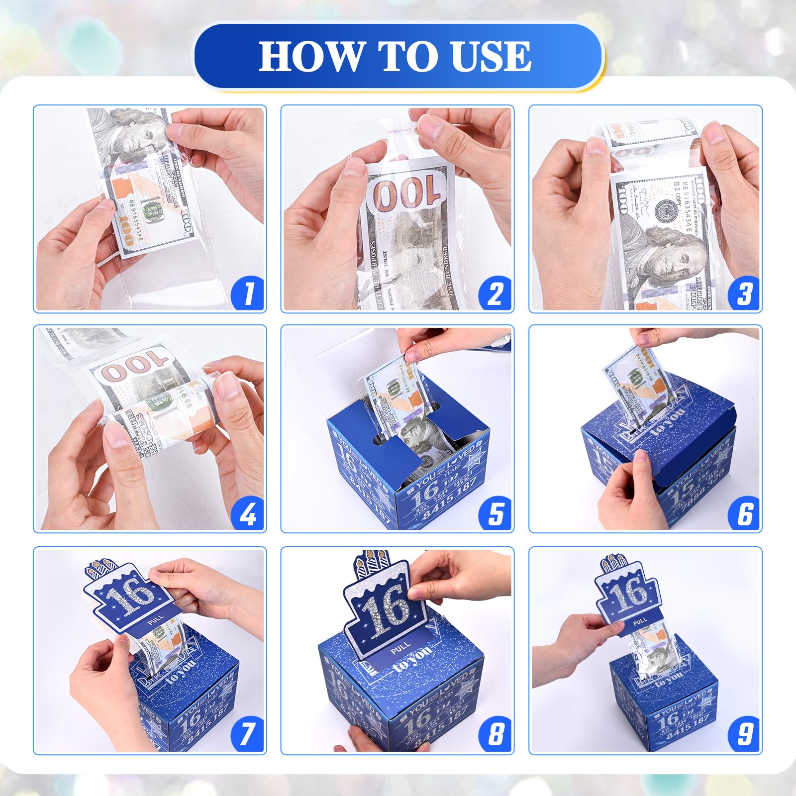 16 Year Old Boy Gifts Easy to Assemble : First, put the money in a plastic bag. Second, paste the plastic bag together. Third, roll up the money, put it in the box, and pull out one end of the plastic bag from the drawer slot to paste it with the birthday cake card. then One pull and the money will flow out.