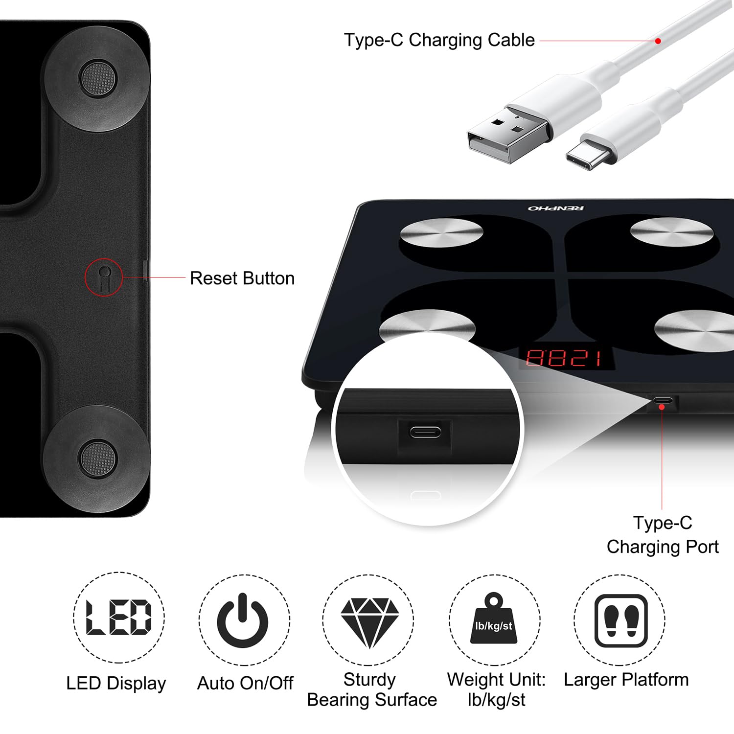 Type-C Rechargeable: RENPHO body fat monitor is built-in long lasting battery recharges through a Type-C cord. You can charge it with your power bank or AC adapter or laptop and so on
