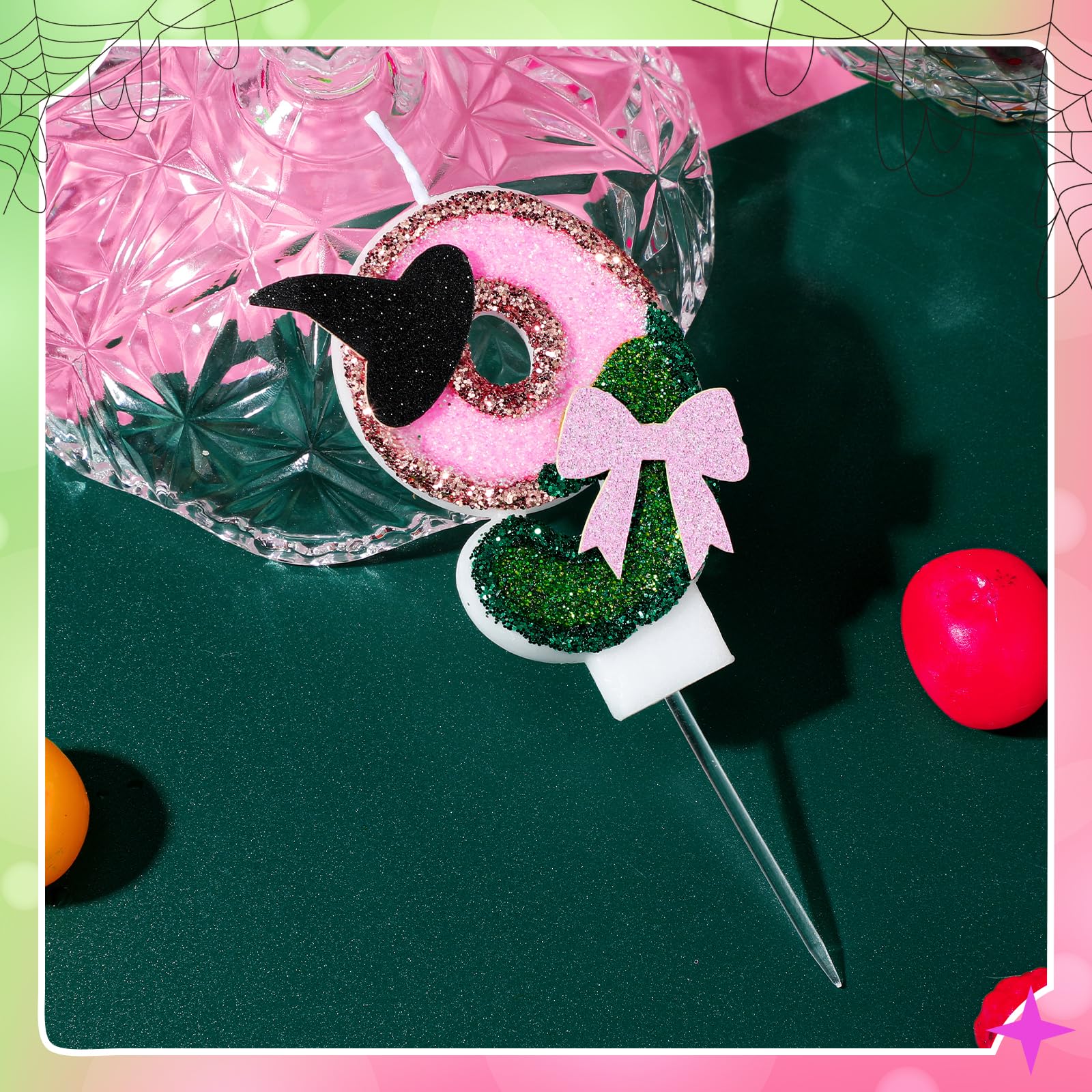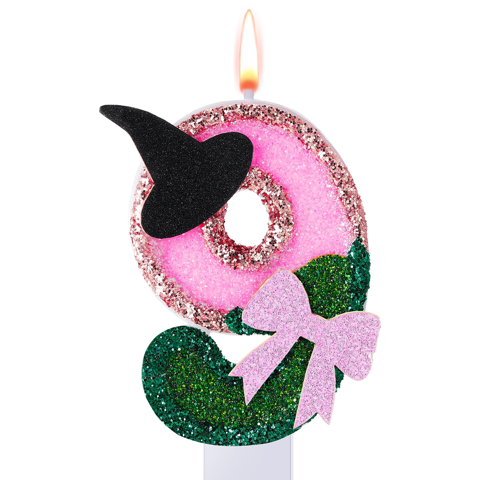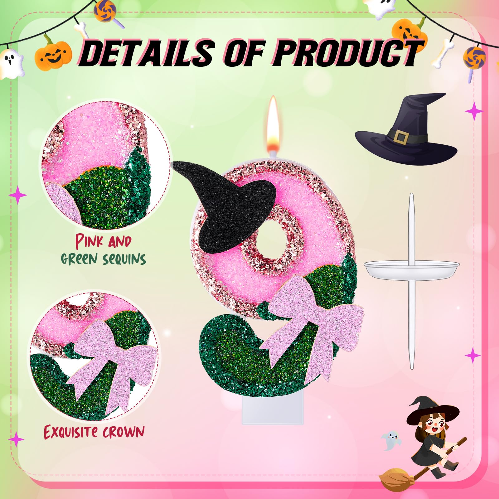 Witch Princess Theme Candle: this birthday number candle is designed in pink and green and decorated with a witch hat and bow to make your cake even more beautiful; Each candle is carefully crafted and includes a candlestick to keep your cake wax free