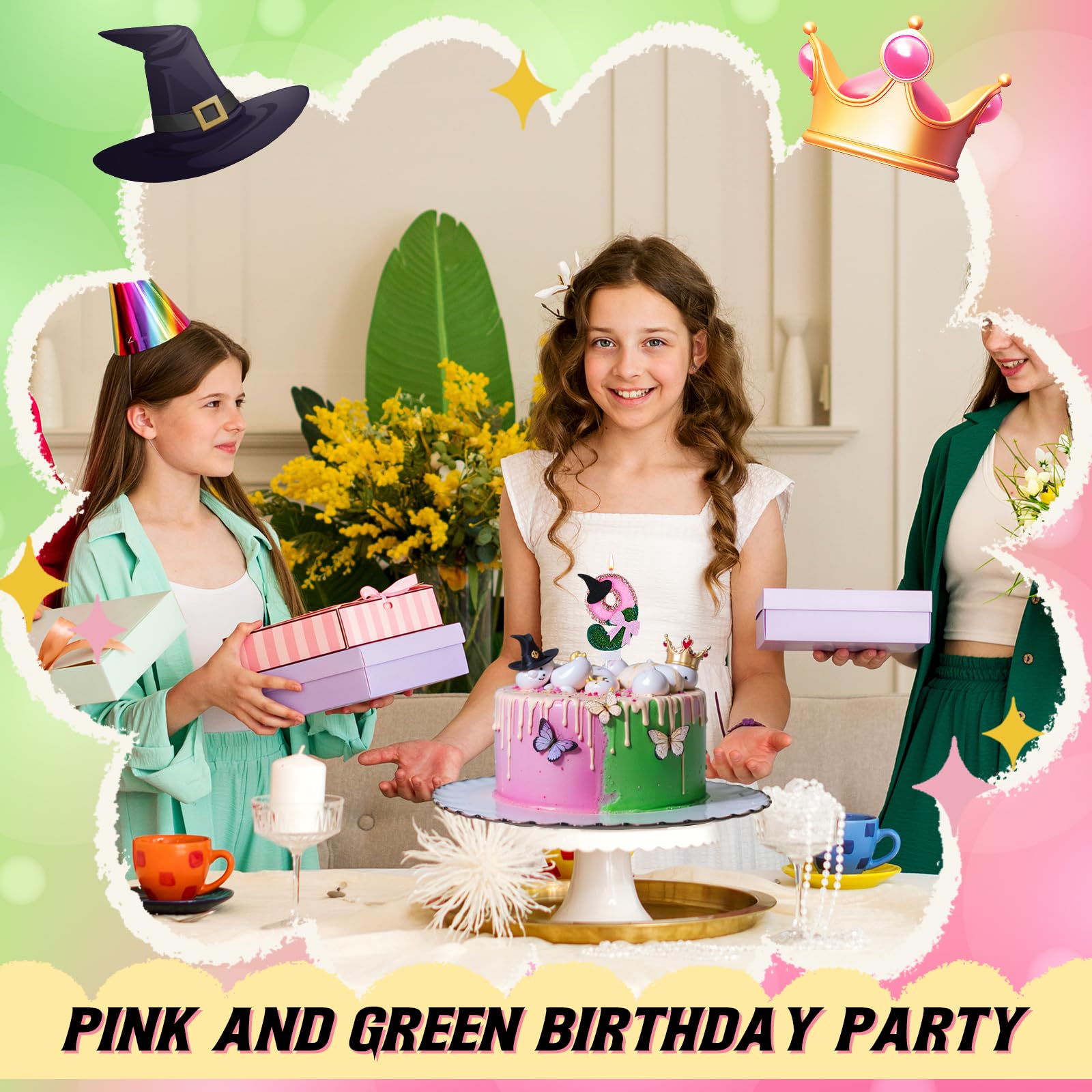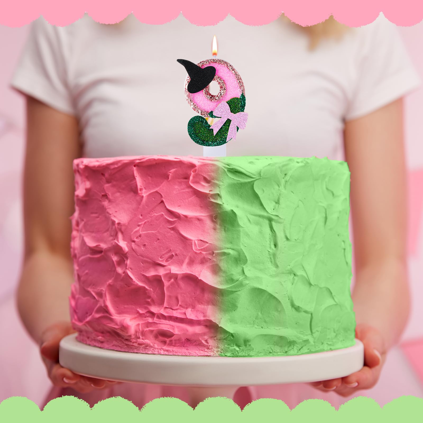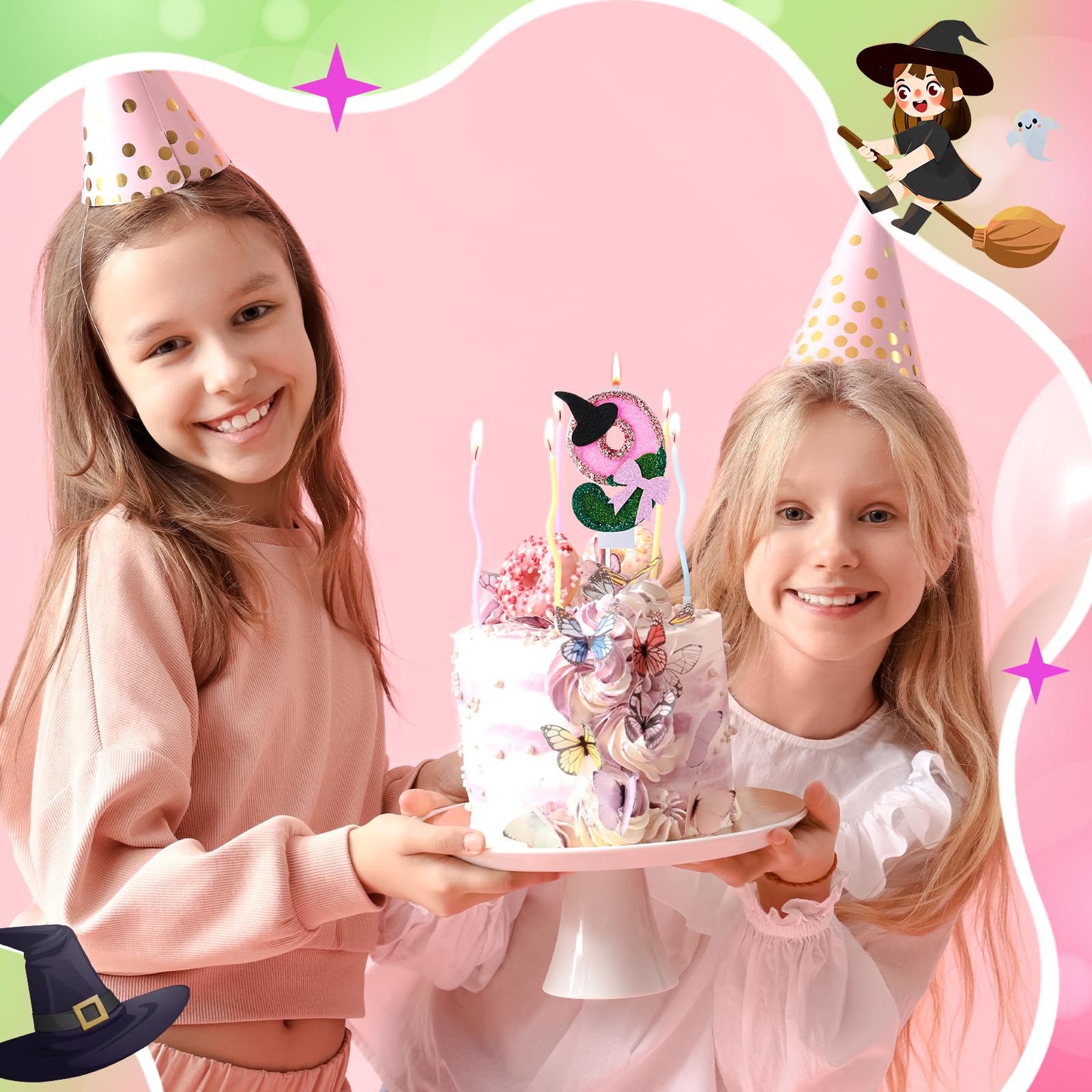 Witch Princess Theme Candle: this birthday number candle is designed in pink and green and decorated with a witch hat and bow to make your cake even more beautiful; Each candle is carefully crafted and includes a candlestick to keep your cake wax free