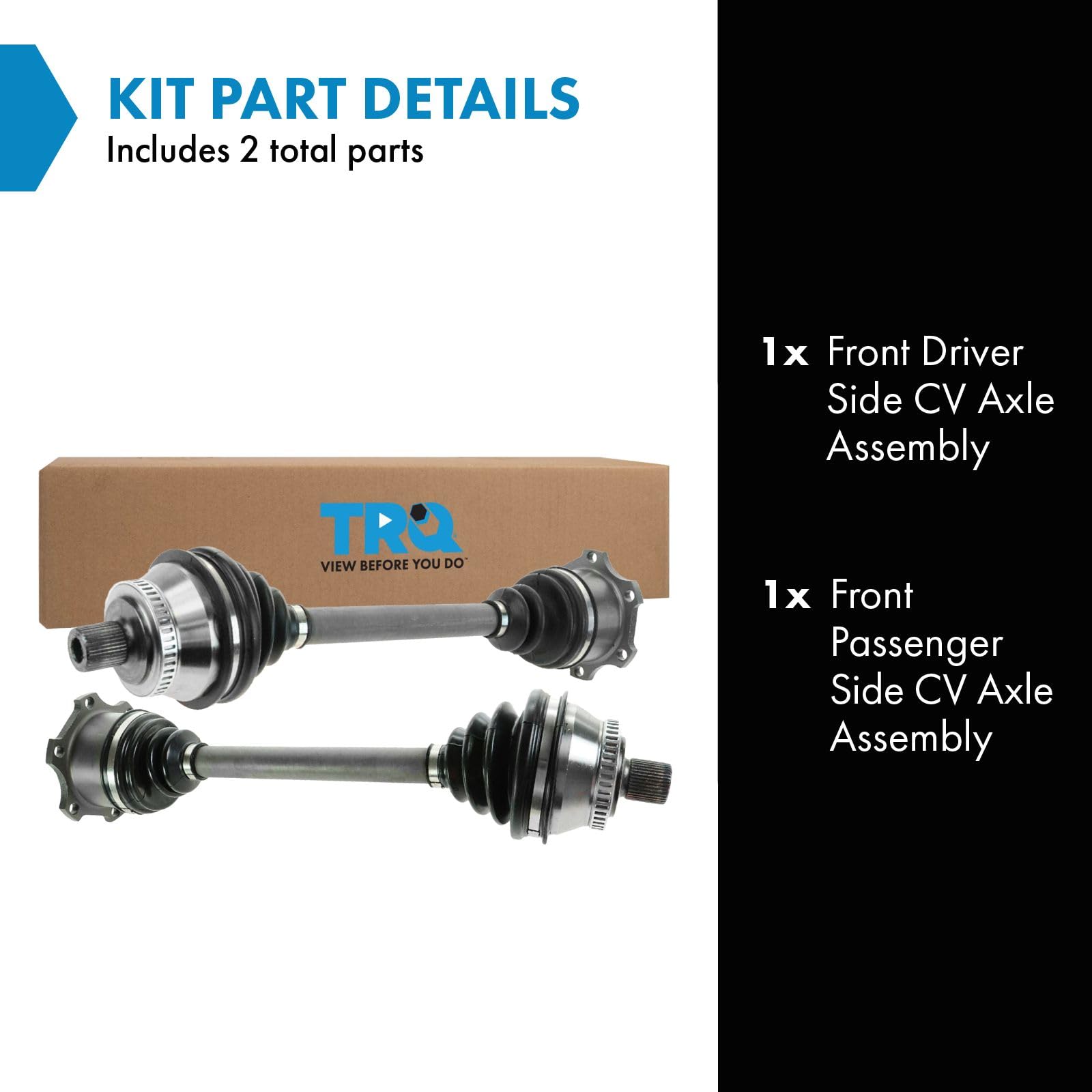 2 Piece CV Axle Assembly Set Kit Includes (1) Front Driver Side CV Axle Assembly (1) Front Passenger Side CV Axle Assembly Fitment Compatible with: 2002-05 VW Passat GLS Automatic Transmission Front Driver & Passenger Side Compatible with: 2002-05 VW Passat GLX Automatic Transmission Front Driver & Passenger Side Compatible with: 2003-05 VW Passat GL Automatic Transmission Front Driver & Passenger Side Compatible with: 2003-04 VW Passat W8 Automatic Transmission Front Driver & Passenger Side Compatible with: 2004-05 VW Passat GLS TDI Automatic Transmission Front Driver & Passenger Side Compatible with: 2004-05 VW Passat GL TDI Automatic Transmission Front Driver & Passenger Side Compatible with: 1999-00 VW Passat V6 2.8L Front Wheel Drive Automatic Transmission Front Driver & Passenger Side Compatible with: 2001 VW Passat GLX V6 2.8L Automatic Transmission Front Driver & Passenger Side Compatible with: 2001 VW Passat GLS V6 2.8L Automatic Transmission Front Driver & Passenger Side Compatible with: 2000-02 Audi S4 Automatic Transmission Front Driver & Passenger Side Compatible with: 1997-00 Audi A4 V6 2.8L Automatic Transmission Front Driver & Passenger Side Compatible with: 1998 VW Passat V6 2.8L Automatic Transmission Front Driver & Passenger Side Compatible with: 2001 Audi A4 Automatic Transmission Front Driver & Passenger Side Compatible with: 1996 Audi A4 Automatic Transmission Front Driver & Passenger Side Product Attributes Quantity: 2 Piece Product Features 100% New: Manufactured to tighter tolerances for extended service life Neoprene Boots: Improved durability compared to stock material Moly Greased: Specifically-designed grease shield to reduce premature wear Application Specific Design: No modification Item Details TRQ CV (constant velocity) drive axles are manufactured using premium raw materials designed to restore original performance. TRQ CV drive axles are new, so there is no core charge with your TRQ purchase. TRQ-designed drive axles utilize neoprene boots, moly grease, stainless steel clamps, and heat-treated ball tracks to ensure extended service life. Each TRQ axle is application-specific so each spline and thread will mate properly for a seamless fit. All products are fit and road-tested in our Massachusetts R&D facility to ensure we deliver on our promise of Trusted Reliable Quality. Reference Numbers 66-7240 66-7241 667240 667241 8D0407271AL 8D0407271BC 8D0407271ED 8D0407272AL 8D0407272BC 8D0407272ED 8D0407451JX 8D0407452JX 8D0407454EX AD8006 AD8007 CSA82176 CSA82180 NCV23575 NCV23576