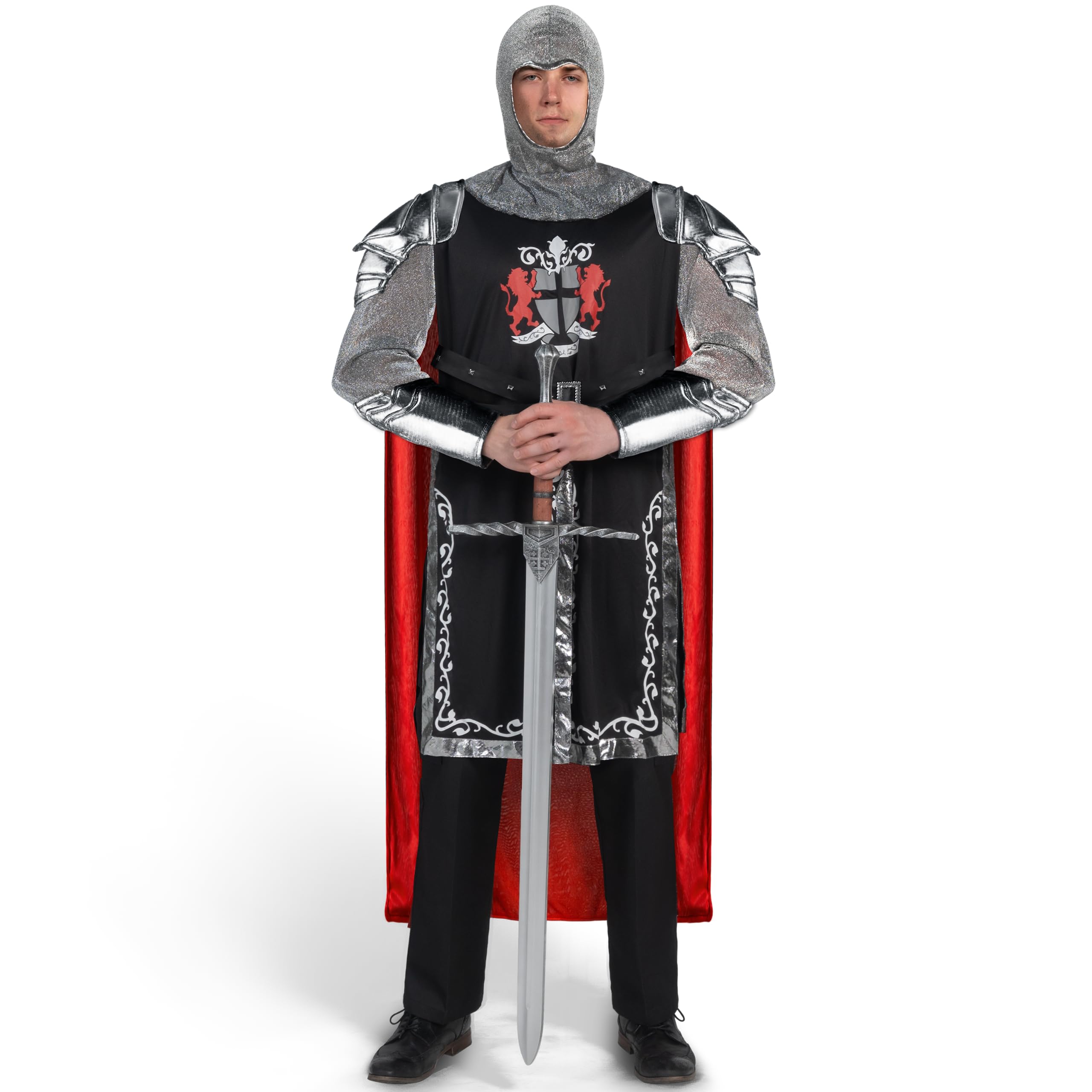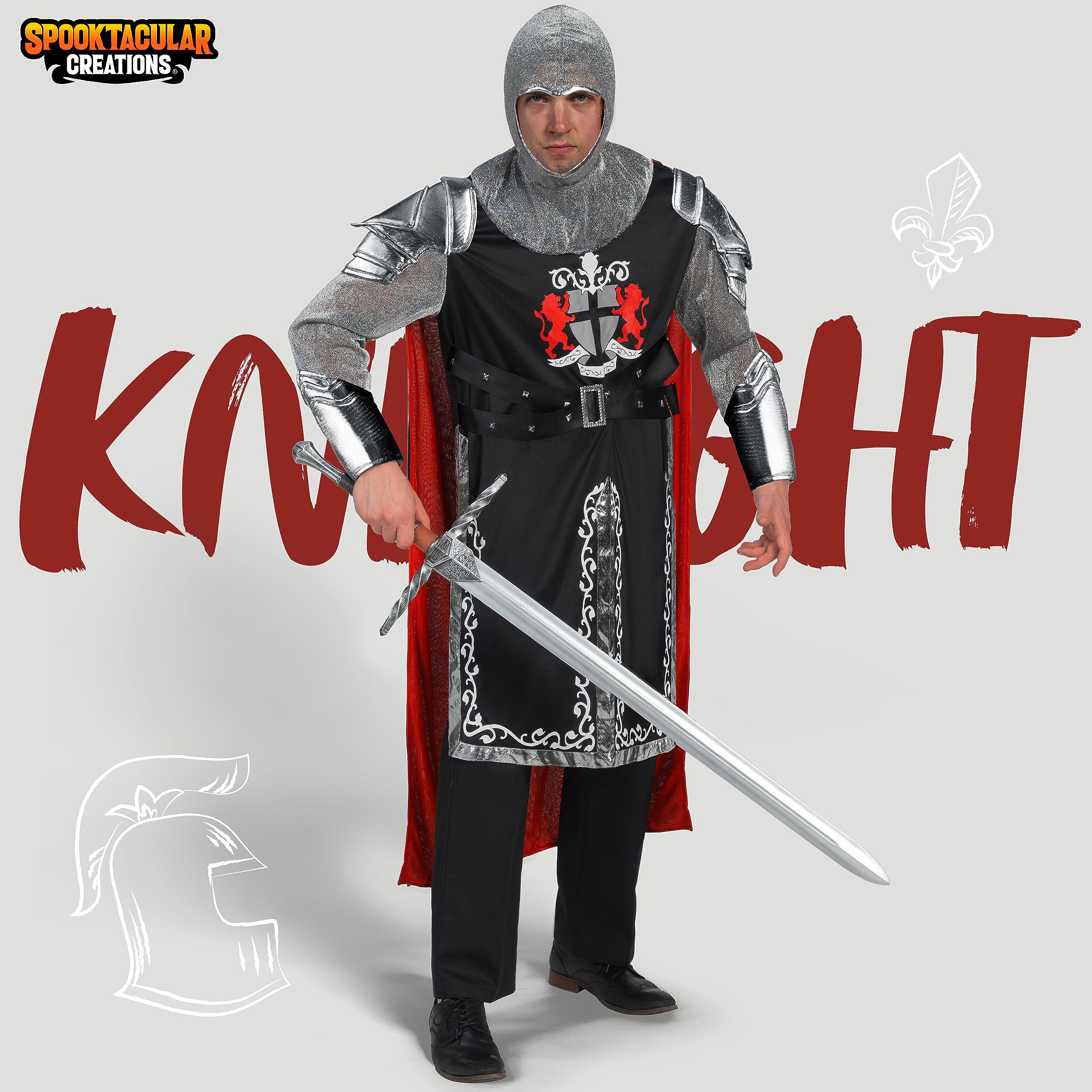 Description Spooktacular Creations Black Men‘s Knight Armor Cape Tunic Hood Set, Adult Costume Collection, Dragon Knight Costume for Halloween Dress Up Cosplay PartySUPER VALUE PACK: This Medieval Knight Costume Deluxe Set includes 1 Cape, 1 Tunic, 1 Hood and 1 Belt, including everything you need to become a Medieval KnightPREMIUM QUALITY: This Renaissance Costume is Super Durable and made with Higher Quality. Made of high-quality 100% polyester material, this Costume ensures Maximum Comfort and Ease for those who aim to be Fierce and Unique in this Halloween seasonSPECIAL OCCASIONS: Ideal for Halloween Dress-Ups, Halloween Costume Parties, Trick or Treat/Christmas/New Year/Easter Events, Cosplay Parties, Themed Parties, Stage Performances, Parade and Role Play, this Medieval Knight Costume is Perfect for any occasionEASY TO CLEAN: To keep your Knight Costume Clean and Fresh, we recommend Sponge Cleaning or Hand Washing. Do Not brighten, Tumble Dry, or IronSIZES & PERFECT DESIGN: This Halloween Knight Costume is available in Small, Medium, Large, X-Large, XX-Large, which can fit all body types. Designed with a Realistic Chainmail Hood and Cape, this Knight Costume Set brings out the Medieval Knight Majestic vibe