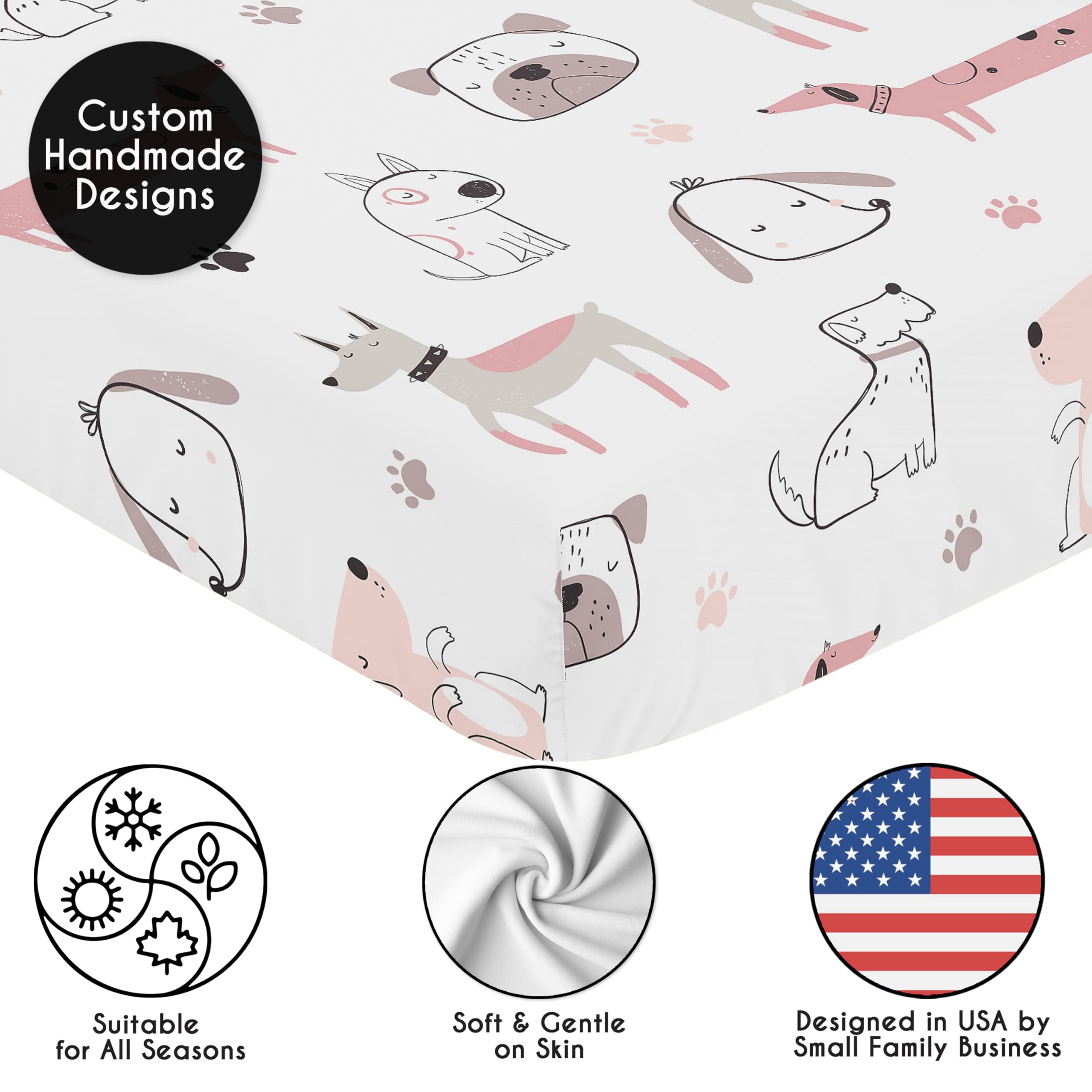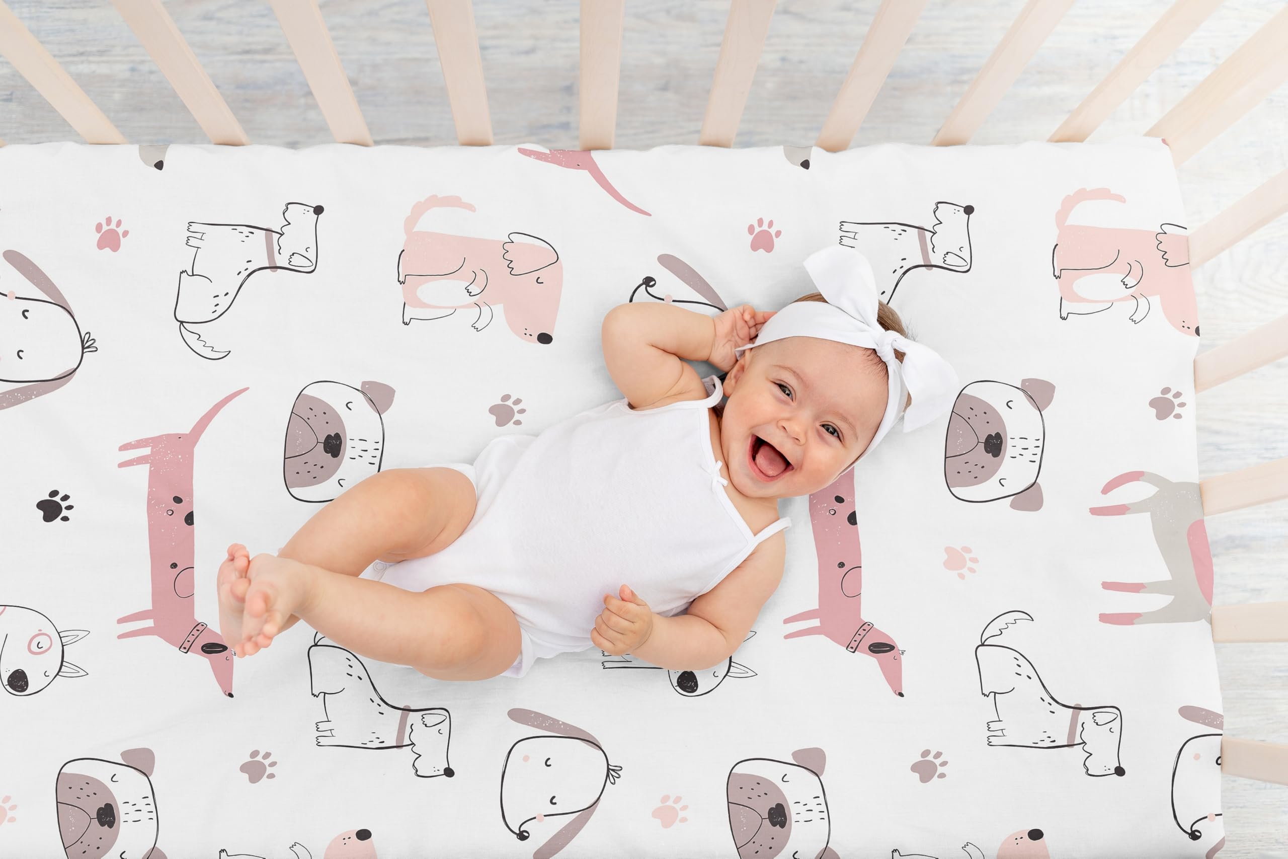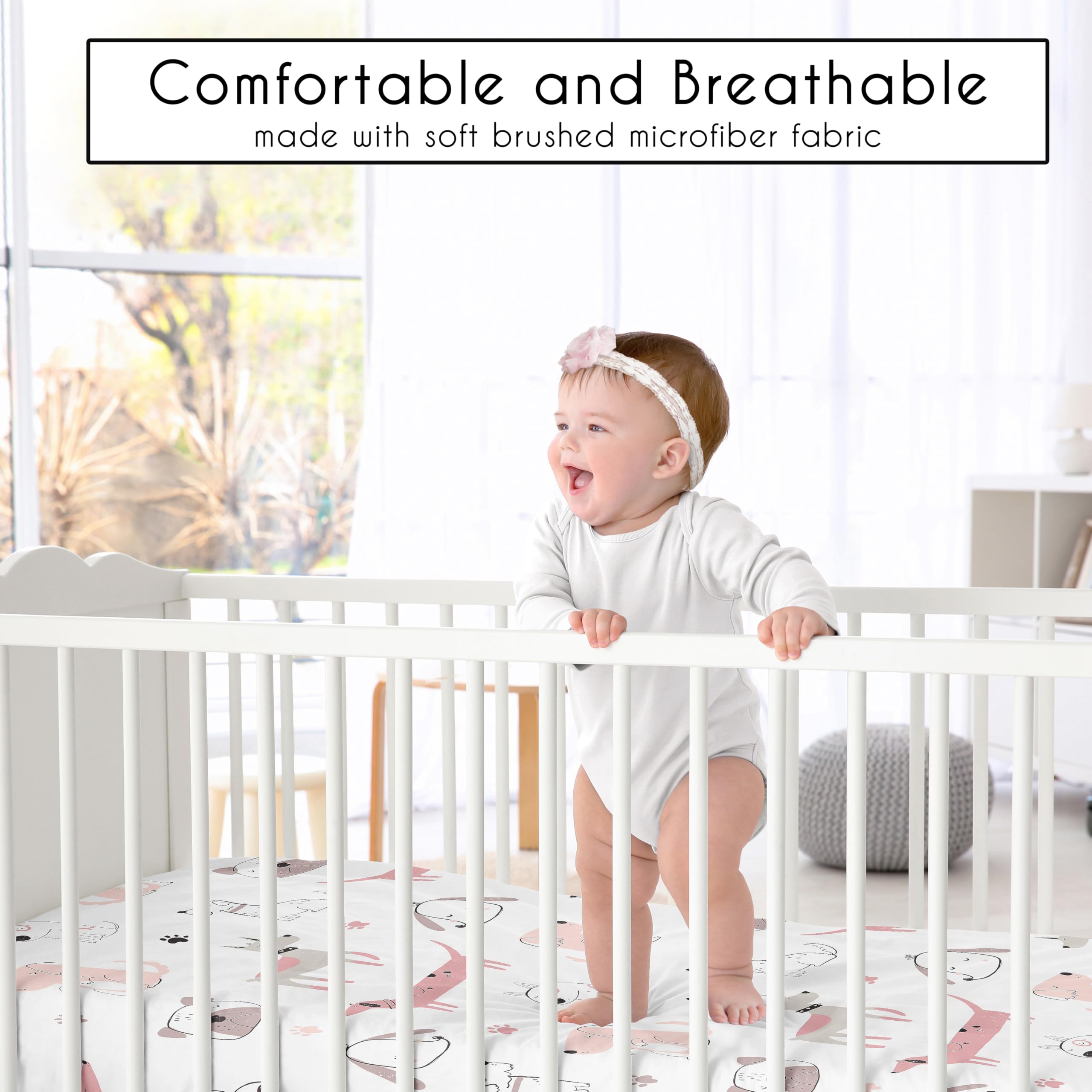 SNUG FIT: Includes (1) Fitted Crib Sheet 52in. x 28in. x 8in. Our newborn standard crib sheets fit snugly, with premium elastic sewn around the entire bottom edge for a secure fit on most standard sized cribs and toddler beds, to reduce shifting and bunching. This brushed microfiber crib sheet features an exclusive trendy design of a modern cartoon illustration style pastel pink and grey dogs, puppies and doggy dog print and is gentle on delicate skin to foster a soothing sleep environment.