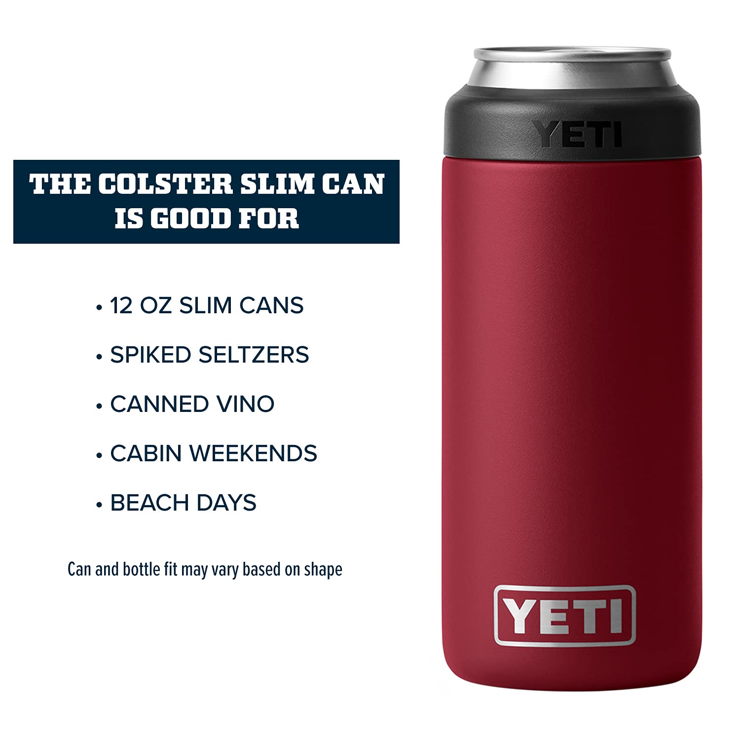 The YETI Slim Colster is good for: 12 oz Slim Cans, Spiked Seltzers, Canned Vino, Cabin Weekends and Beach Days. Can and bottle fit may vary based on shape