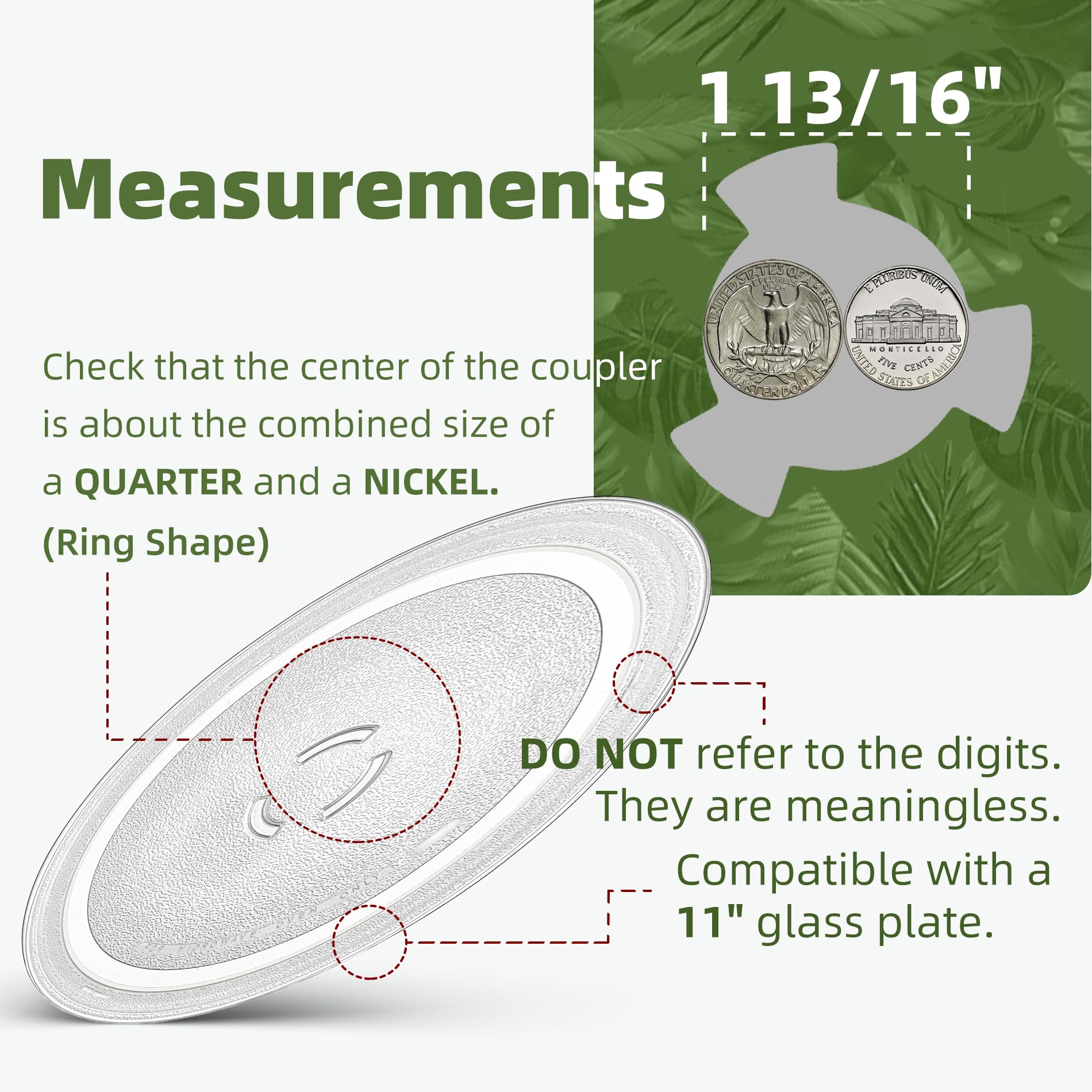 【Measurement 1】This 11 in microwave glass turntable plate has a one-quarter and one-Nickel sized ring shape hole in the center. The center spot of microwave glass turntable coupler measures 1 13/16" in diameter