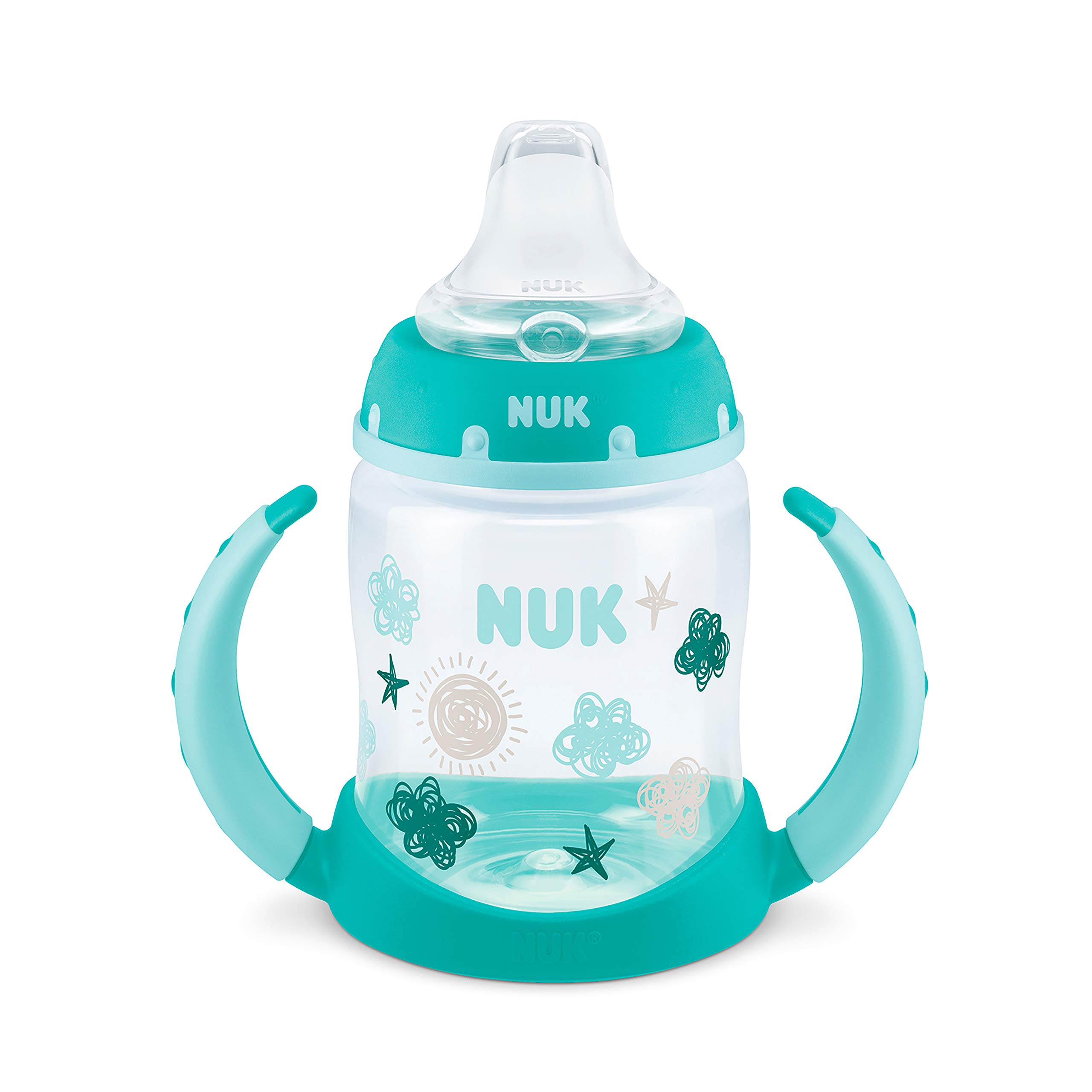 The NUK Learner Cup easily promotes baby’s transition from breast or bottle to sippy cup. This Learner Cup features a spill-proof soft spout that is gentle on teeth and gums, and it includes an air vent that helps reduce swallowed air. The cup also comes with easy-to-grip, removable handles that your growing child will love. NUK Learner Cups are BPA free and dishwasher safe. Our 5 oz Learner cups are recommended for ages 6m+.