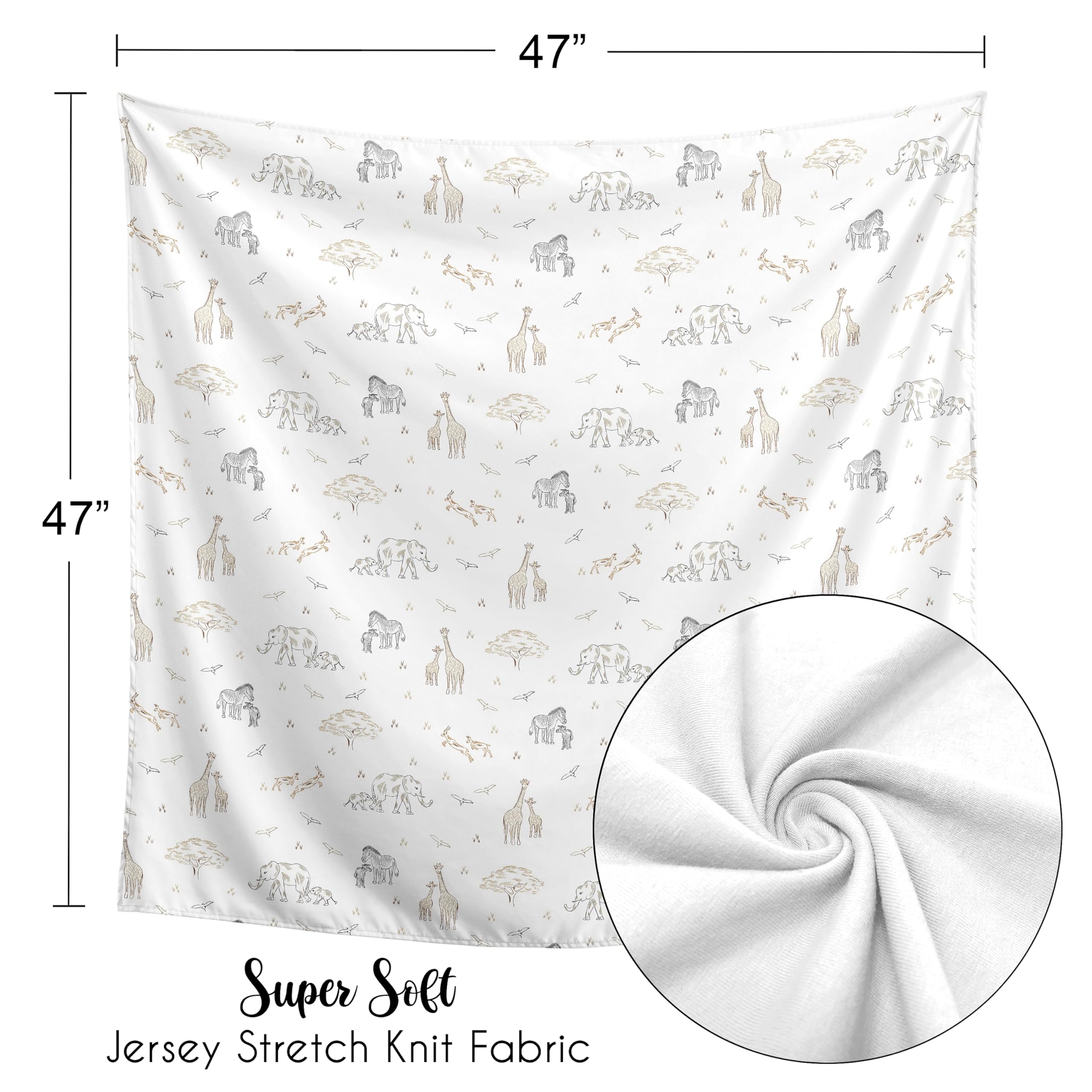 95% Rayon/5% Spandex Jersey Stretch Knit featuring taupe, tan, beige, brown, black and white animal elephant giraffe zebra elephants wildlife adventure serengeti jungle safari animals print