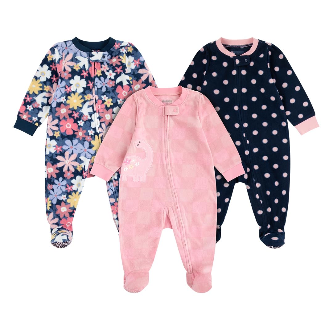 Description Designed by the baby experts at Huggies, this 3-pack of sleep coveralls are made of breathable, soft-knit fabrics so you can sleep in style, baby! The two-way zipper makes late-night diaper changes a breeze, and a super comfy snap guard gives your child a cozy, secure fit. Elasticized, footed bottoms keep tiny toes warm all night, and silicone grips give your toddler an extra boost when they are on the move. With three adorable prints to choose from, this 3-pack wraps littles in comfort and cuteness!
