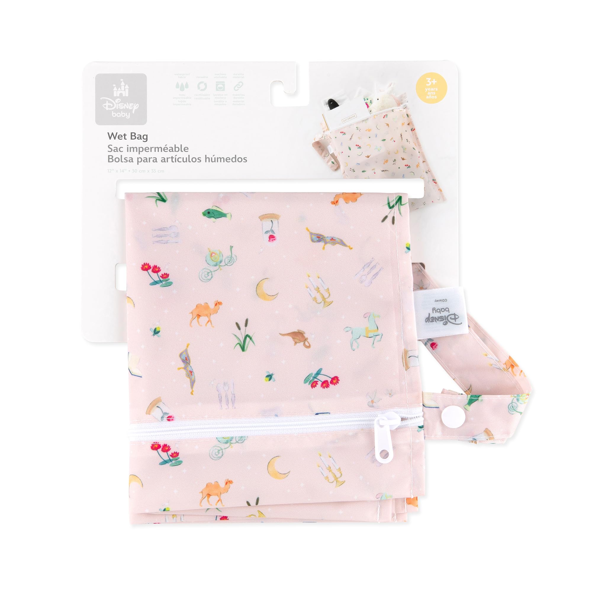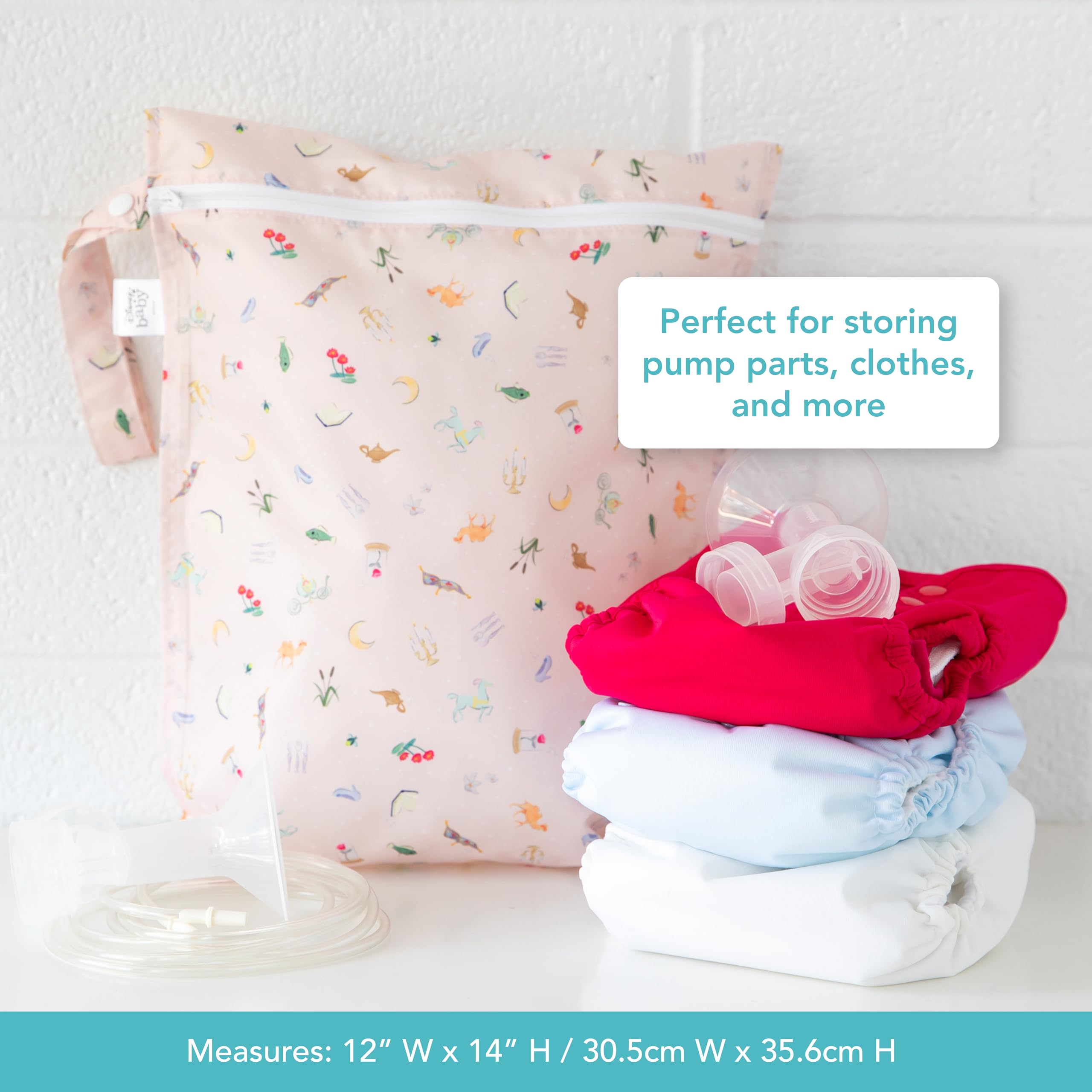 This bag is a fairytale come to life when it comes to containing messy clothes. It’s a better alternative to single-use plastic bags; made from Bumkins’ signature easy-wipe waterproof fabric – 100% polyester embedded with TPU. Our bags feature heat-sealed seams for true waterproof protection. A smooth zipper closure locks away the mess. Wet bags are great for carrying diapers, dirty gym clothes and wet swimsuits. Not just for wet stuff - these bags make excellent organizers for toys, accessories, toiletries, electronics, travel and more! With a snap handle, snap your bag wherever you need it - stroller, changing table or suitcase. Machine washable. Measures 12"x14". Fits approximately 6 cloth diapers. Bags are single compartment, non-gusseted, non-insulated and non-stretch. Designed in Arizona, responsibly made in China.