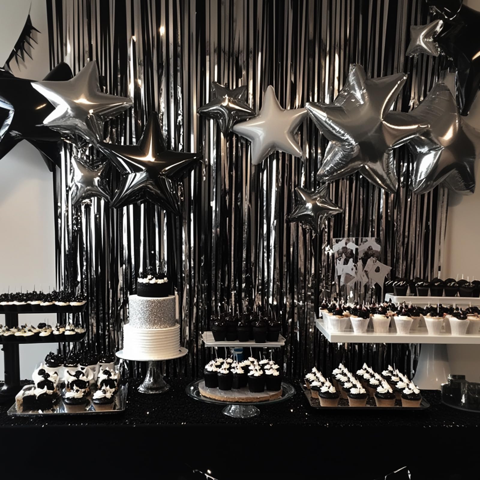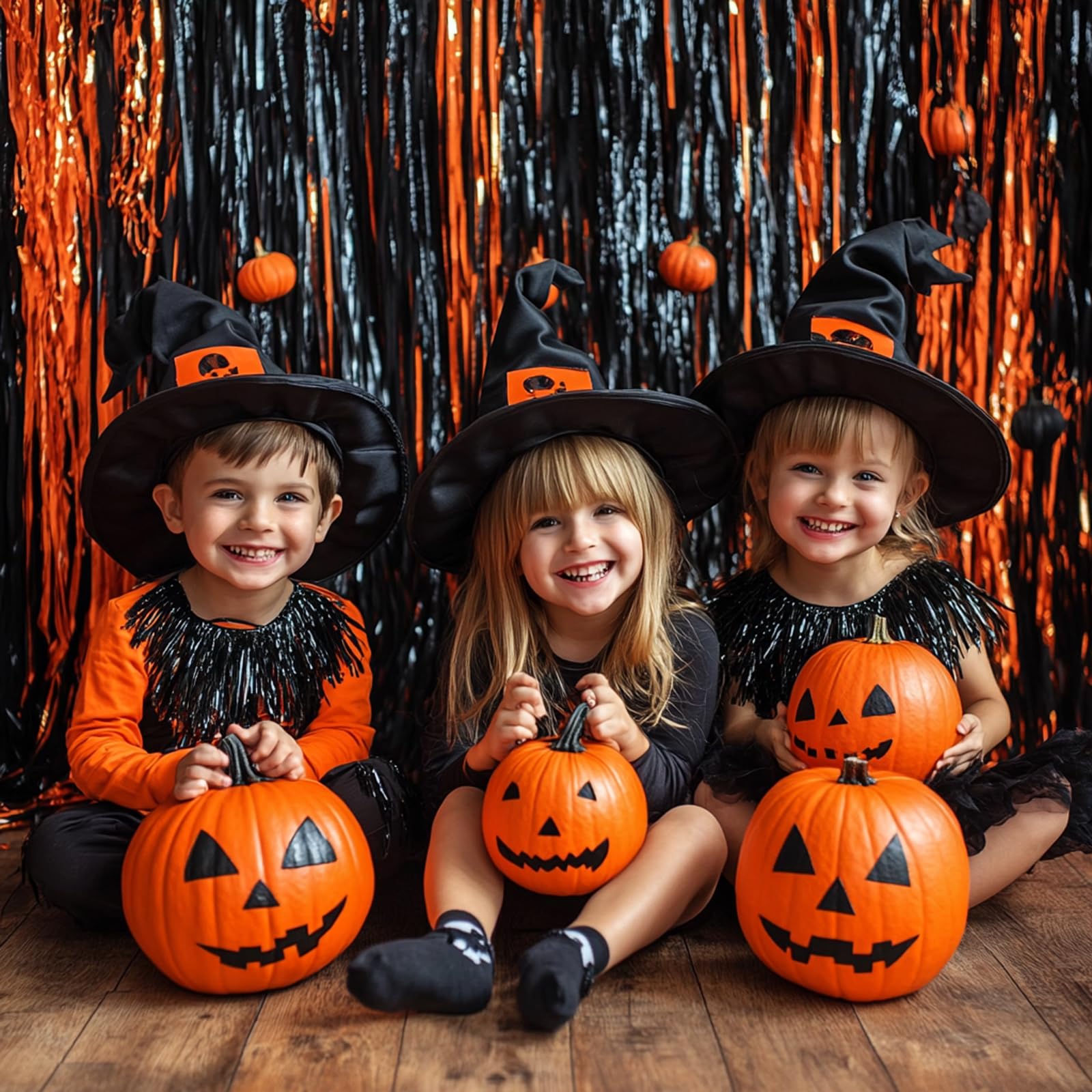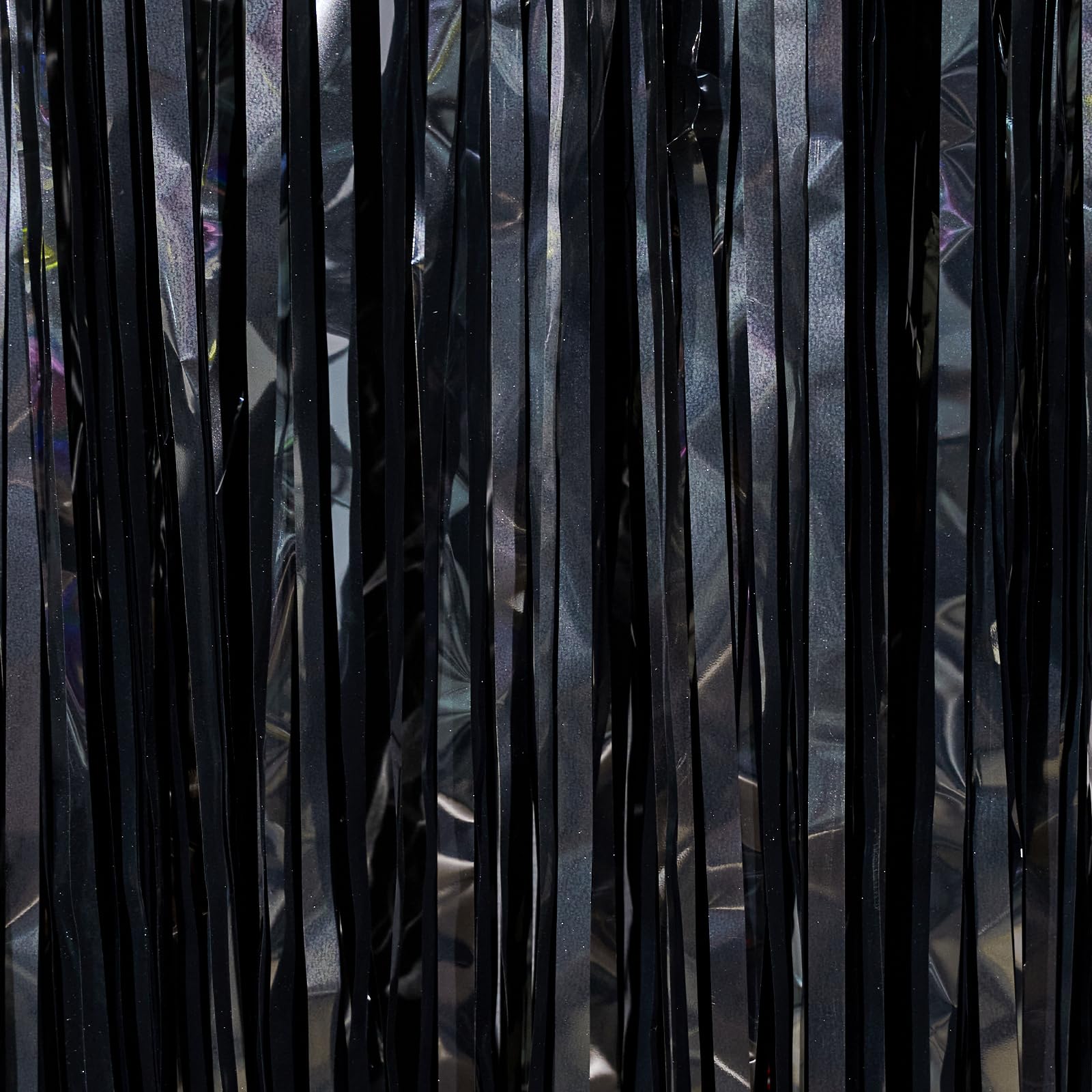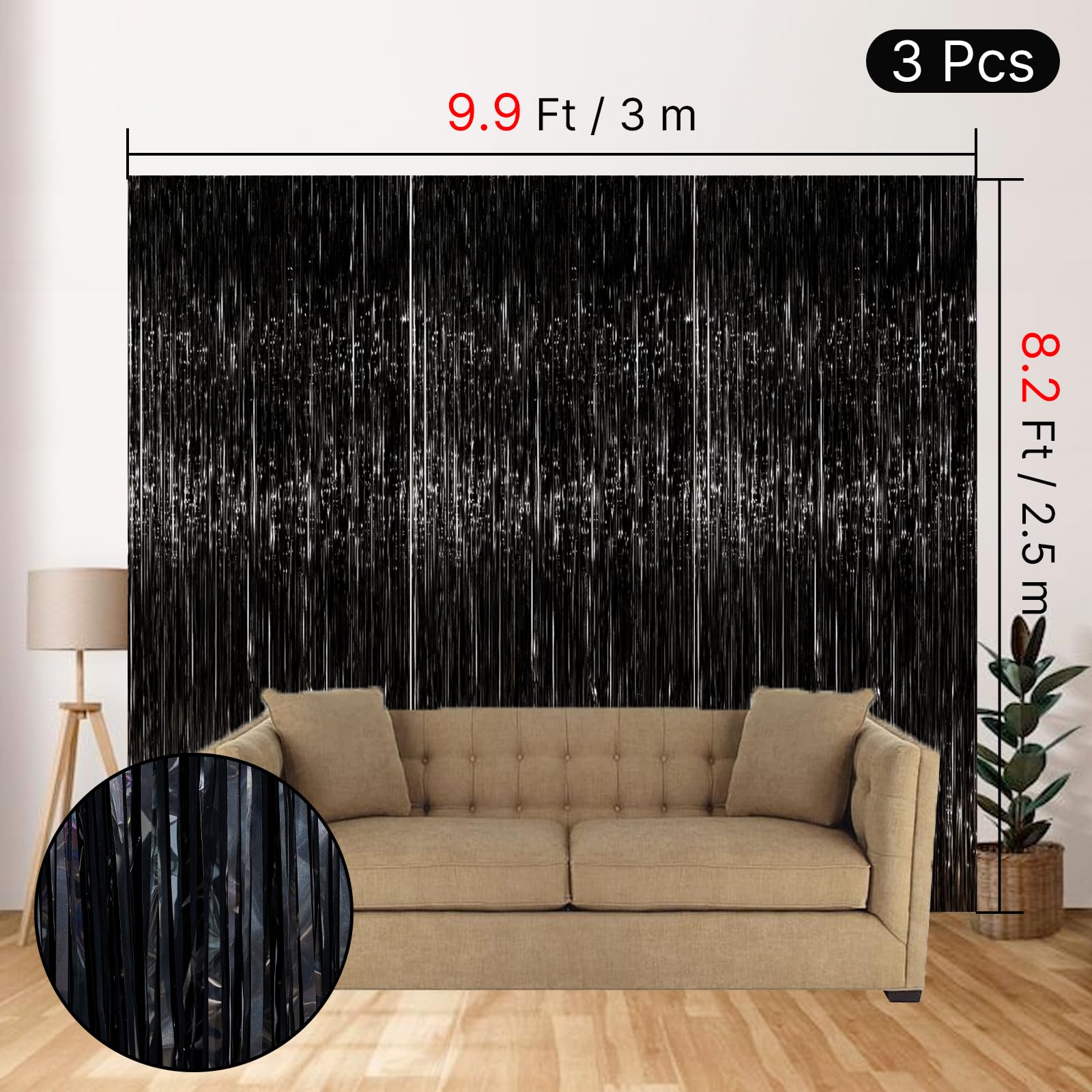 Dimensions and Coverage: 3 pcs black foil fringe curtain with size and coverage [8.2×3.3 ft,total 27 sq ft], black tinsel backdrop, vacuum compressed storage, walls, doorways, stages for dark theme events, like Halloween and Gothic birthday