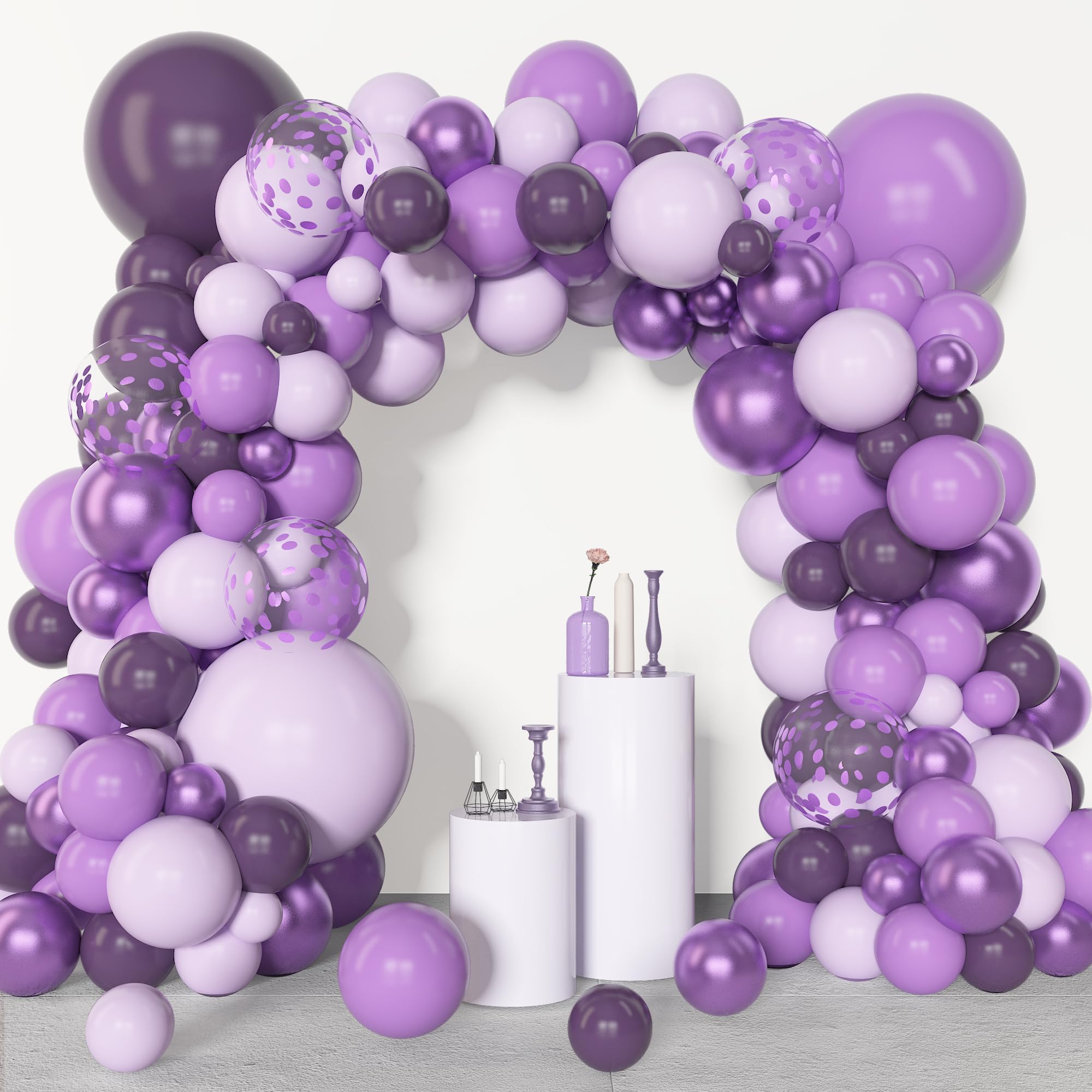 Sufficient Quantity of Purple Balloons: The purple balloon arch kit includes 18” dark purple/lavender/light purple balloons(3 pcs), 12” dark purple/lavender/light purple/metallic purple/confetti purple balloons(25 pcs), 10” dark purple/ lavender/light purple/metallic purple balloons(50 pcs), 5” dark purple/lavender/light purple/metallic purple balloons (65 pcs) and 10 pcs balloon tools(balloon arch strips, tying tool, 100 glue points, ribbon, flower balloon clip, hook)