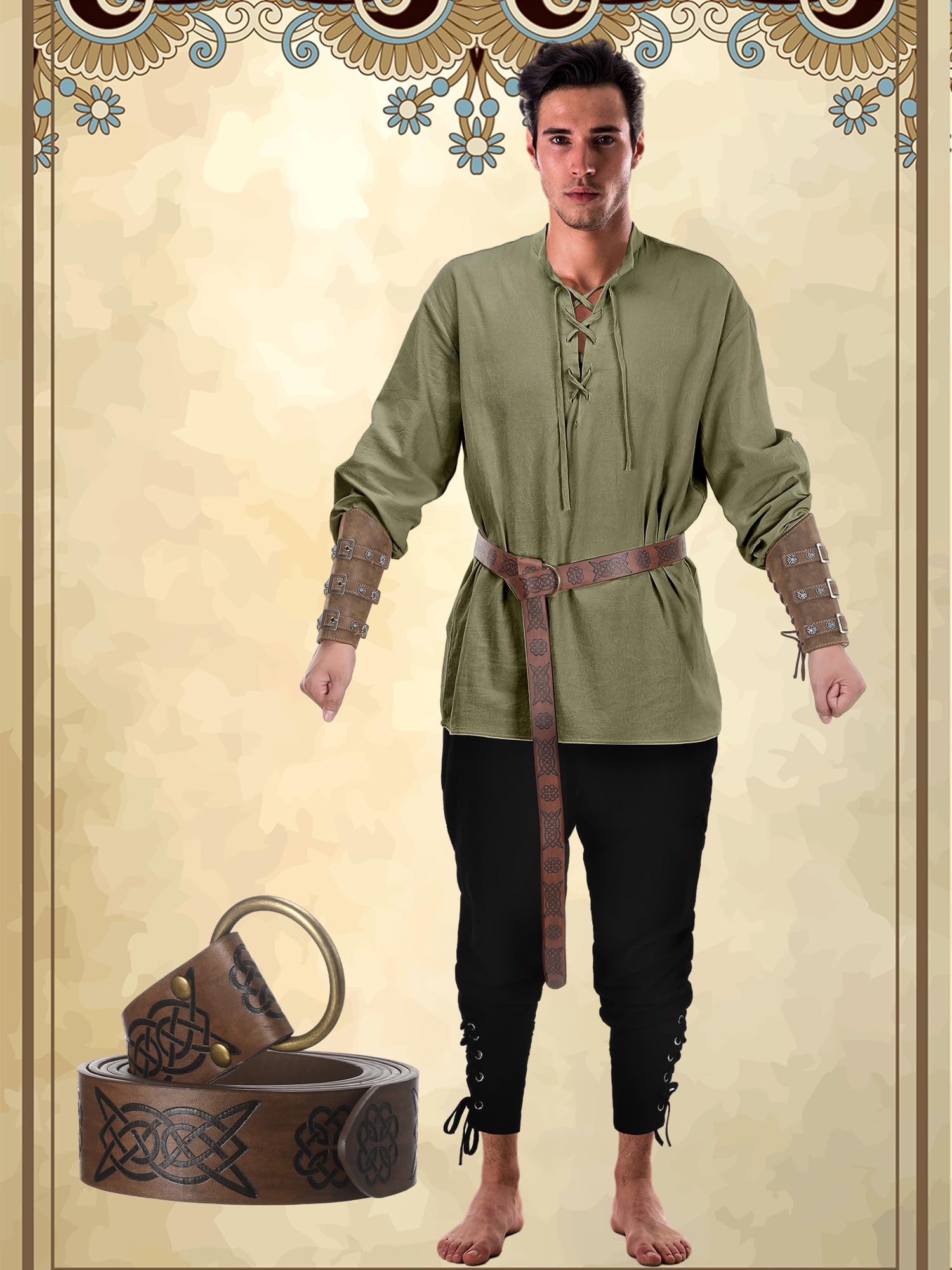 Nice Combination: the set includes 1 cotton retro style lace long sleeve shirt for medieval, 1 pair of renaissance gothic trousers, 1 medieval knight's belt and 1 pair of leather buckle wrist guards, nice for Halloween cosplay party