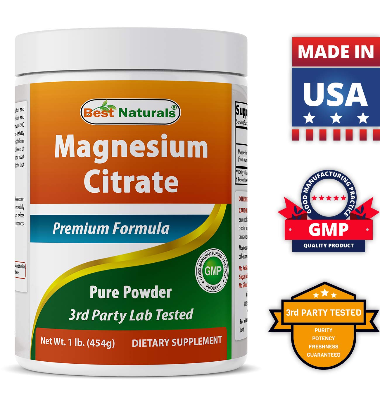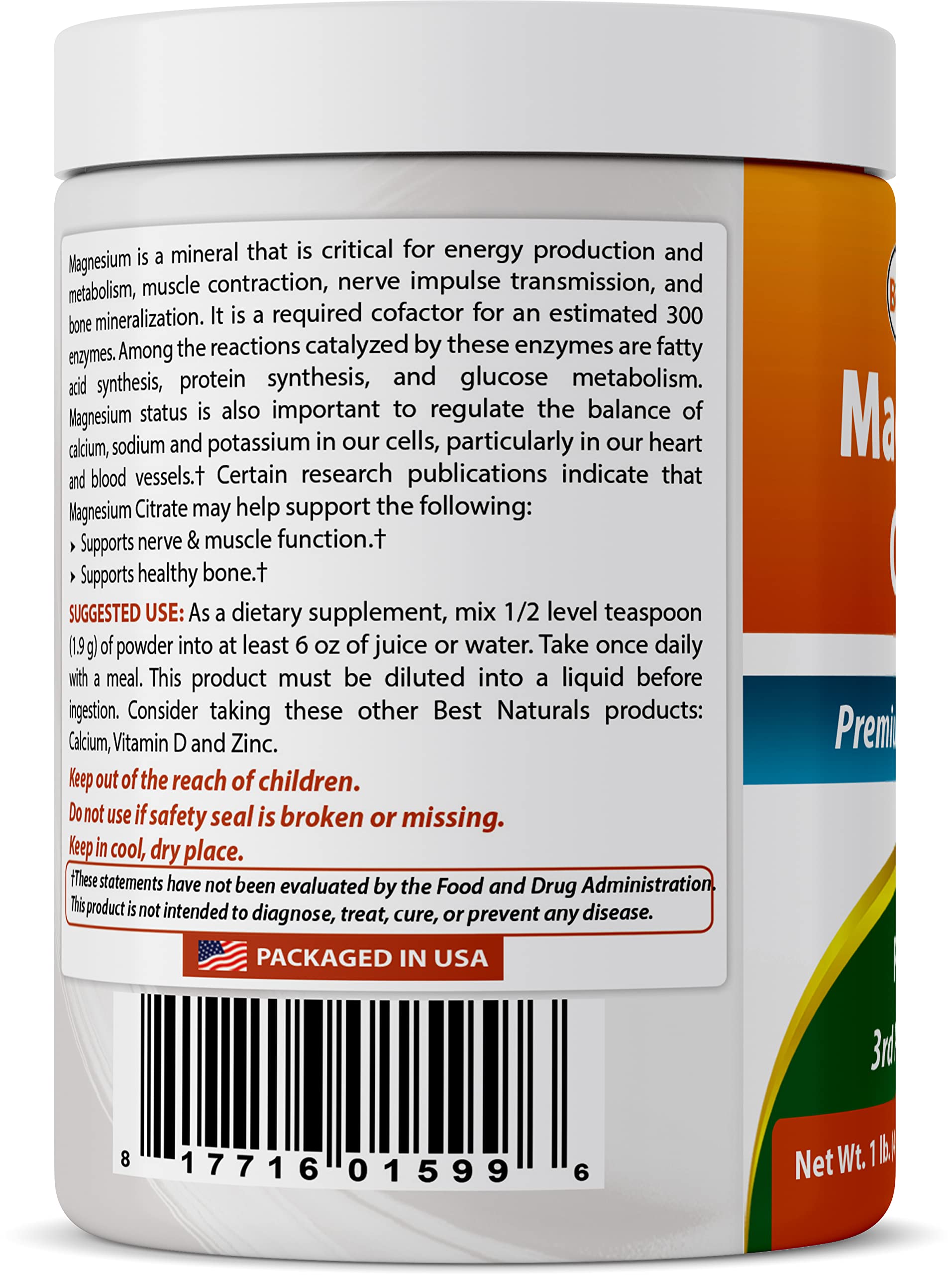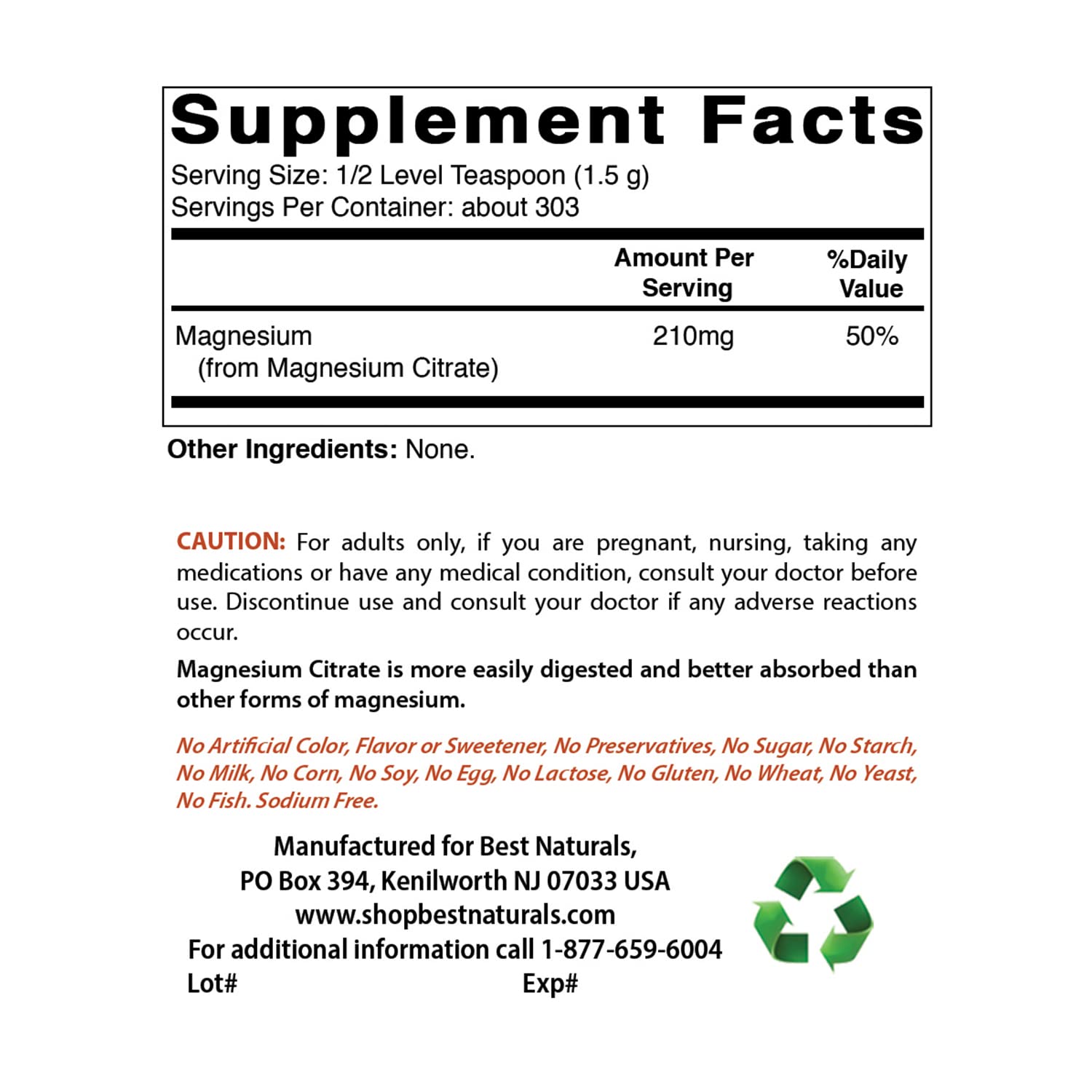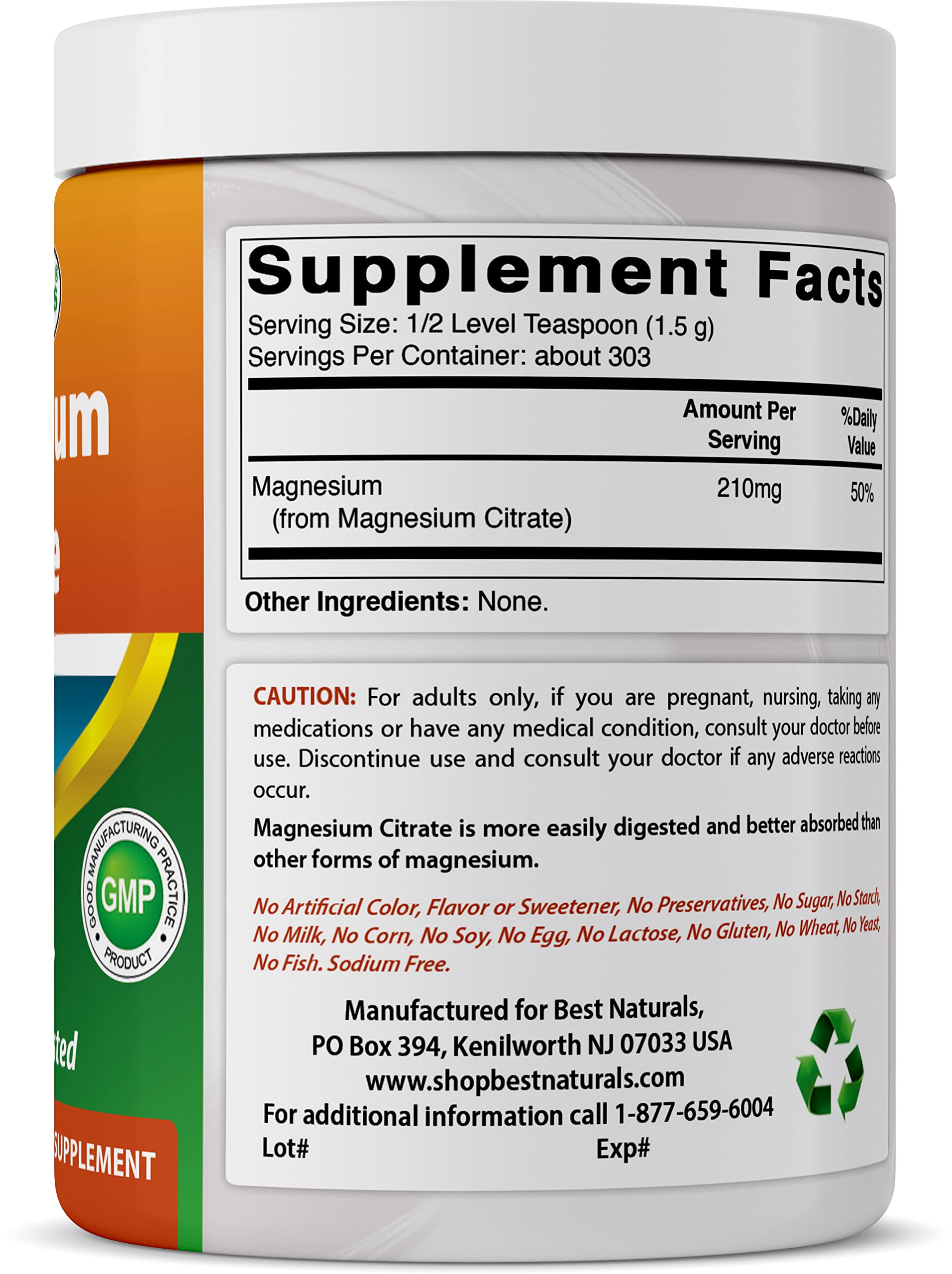 ½ Level Teaspoon (1.5 g) of Magnesium Citrate per Serving, 303 Servings per bottle.