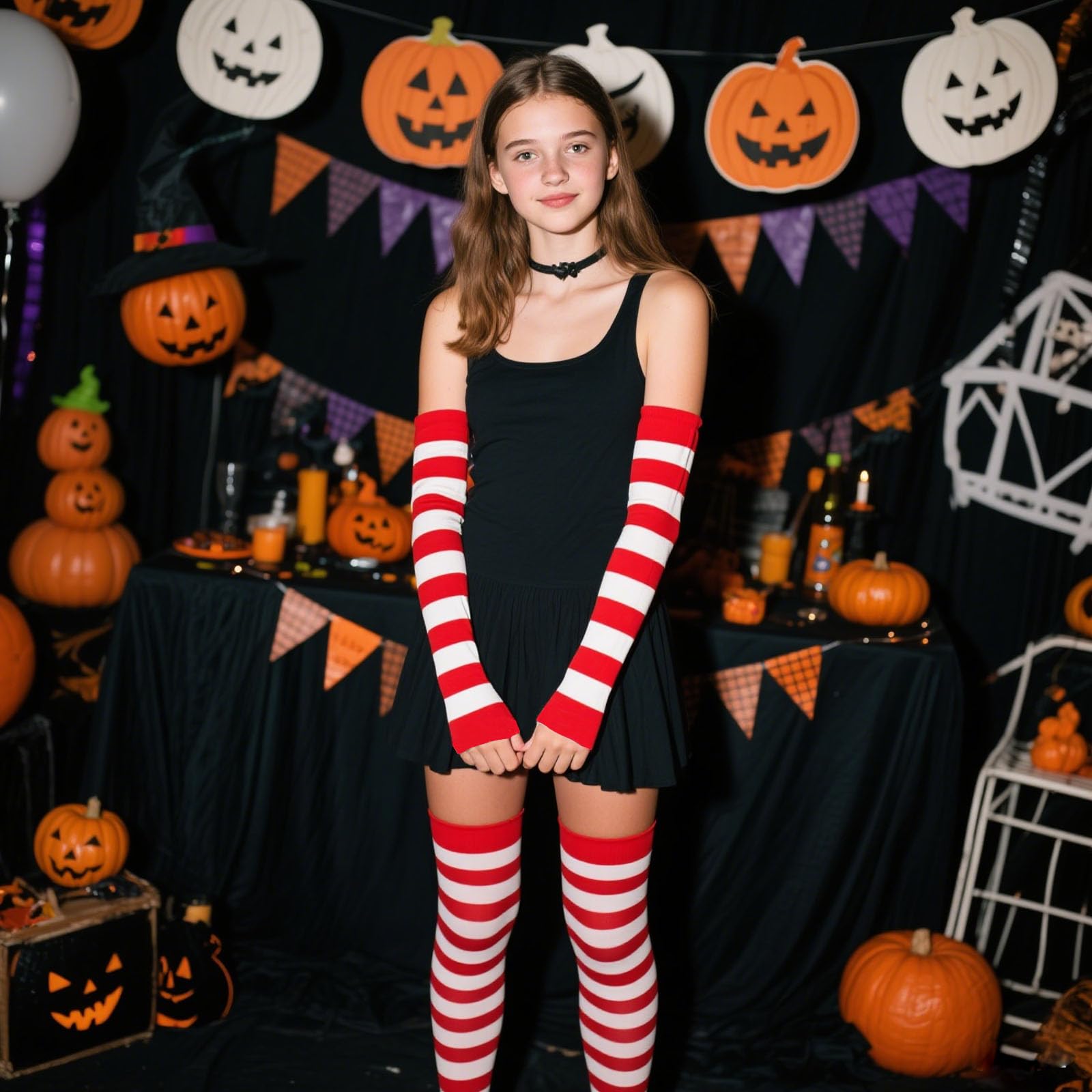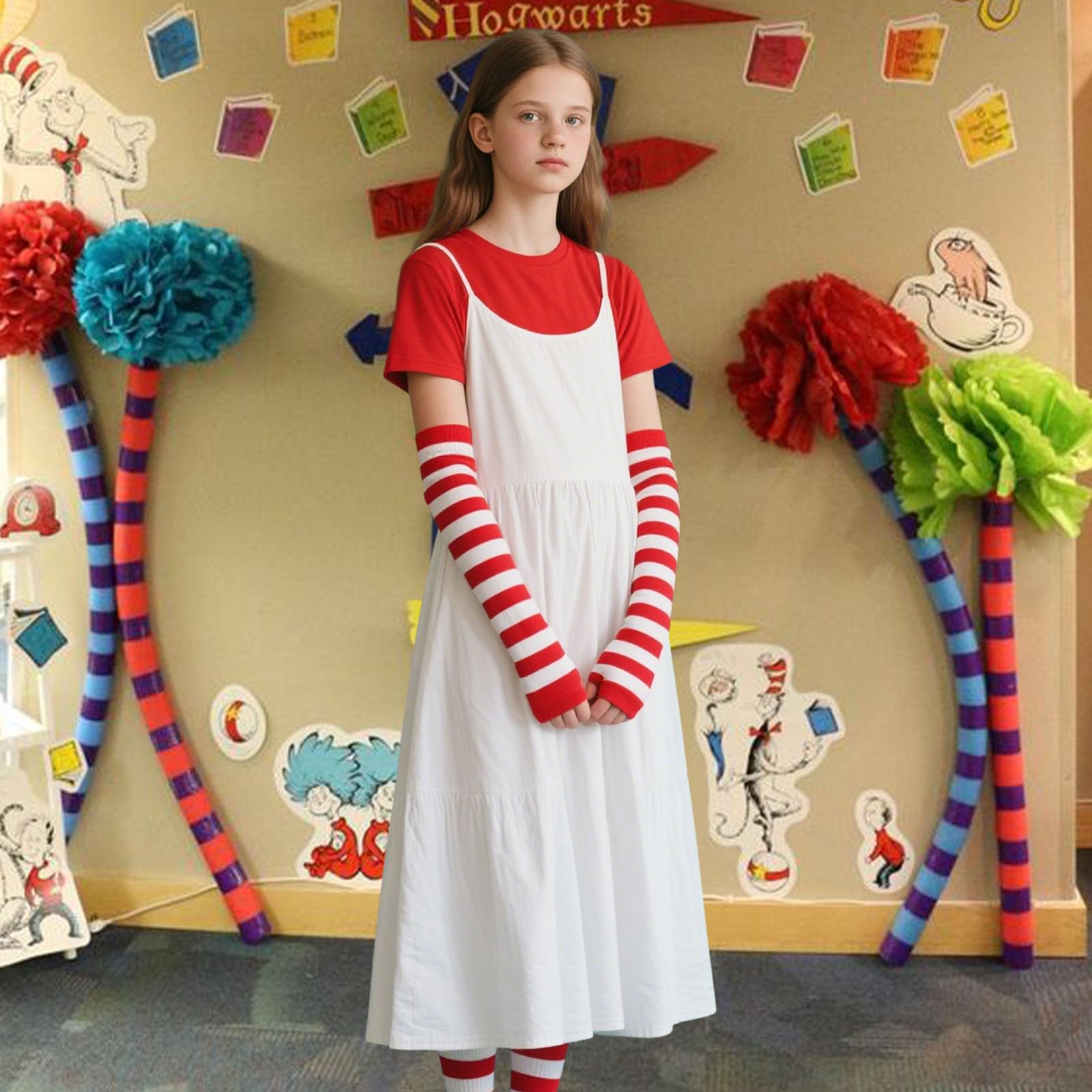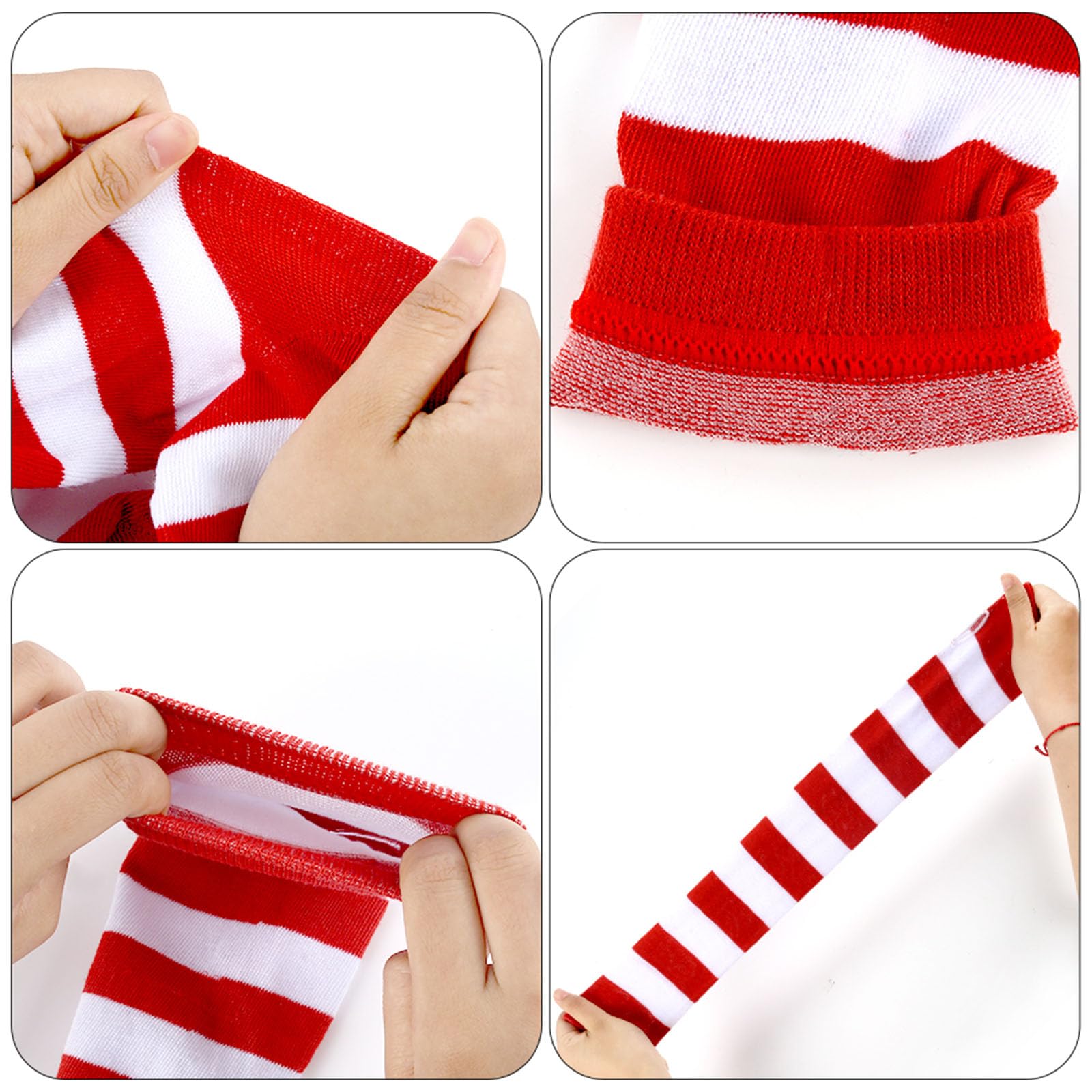 Complete Set: Includes 1 pair of thigh-high red & white striped stockings (20" length) + 1 matching arm warmers (15"). Machine washable (hand wash recommended)—no ironing or bleach needed for easy care