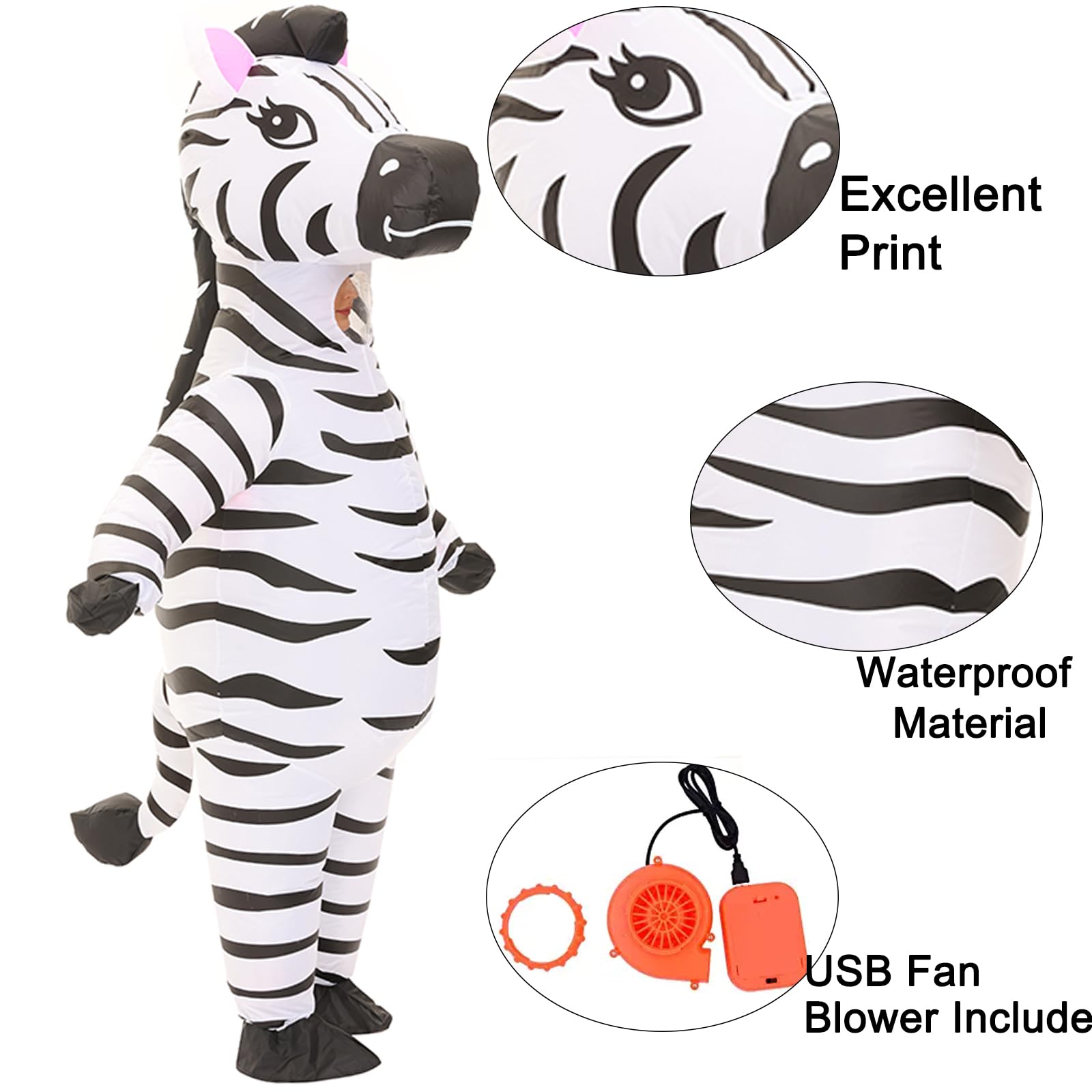 ZEBRA CUSTOM MATERIAL:zebra onesie adult made of good quality Polyester ,zebra inflatable costume soft and waterproof material design can be easily inflated zebra costume for women when the fan starts to work,zebra costume adult have fun with your friends and parents