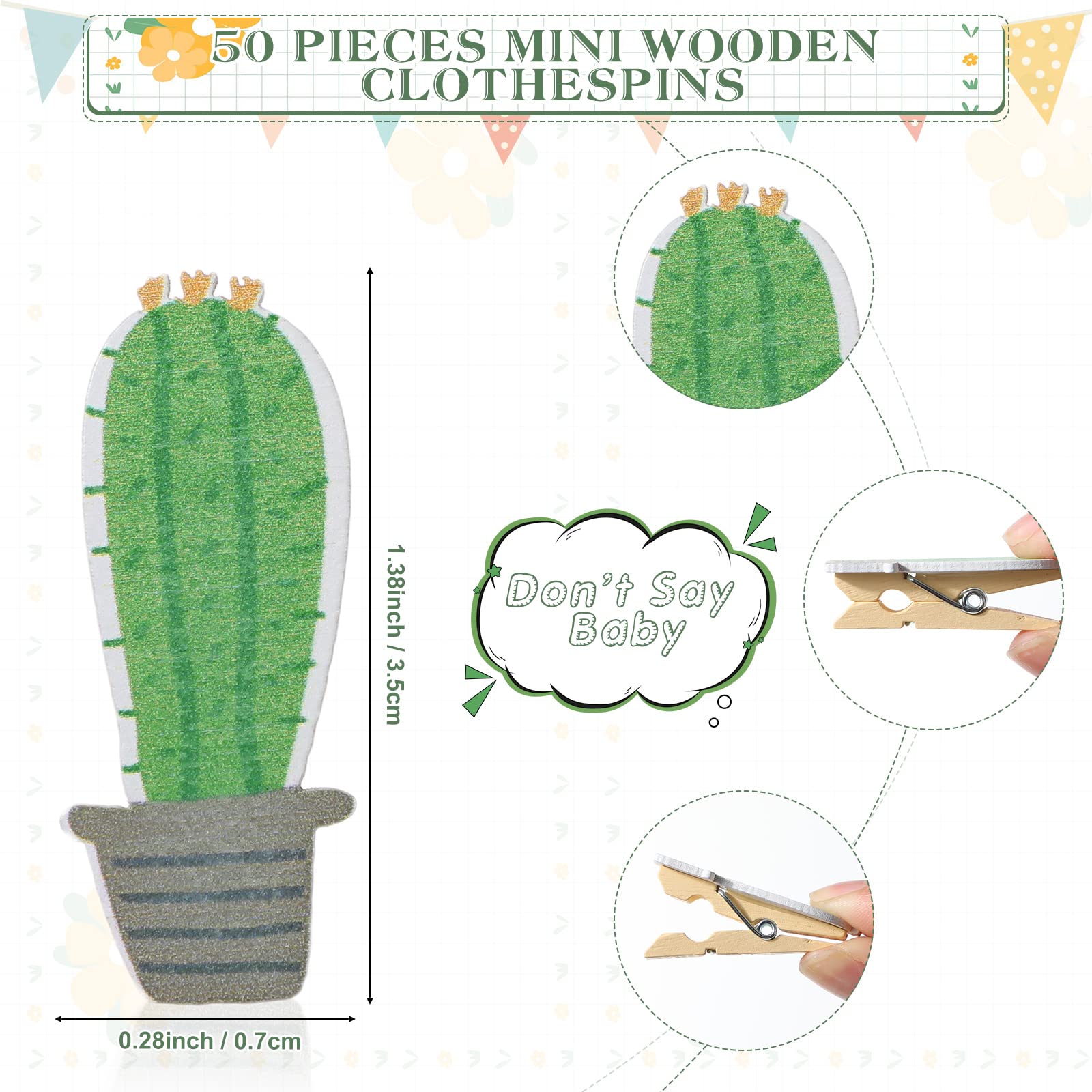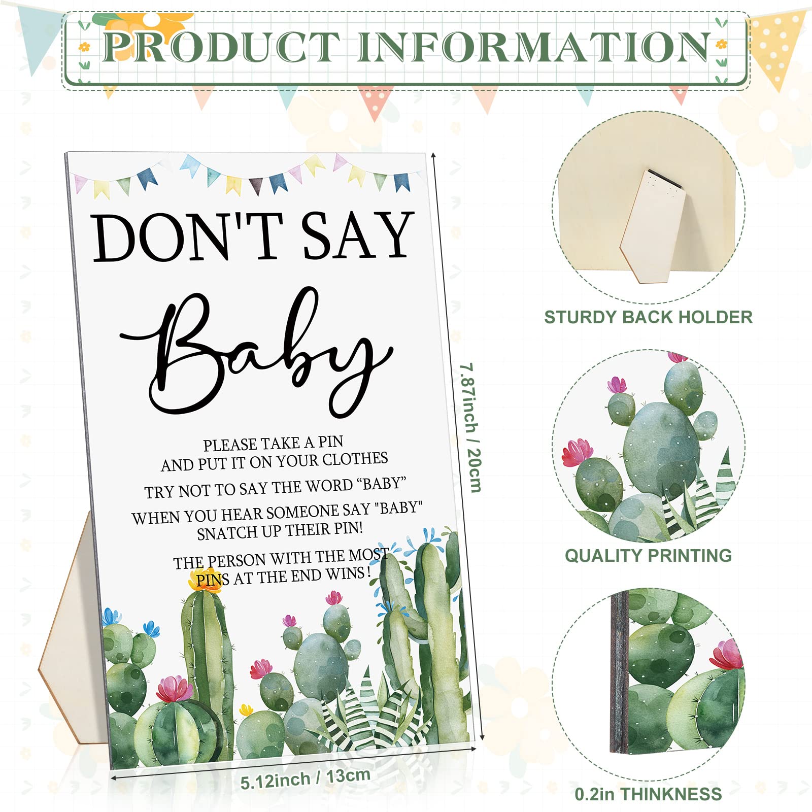 Size Details: the stand sign of this forest cactus theme don't say baby game measures approx. 5.12 x 7.87 x 0.2 inch, each mini cactus clothespin is about 1.18 x 0.28 inches, the proper size for you to decorate your party