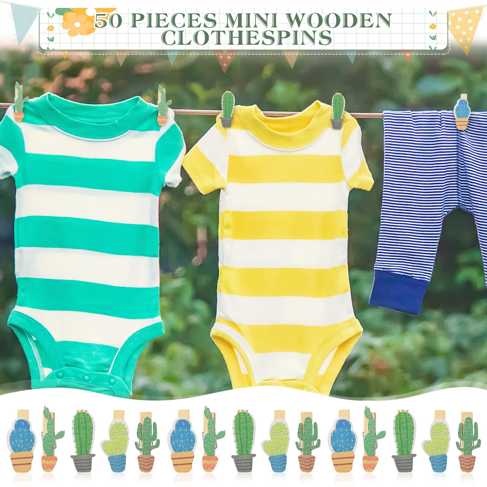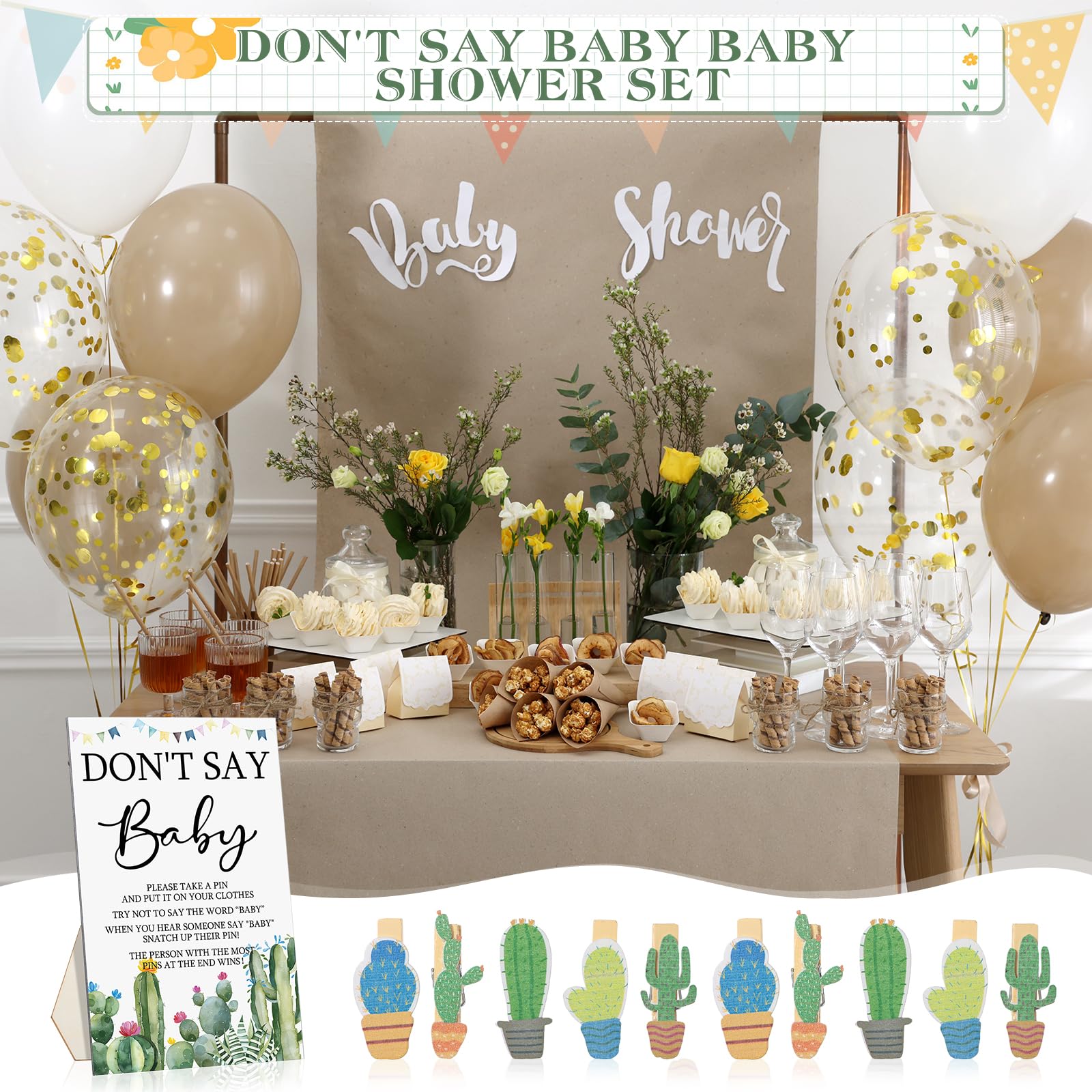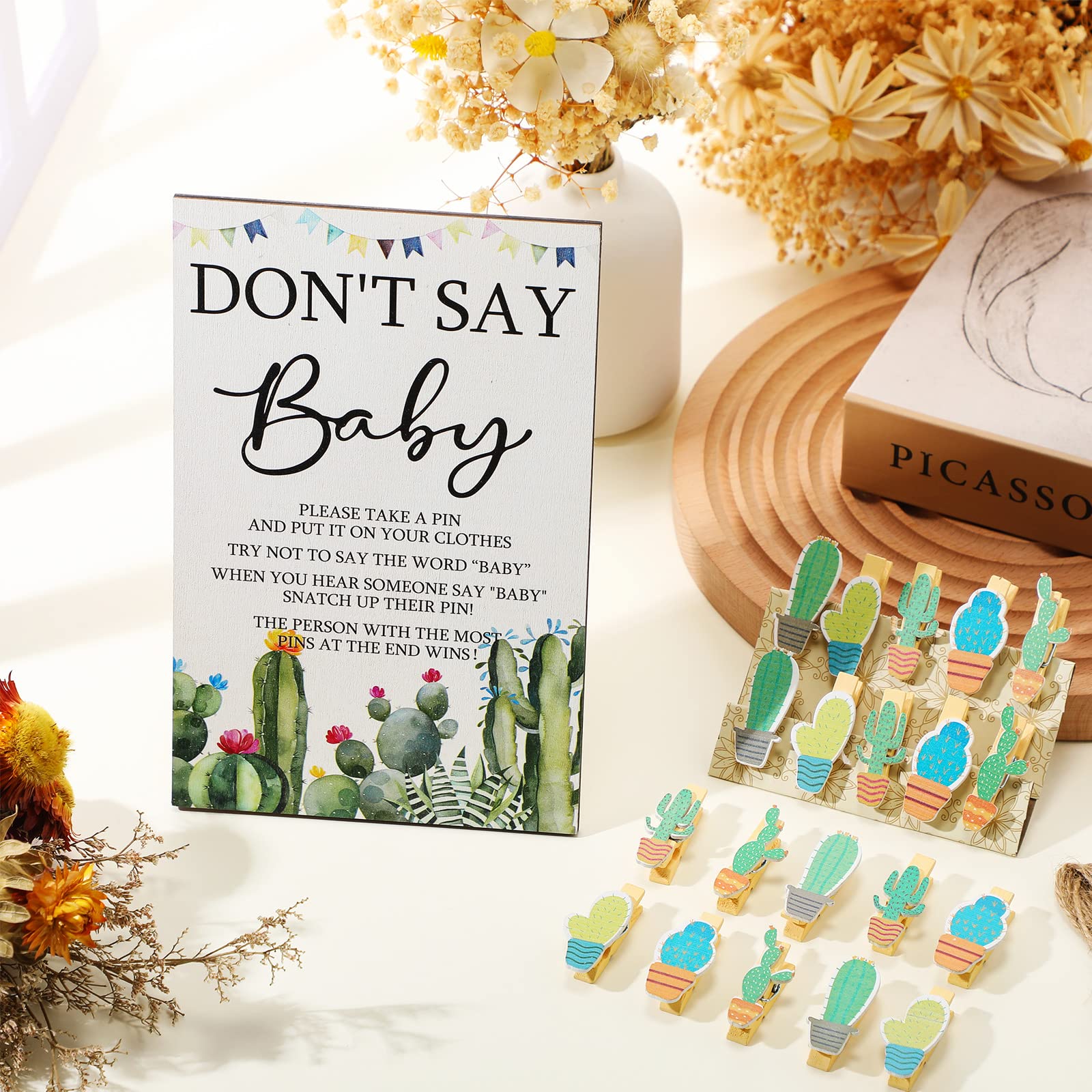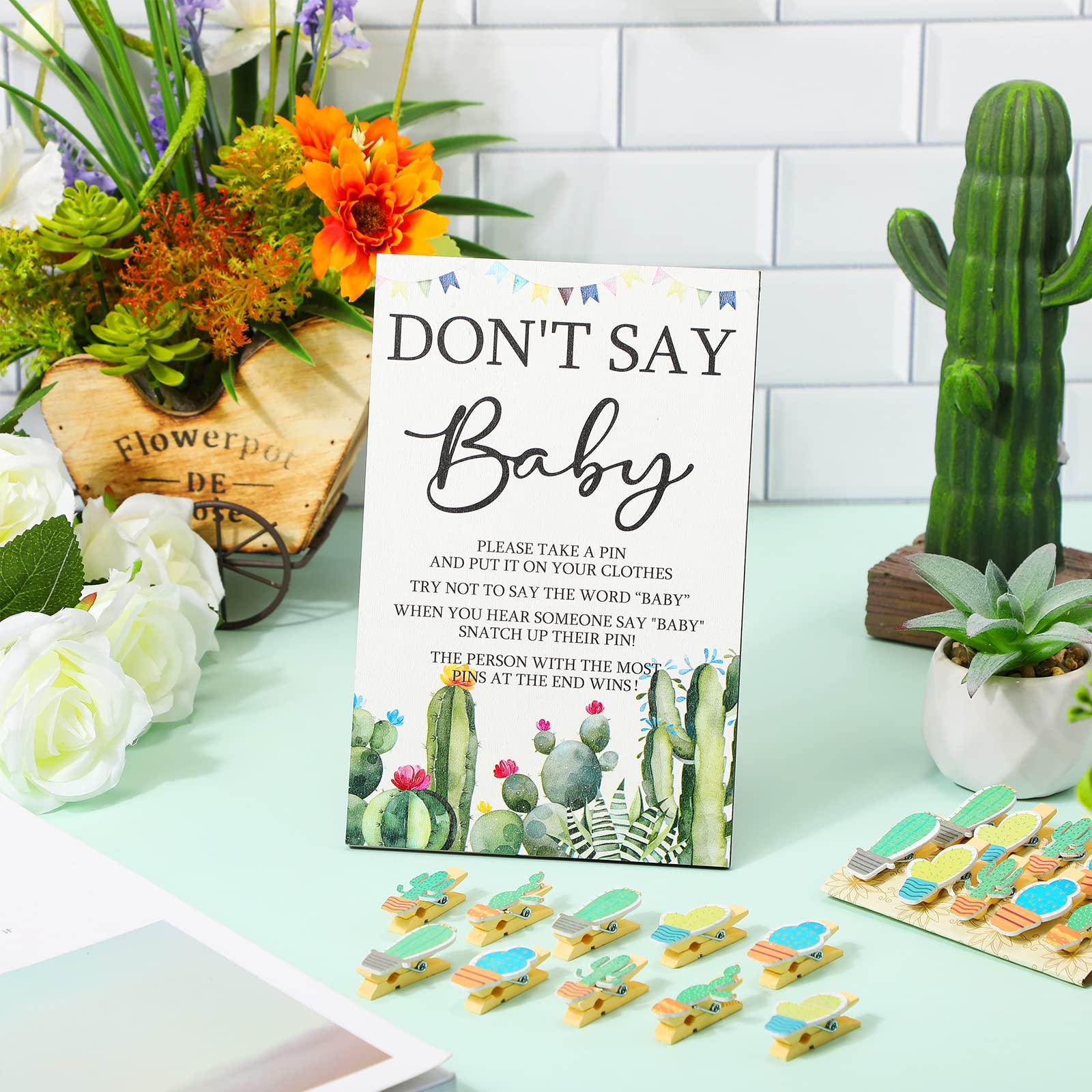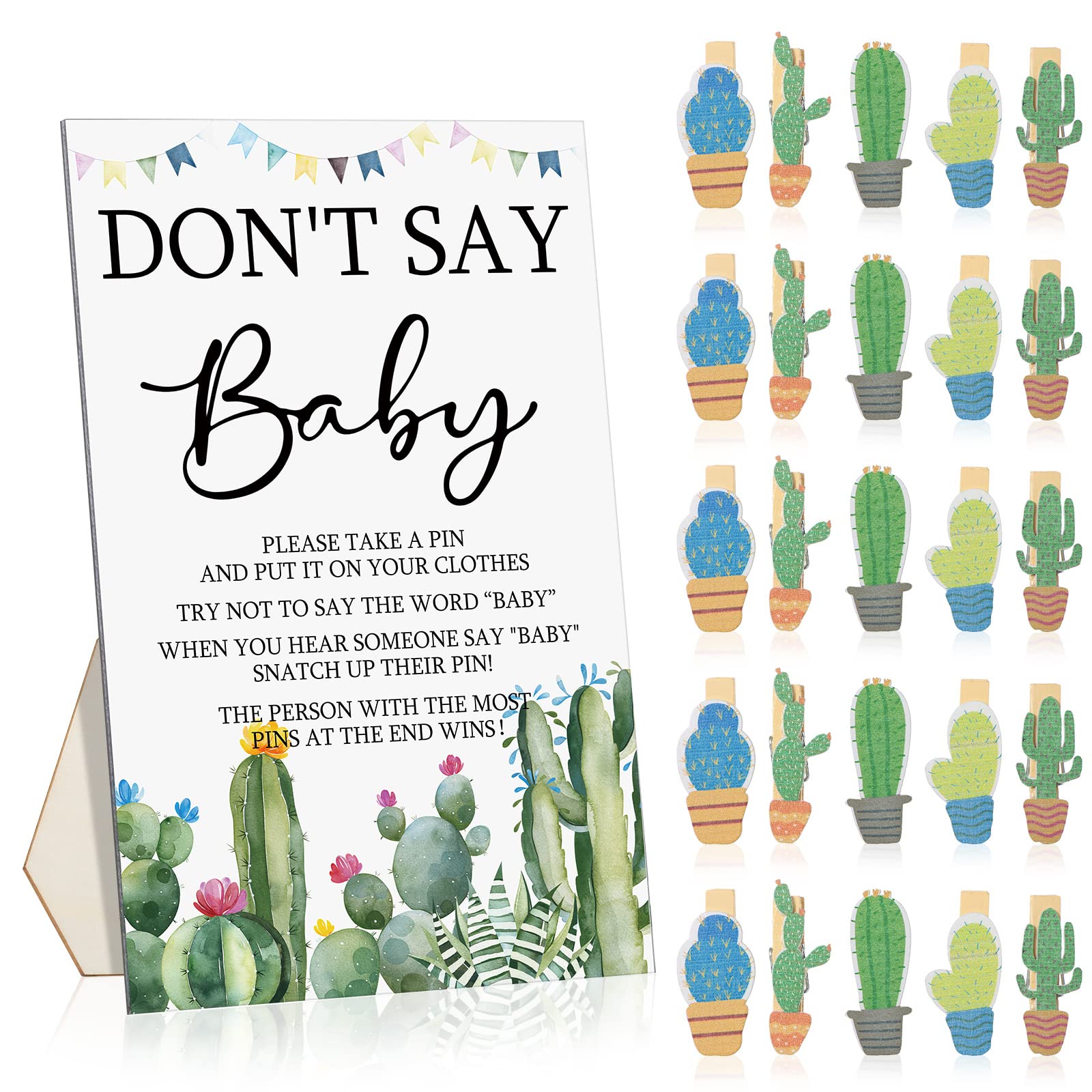 What Will Get: the package contains 1 set of don't say baby game supplies, including 1 piece of cactus theme wooden don't say baby sign, 50 pieces of cactus wooden clothespins, enough and complete to meet your party needs