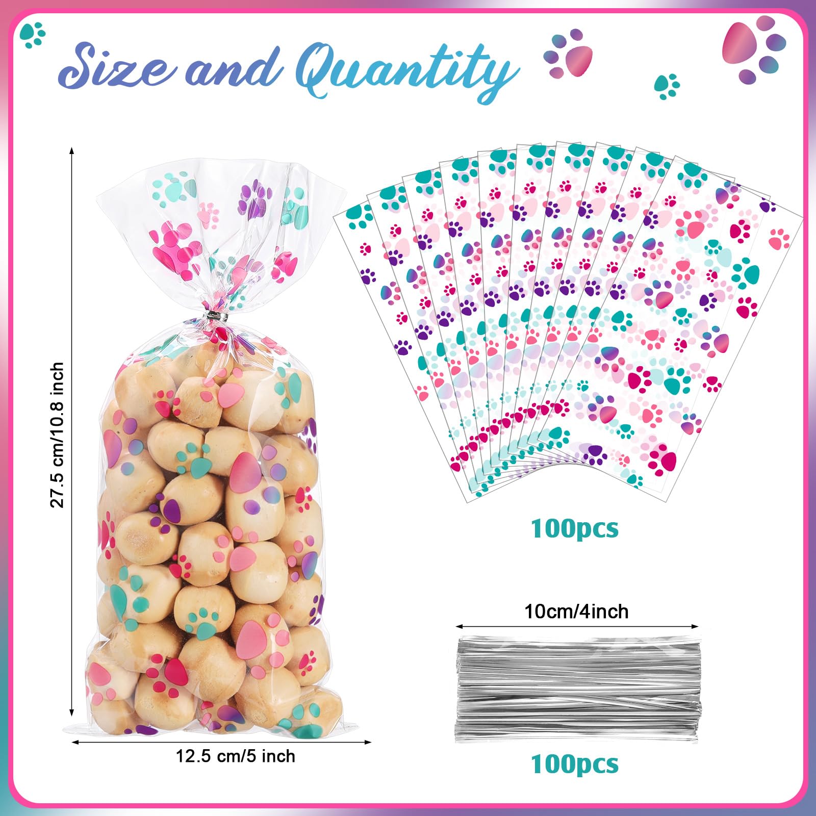 100 Pack paw patterned cellophane bags heat sealable candy bags gift bags with 100 pieces silver twist ties for pet treat party favor Designs: Each plastic bag is 27.5 x 12.5 cm/ 10.8 x 5 inch, can hold a good amount of candy, then tighten the opening with a silver twist tie. Features: The heat sealable pet gift bags are printed with paw pattern, these bags can decorate your pet party and make it funny. Wide usage: These paw bags are suitable for party favors, candy bags, or other gift packaging. Specifications: Color: as the picture shown Material: cellophane Bag size: 27.5 x 12.5 cm/ 10.8 x 5 inch Twist tie: 10 cm in length Package includes: 100 x Paw patterned bags 100 x Silver twist ties