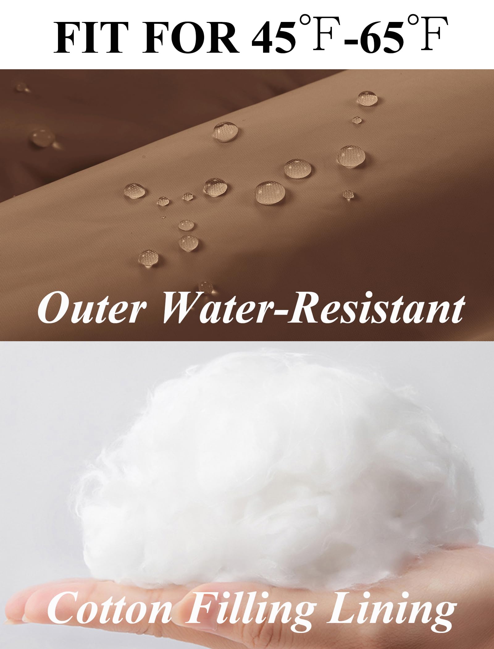 Water Resistant: Featuring a water repellent fabric, this thermal vest finish sheds light rain and snow. It is filled with 100% cotton that is more puffy and insulated. Suitable for temperatures between 45°F and 65°F