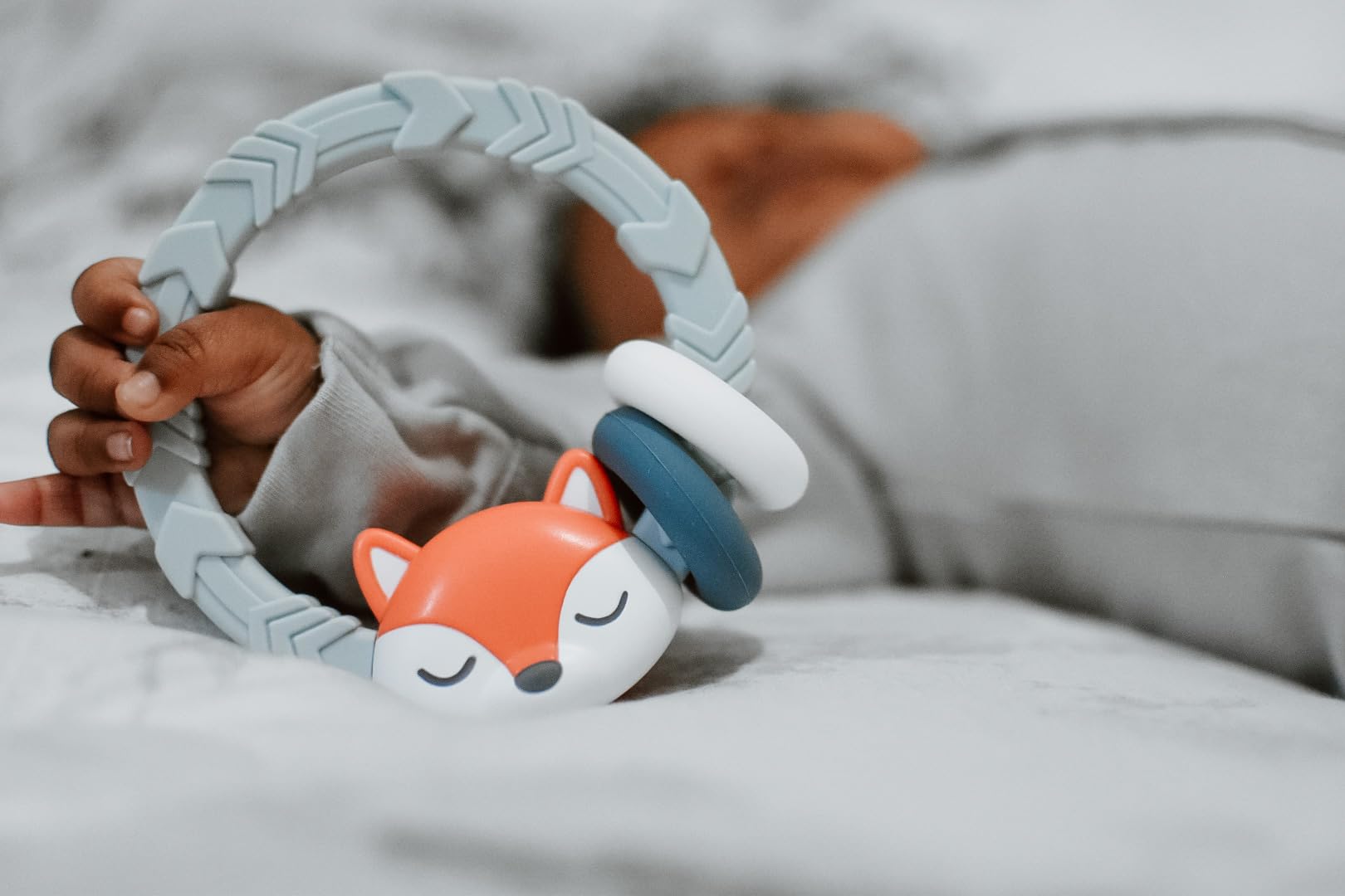 ENGAGING ENTERTAINMENT: Keep your little one happily occupied with our teething toy's engaging features. The two attached silicone rings are perfect for tiny hands to grasp and explore, while the soft rattle sound adds an extra element of fun. Say goodbye to fussy moments!