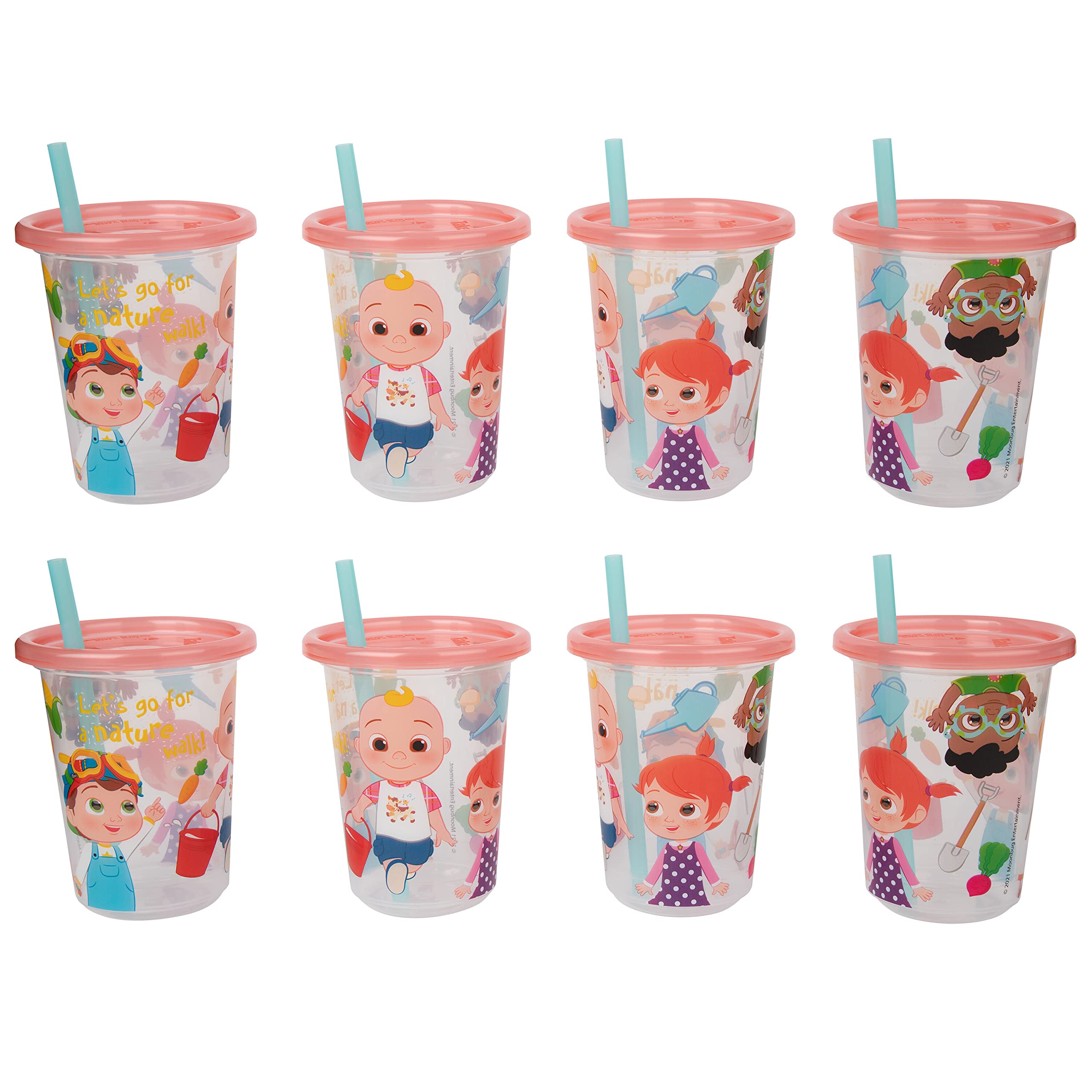 Take & Toss sippy cups help you to reuse and recycle with their smart reusable design! This sippy cup with straw inserts can be used again and again, but don't cost a lot. When it's time to let them go, these kids cups can be easily recycled in many communities. This edition of the Take & Toss toddler cup features CoComelon characters to delight girls and boys their fun designs! Whether it's snack time at home, playtime at preschool, or time for their next birthday party, this set of 8 toddler cups is ready for fun! The snap-on lids keep their favorite beverages inside of the cup to control spills and help eliminate the threat of a stained carpet or coffee table. When it's time to clean, this straw sippy cup is top rack dishwasher safe for quick and hassle-free washing. Since there are 10 toddler straw cups in this set, you can use them throughout the week or even as a take-home party favor! Each of these Take and Toss Sippy Cups are perfect for your baby registry search and are ready for little hands ages 9 months and up!