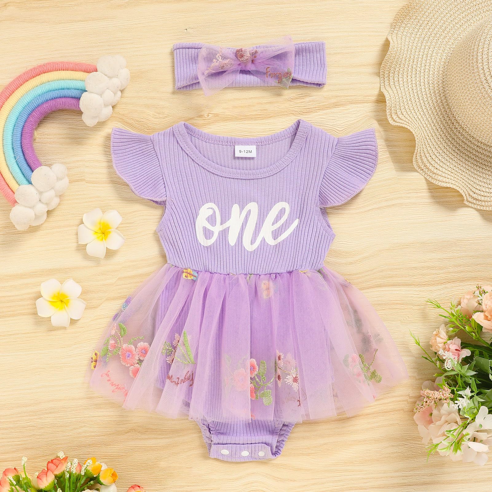 🎀 1ST BIRTHDAY ROMPER - "One" letters and lovely strawberry / butterfly / donuts print romper, three snaps for easily diaper changing, candy colors cake smash outfits, ruffle ribbed tulle one-piece clothes for your little girl's first birthday.
