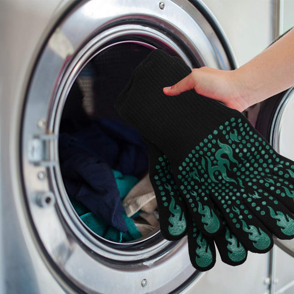 Easy to clean and store: Our heat resistant gloves can be easily cleaned either by machine washing or hand washing. The inner side of the cuffs features a convenient loop for hanging and drying, making storage a breeze.