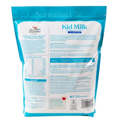 Manna Pro Goat Kid Milk Replacer provides complete and balanced nutrition formulated to support the healthy growth development and vitality of newborn and orphaned goat kids. This high-quality formula contains essential vitamins minerals and energy-rich nutrients including a balanced protein and fat profile to closely mimic mother’s milk and promote strong bones optimal digestion and immune support. Made with real dried skim milk for superior digestibility this milk replacer is an ideal choice for bottle feeding goat kids during times of weaning or maternal separation. It also includes probiotics to aid in gut health and help reduce digestive upset in young animals. Manna Pro Goat Kid Milk Replacer is easy to mix dissolves quickly and delivers consistent performance for goat producers breeders and homesteaders raising dairy goats or meat goats alike. Whether used for raising show goats commercial herds or backyard livestock this replacer ensures a healthy start and continued growth. Suitable for all breeds and trusted by farmers Manna Pro supports your herd with premium nutrition from birth through transition.