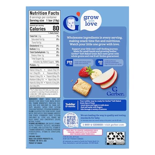 12 MONTHS +: These toddler snacks are designed for children 12 months and older. Your toddler may be ready for these Gerber soft baked grain bars if they stand alone or begin to walk alone, feed self easily with fingers, or bite through a variety of textures