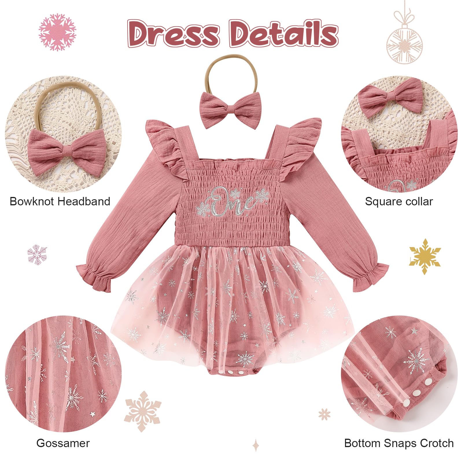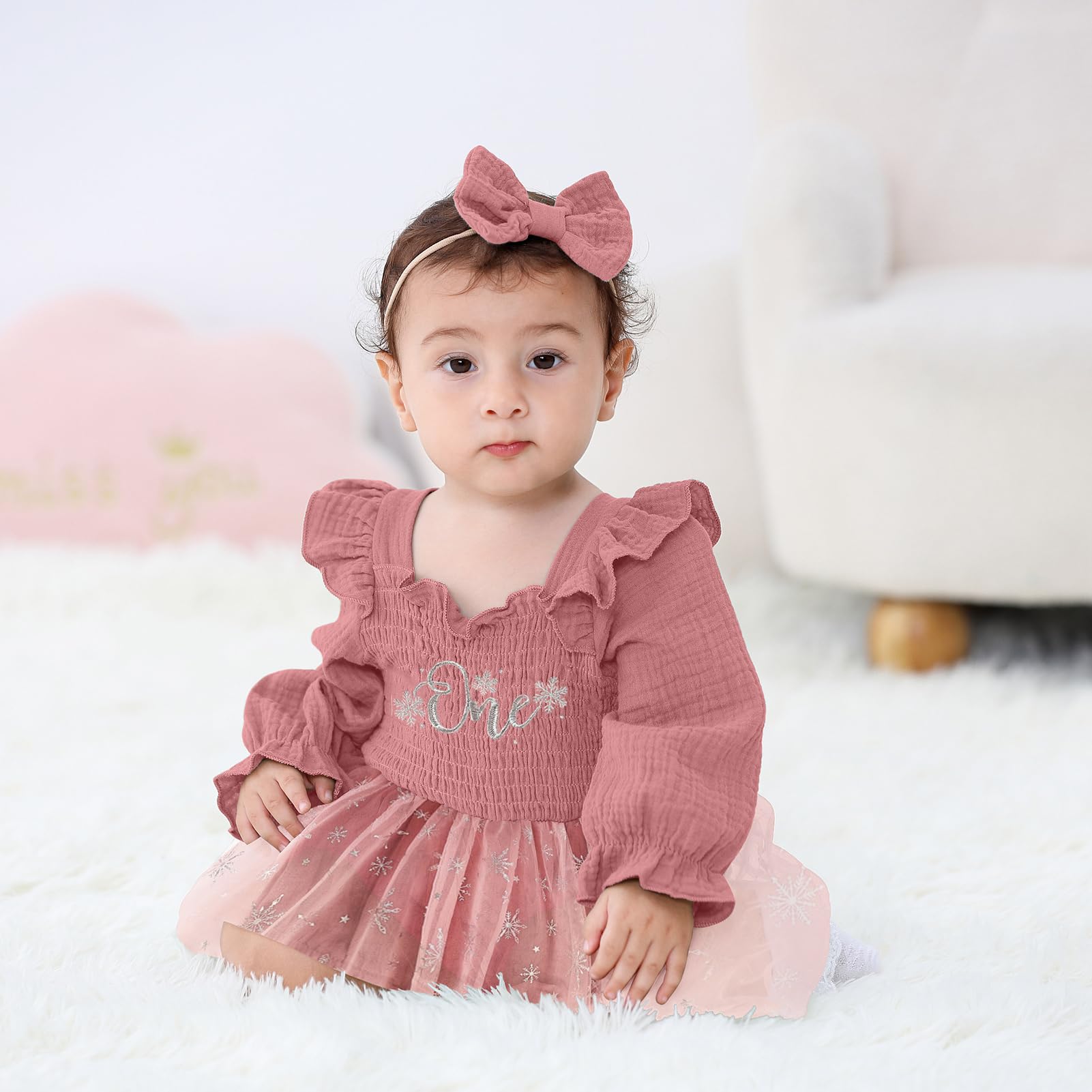 Design: Newborn baby girl playwear romper dress with long sleeve, solid color, multi-layered tulle, Snap leg openings for easy diaper changes, easier morning for novice mother.Cute princess 1st birthday outfit, fashionable and adorable embroidery ONE printed themed birthday clothes perfect for creating beautiful memory of her first birthday.
