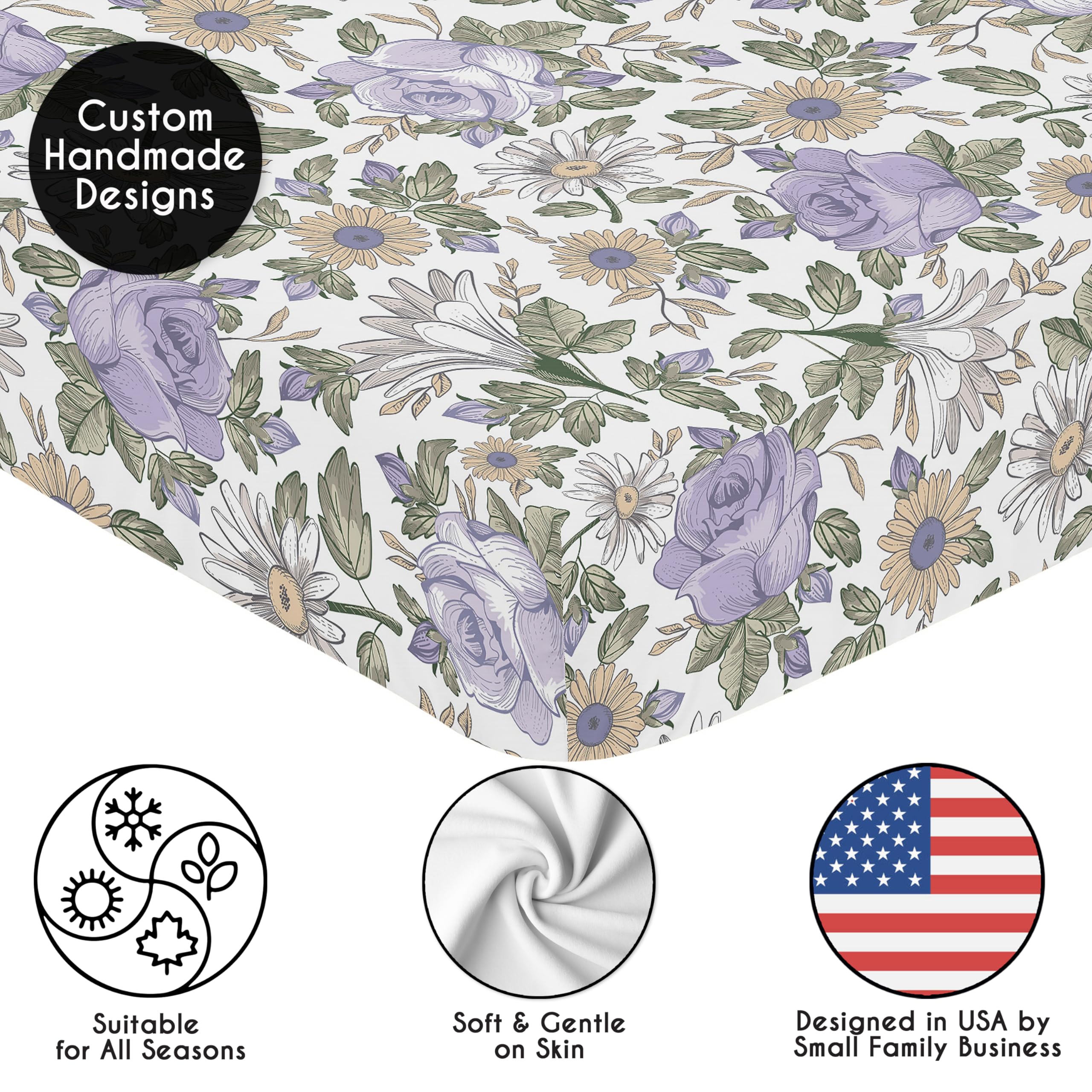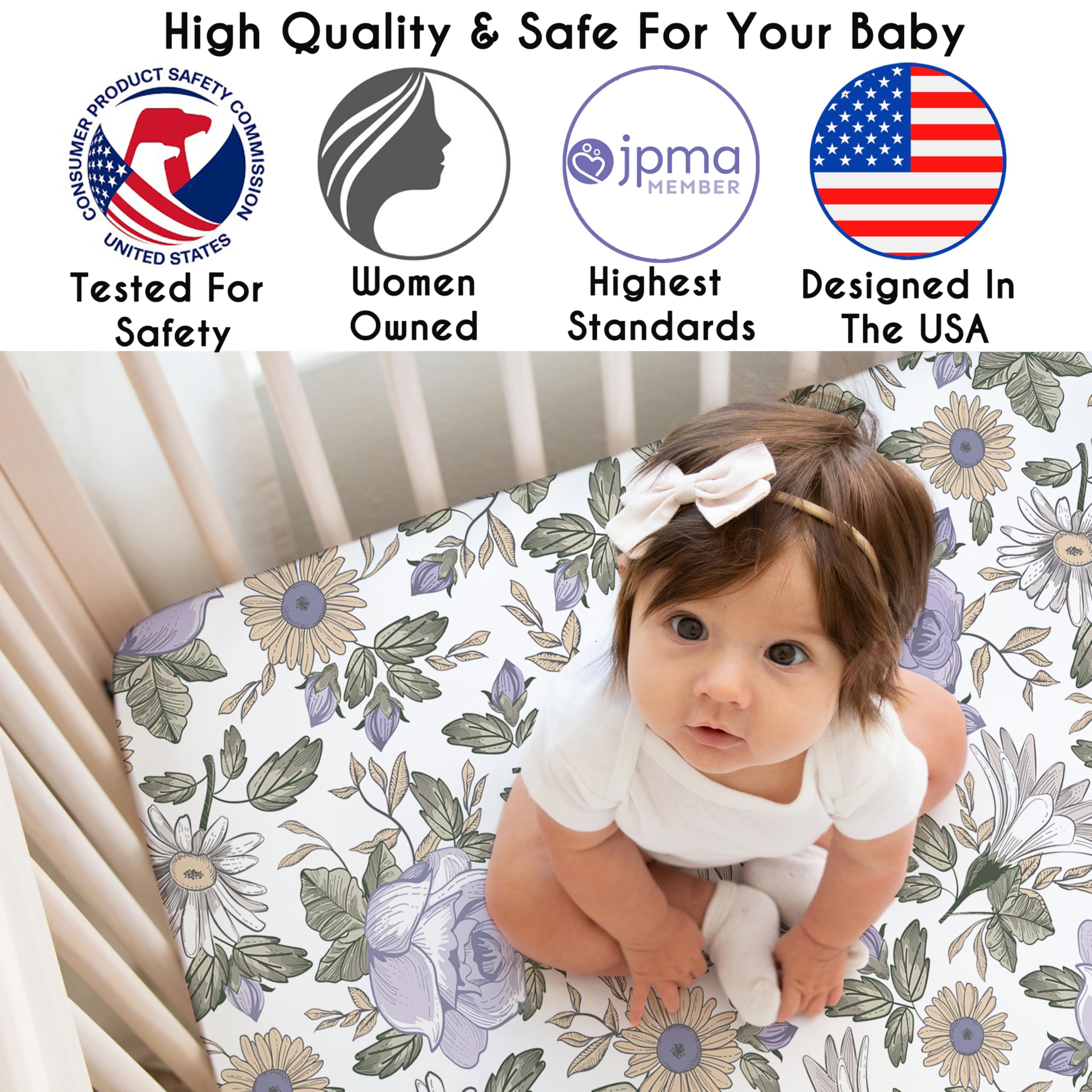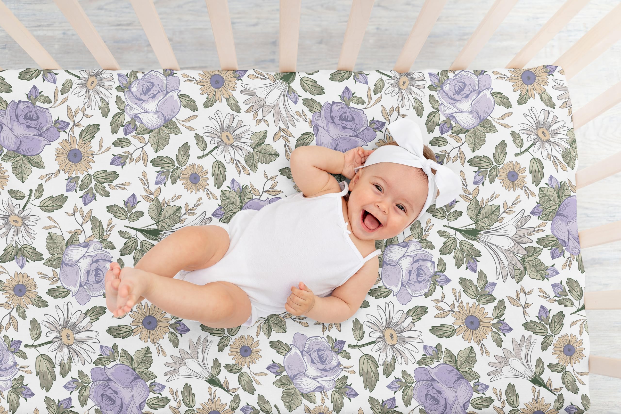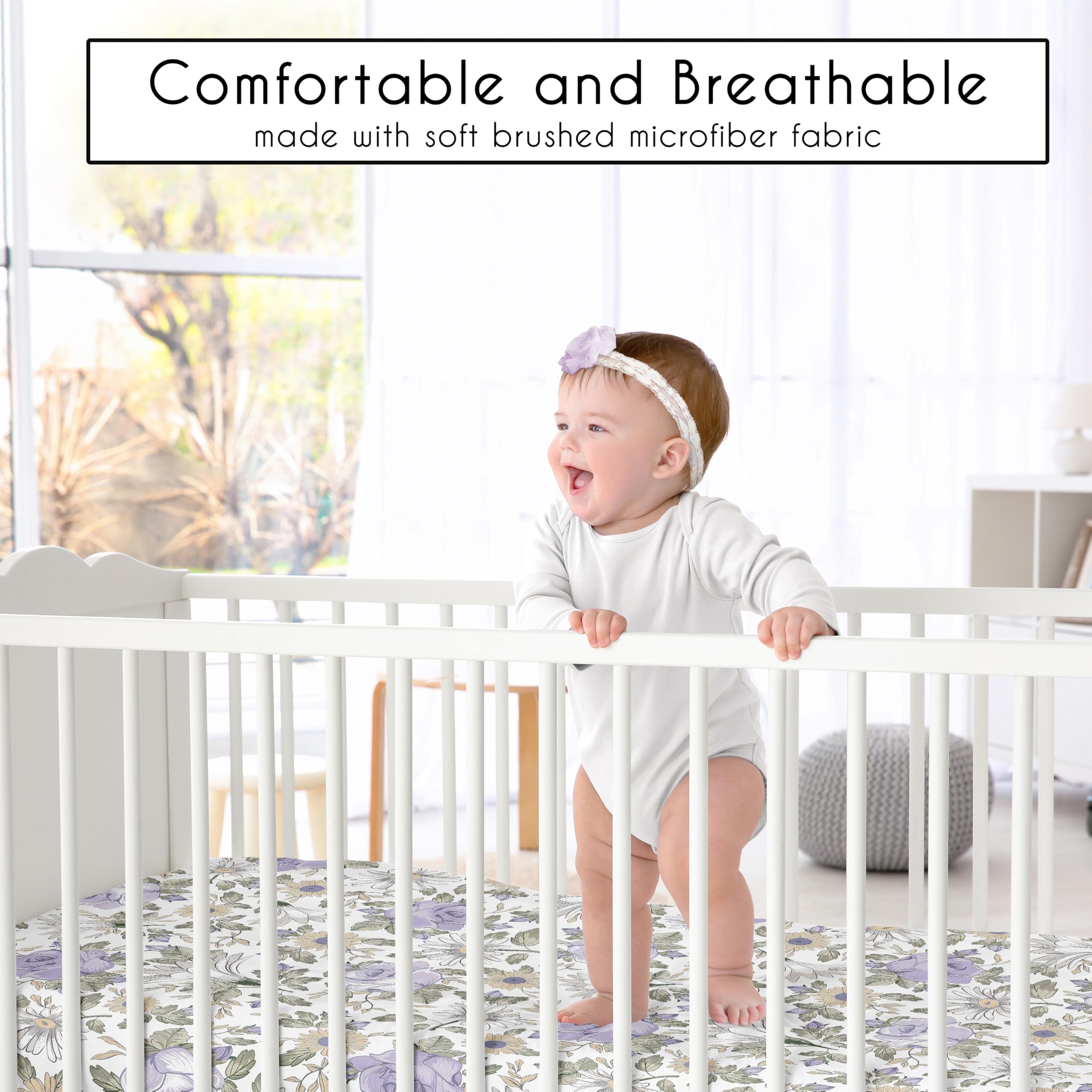 SNUG FIT: Includes (1) Fitted Crib Sheet 52in. x 28in. x 8in. Our newborn standard crib sheets fit snugly, with premium elastic sewn around the entire bottom edge for a secure fit on most standard sized cribs and toddler beds, to reduce shifting and bunching. This brushed microfiber crib sheet features an exclusive design of a lavender, lilac, violet, sage green and yellow bohemian, vintage floral, nature, elegant flower print & is gentle on delicate skin to foster a soothing sleep environment.