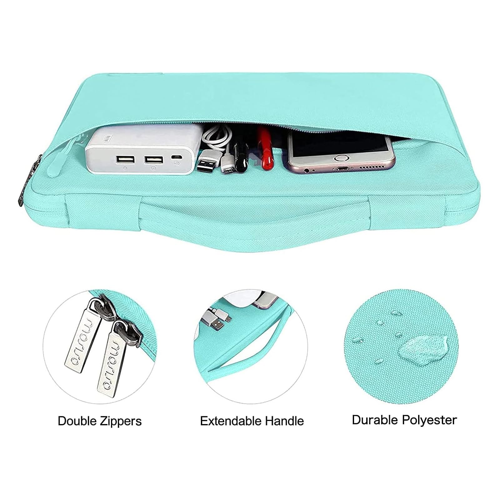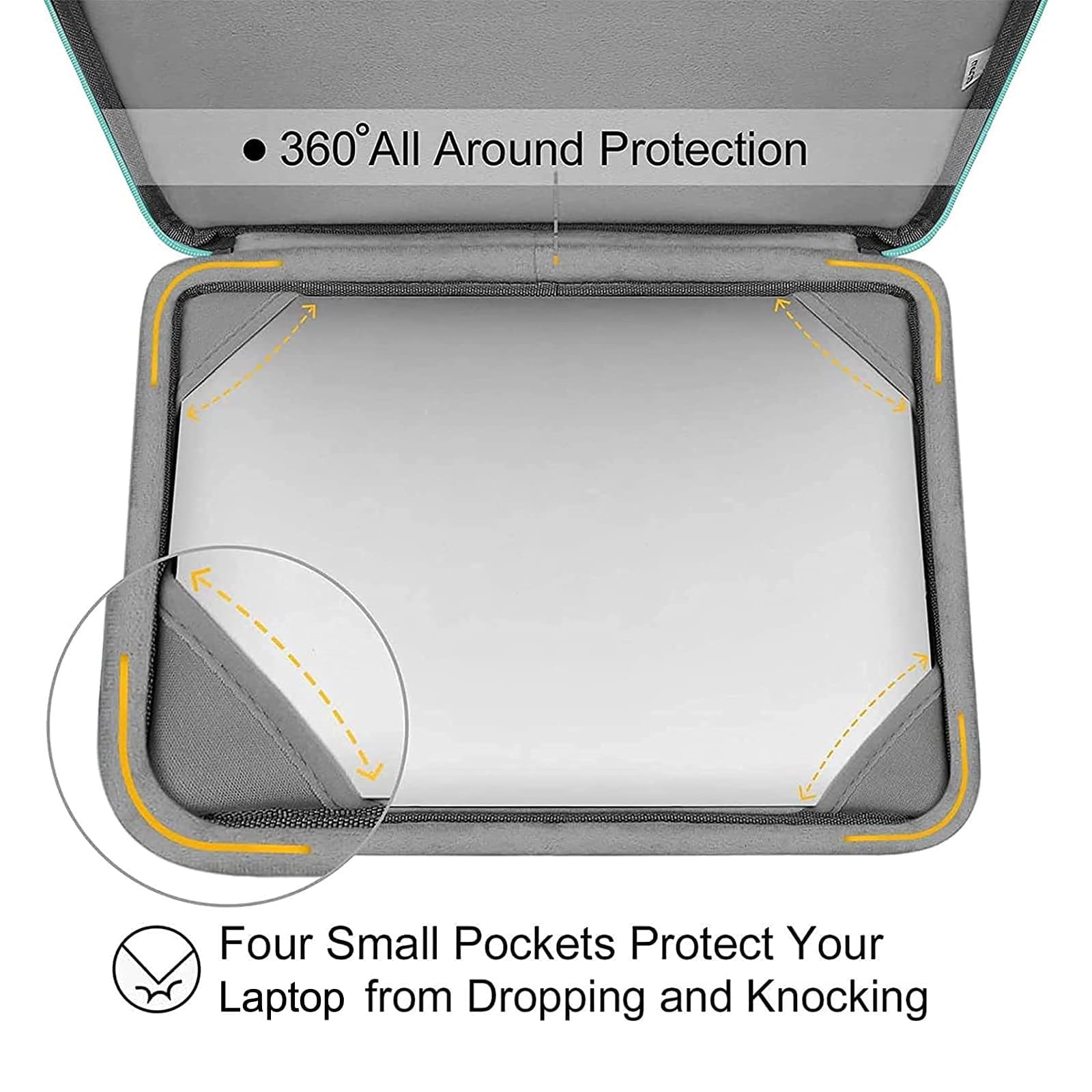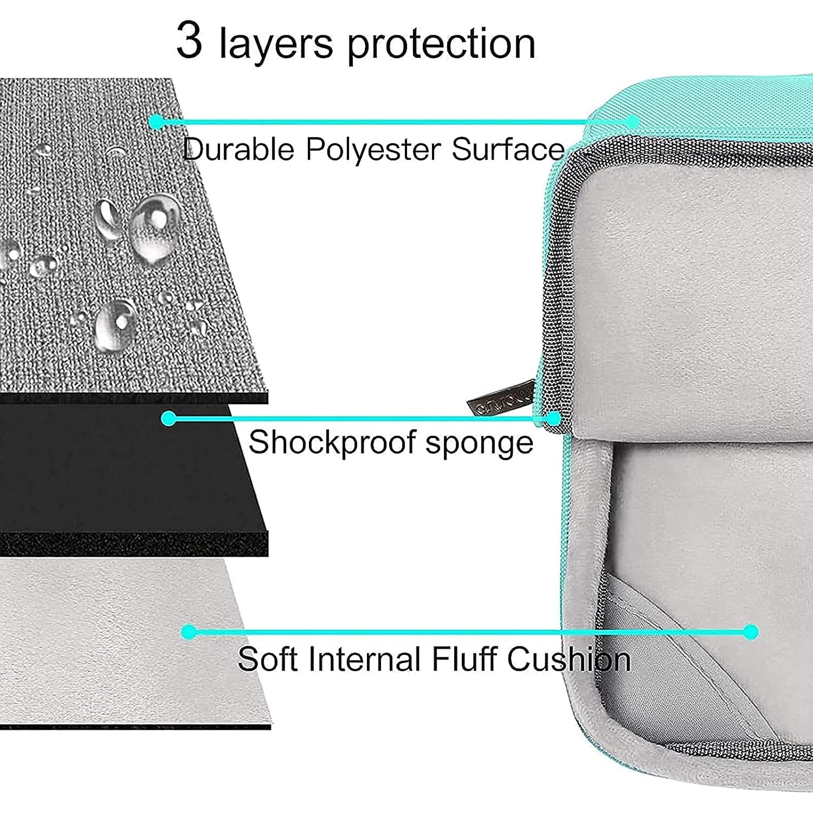 The 360 degree protective shockproof laptop sleeve with handle carrying bag internal dimension: 13.39 x 9.25 x 0.79 inches (L x W x H); external dimension: 13.98 x 9.84 x 0.79 inches (L x W x H). The front side pocket dimension: 11.61 x 9.25 inches (L x W). Made of polyester material, protect your laptop against accidental spills. Slim and lightweight, does not bulk your device up and can easily slide into your briefcase, backpack or other bag. Ideal for business, daily and travel.