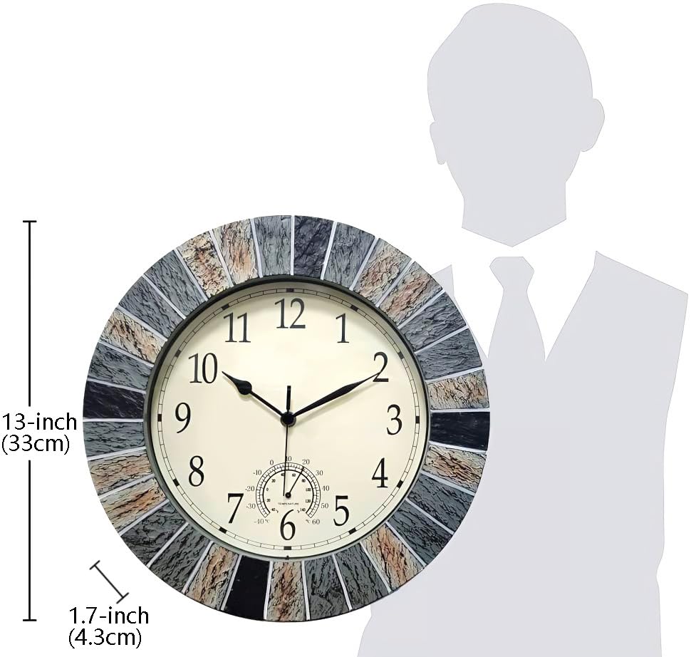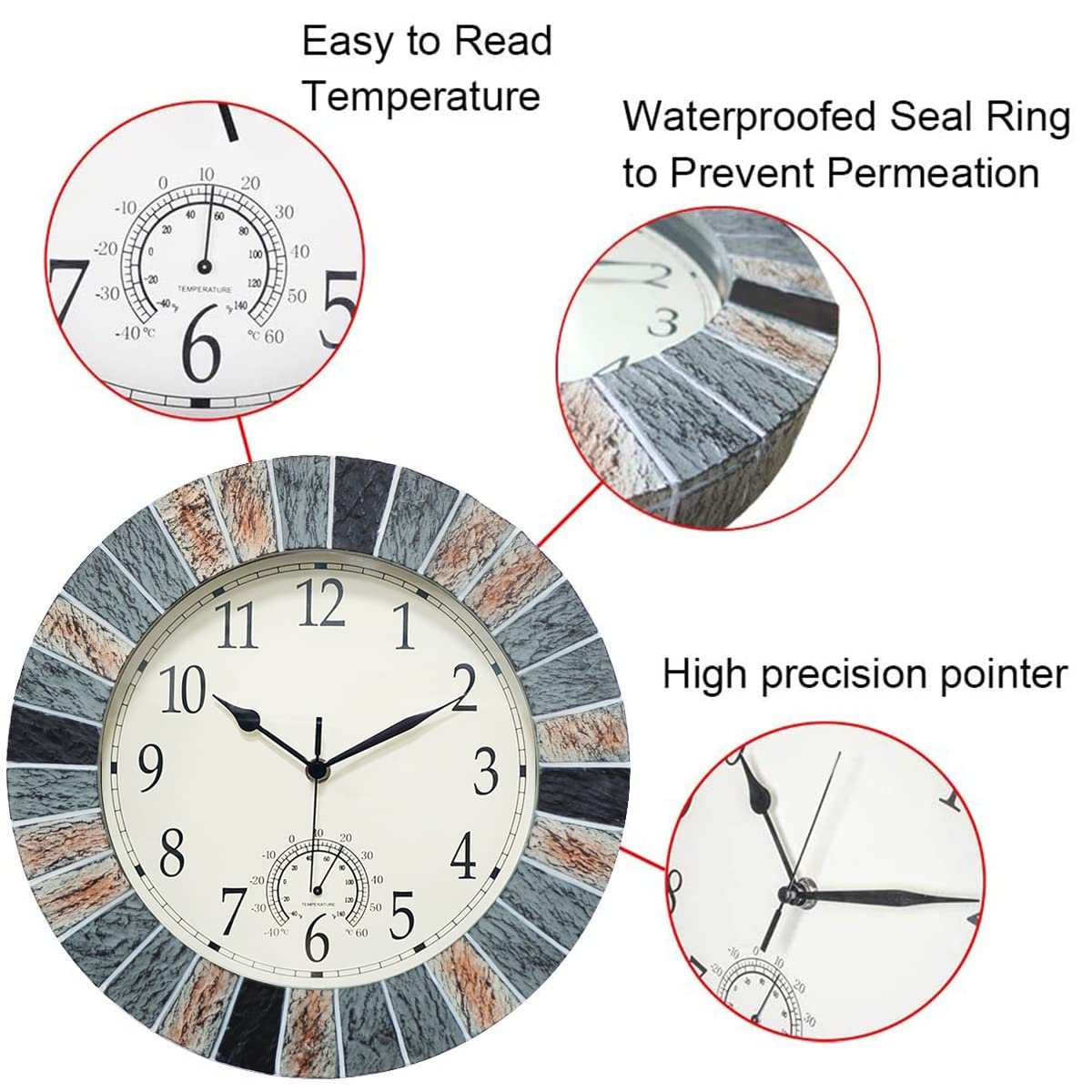 Outdoor Clock Thermometer Combo: The UMEXUS 13 inch outdoor clocks with thermometer combo measures temperature from -40 to 140 degrees Fahrenheit, the wall clock can endure the cold of Minnesota in the winter and work well in the heat of Texas in the summer, keep work properly in any heavy weather. Waterproof rear cover & Front rubber seal clock is great for mounting to pool, patio, garden, garage, yard, farmhouse, pool, kitchen, bedroom or bathroom