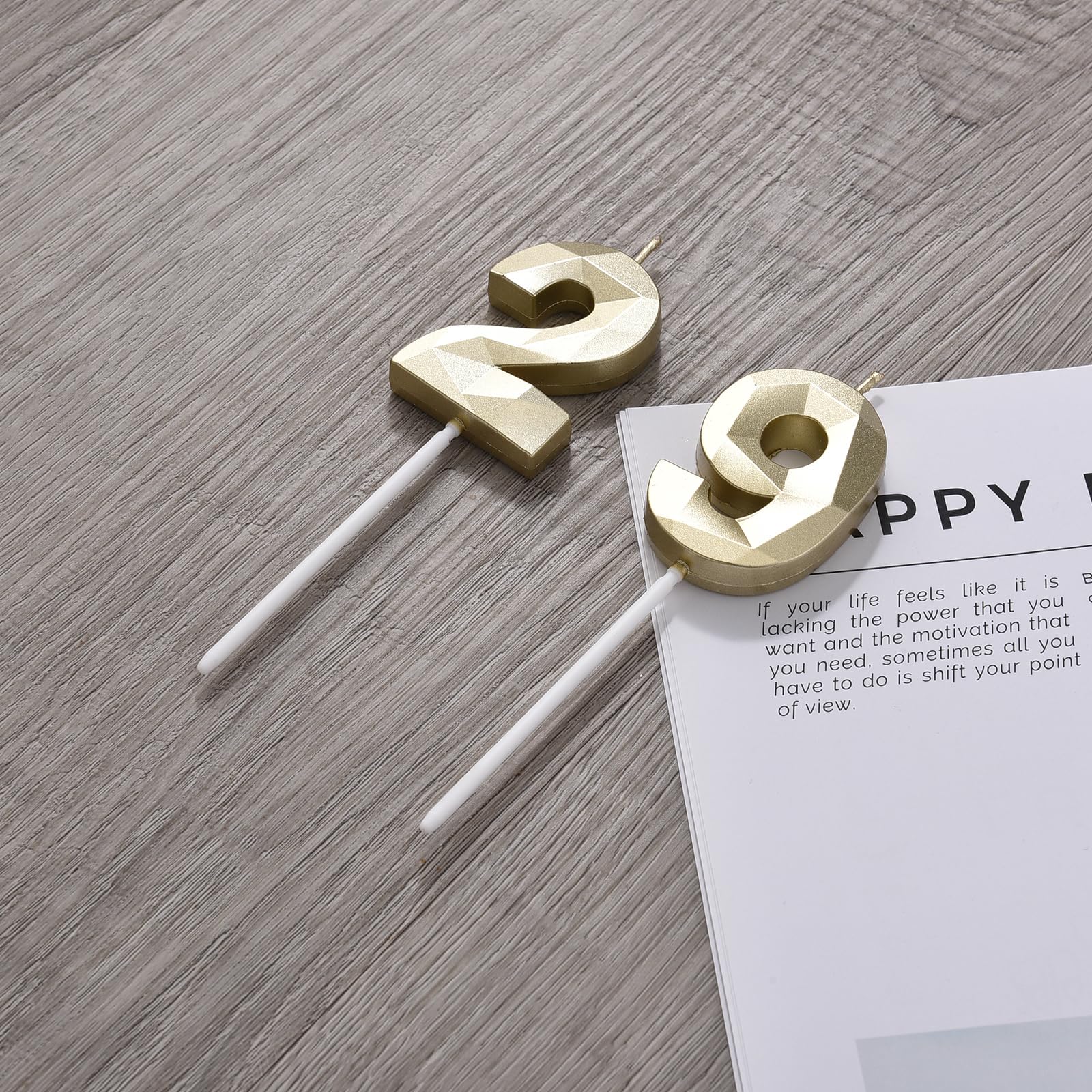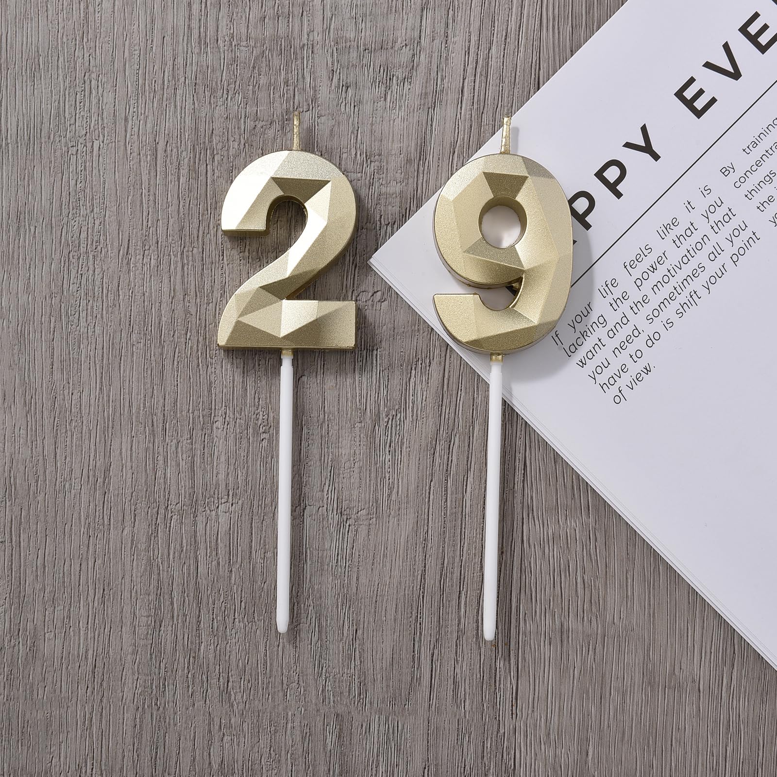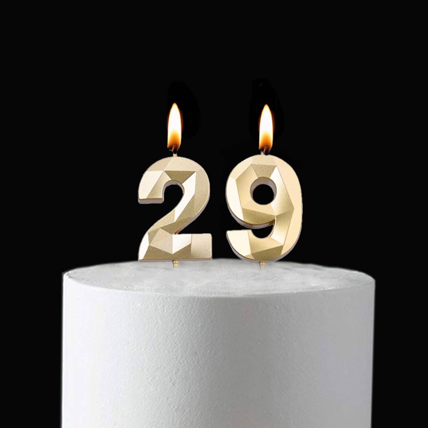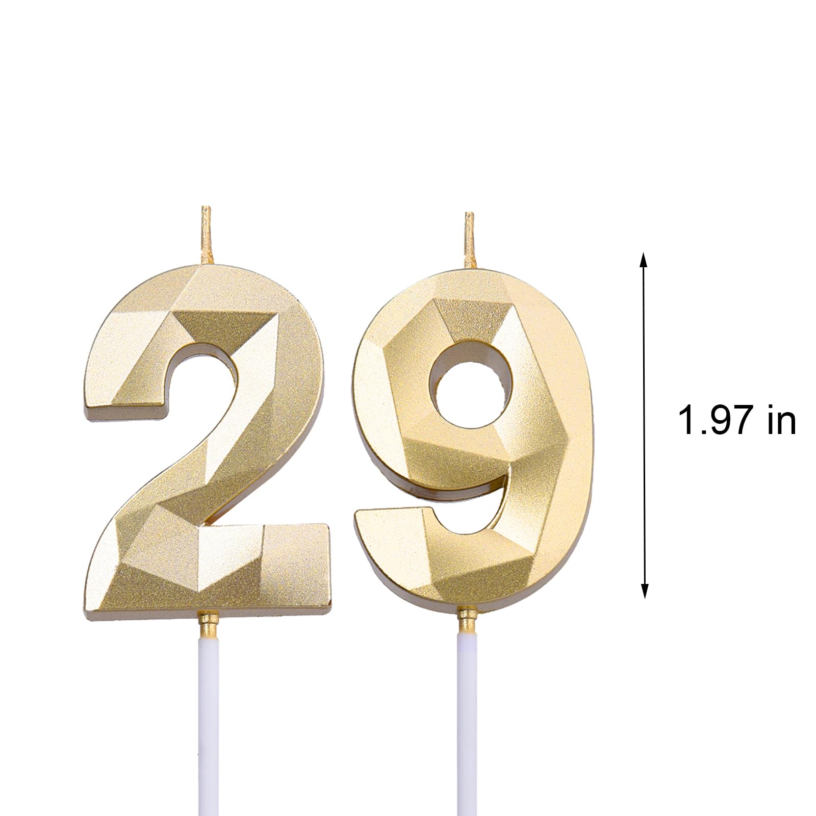 INSTRUCTIONS: Package Include: 2 pcs candles,Number 29 birthday candles Color : Glitter Gold Material : quality wax ,smokeless and non-toxic Size: Width:1.4 in. Number height: 1.97 in. Total height: 4.9 in Please Note : Warm Note:Please keep the candles in shade away from the fire