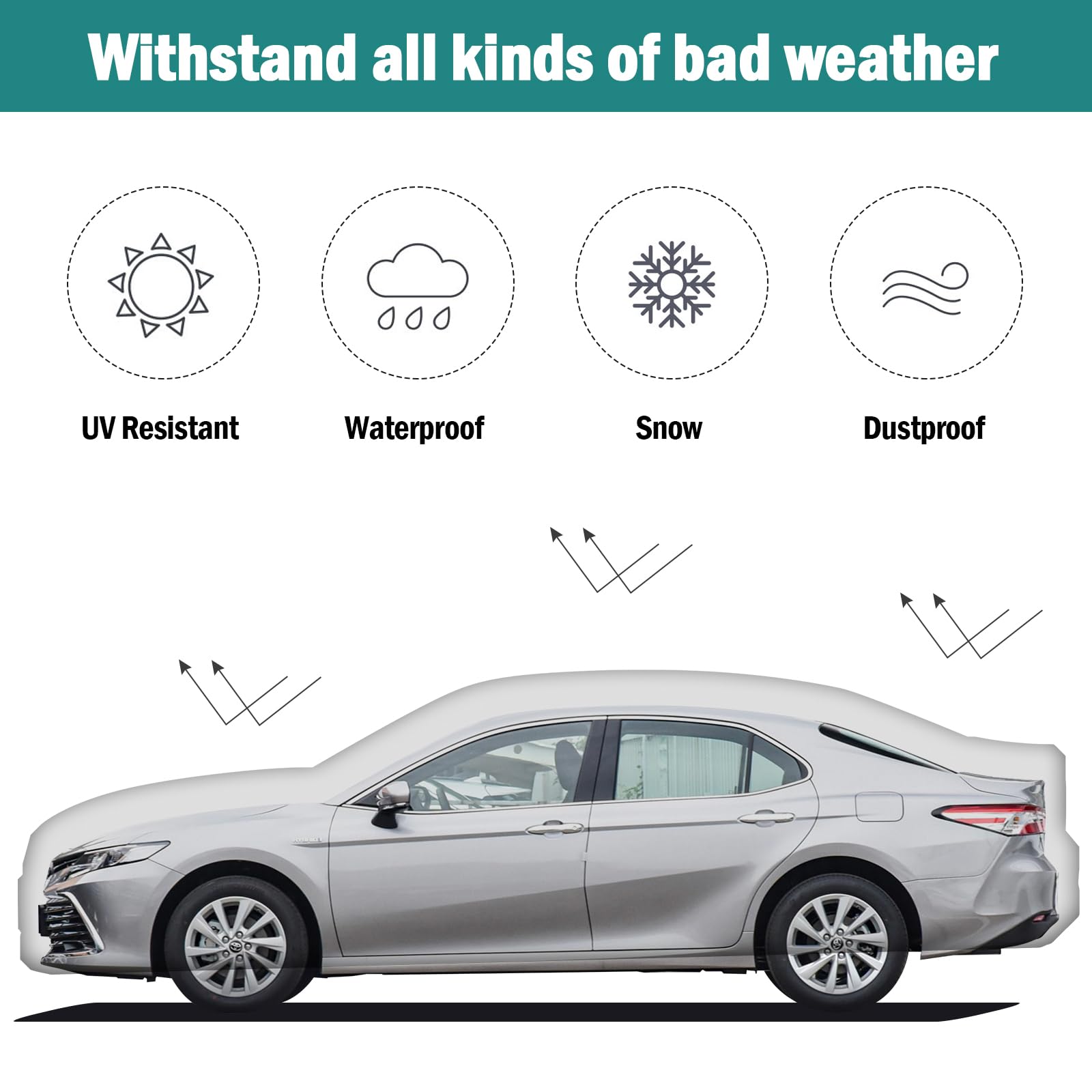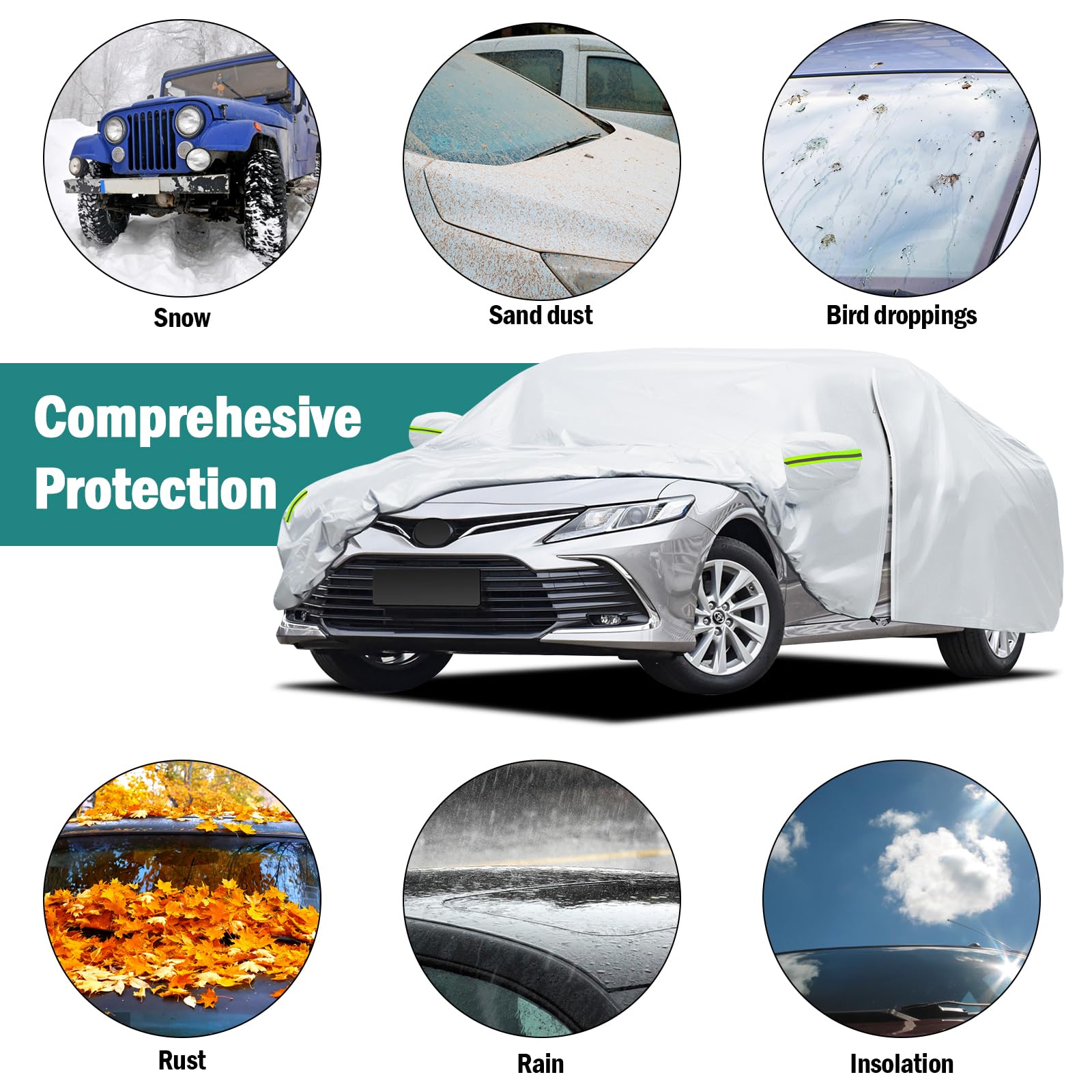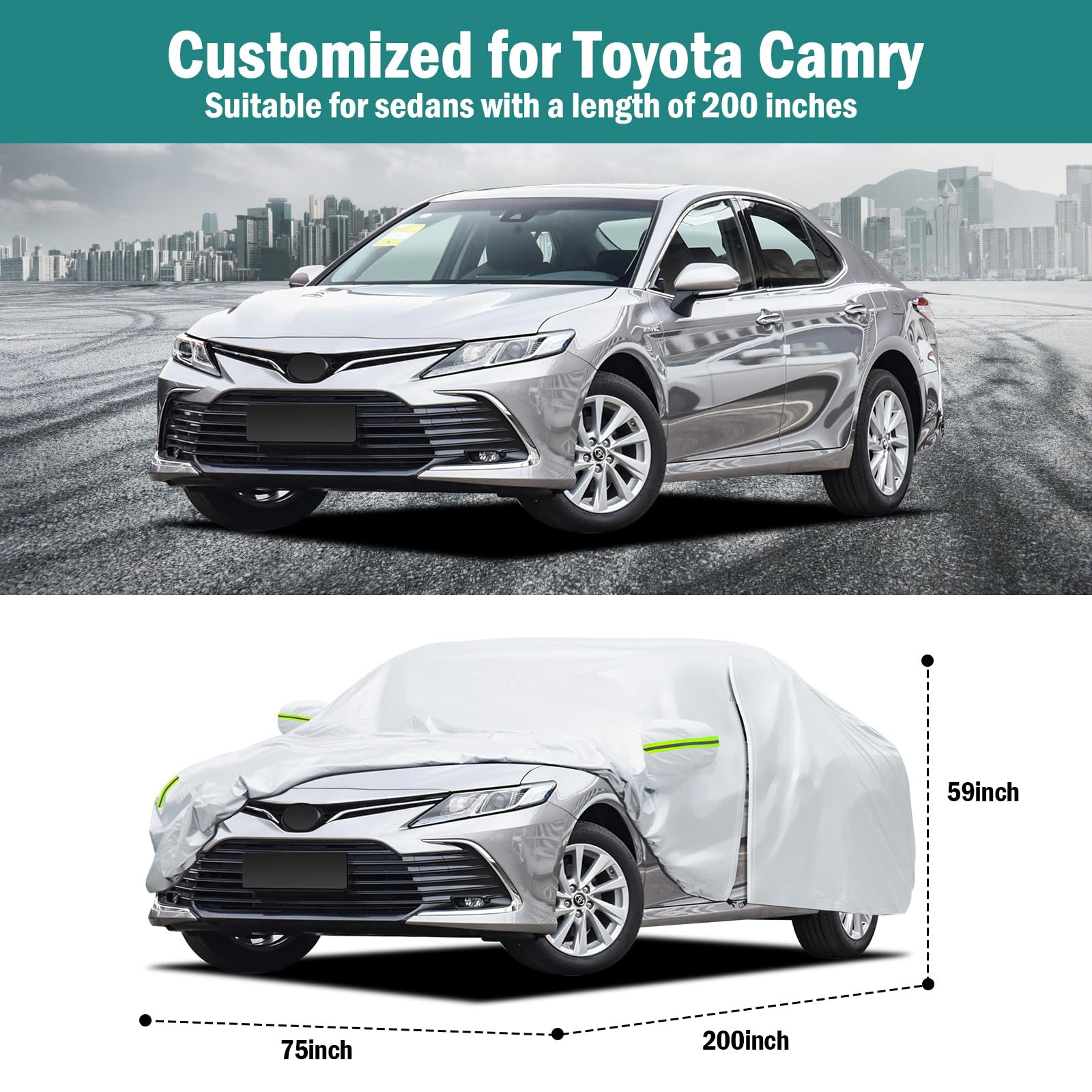 【All-Weather Protection】 This car cover is custom design for Toyota Camry 1996-2025, for Honda Accord 2001-2025, with a length of 195 inches, which can perfectly fit the car. It provides comprehensive protection for the car from all-weather factors in the four seasons of spring, summer, autumn, and winter, such as dust, snow, industrial pollution, bird droppings, leaves, pollen, acid rain, ultraviolet light, intense sunlight, heavy rain, etc.