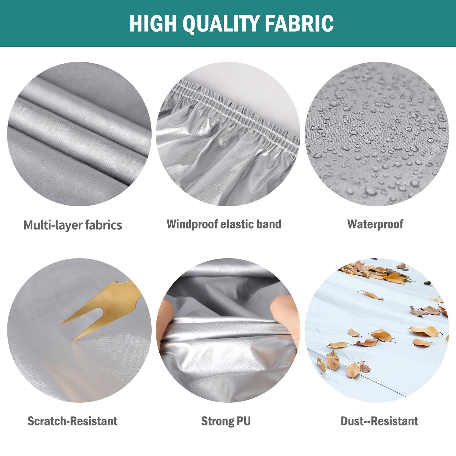 【High-Quality Material】Migaven car covers for automobiles is made of high-density coated taffeta material with a multi-layer structure design. The outermost high-reflective aluminum layer can block 99.95% of ultraviolet rays (UPF 50+), the middle layer can withstand 2500mm water pressure, and it is 100% waterproof. The coated taffeta is lightweight and more sturdy, and it can be easily put on and removed in less than a minute.
