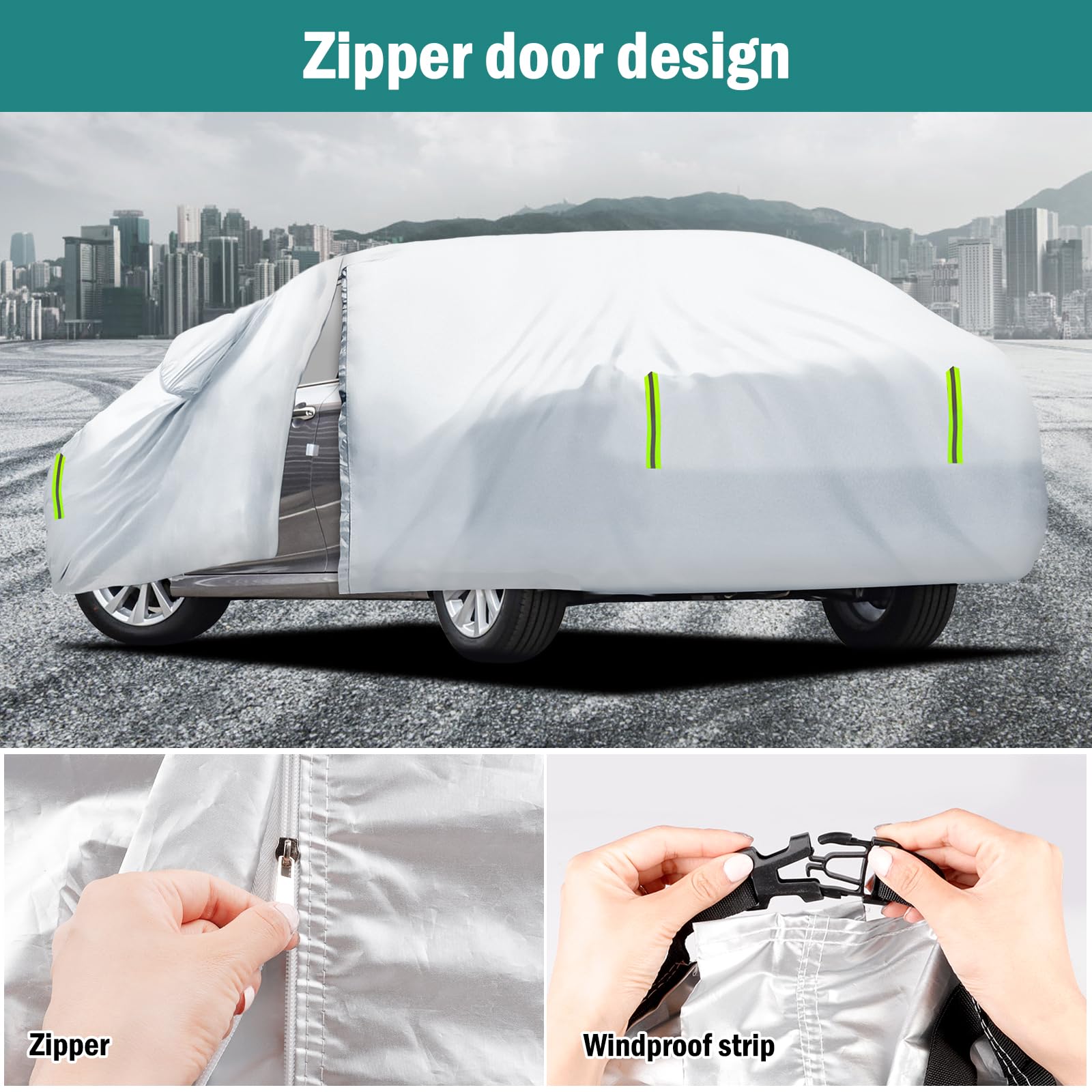 【Safety and Convenience Design】 ① The driver's position of the Migaven full exterior covers has a zipper, which allows you to enter the car at any time to retrieve items without removing the cover. ② Equipped with six reflective stripes, the full-coverage reflective stripes remind others at night to ensure parking safety. ③ The cover is equipped with a mirror pocket to protect your mirrors perfectly and avoid damage. ④ It comes with a storage bag for easy placement.