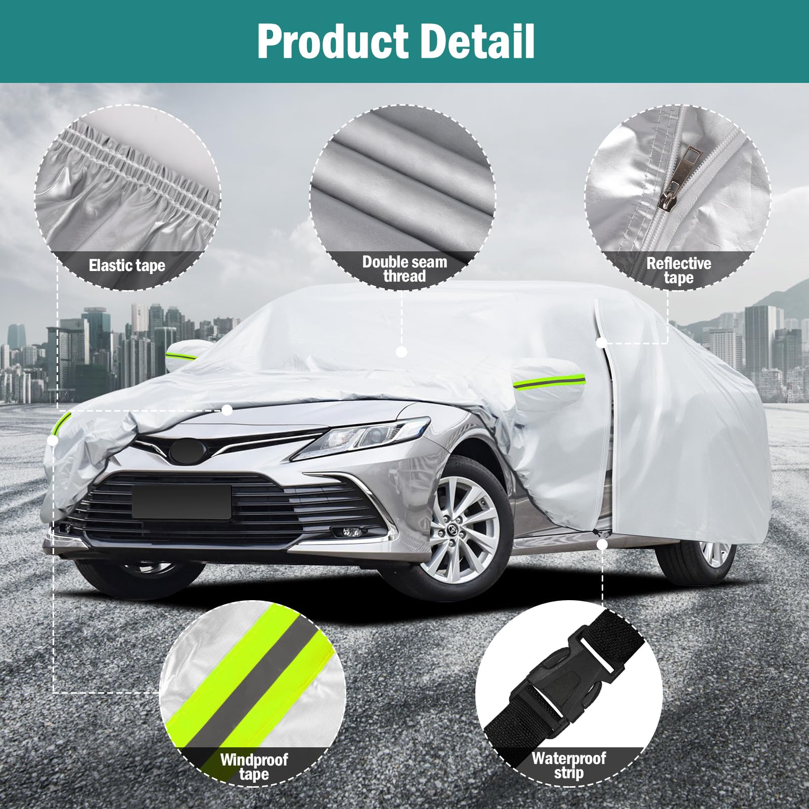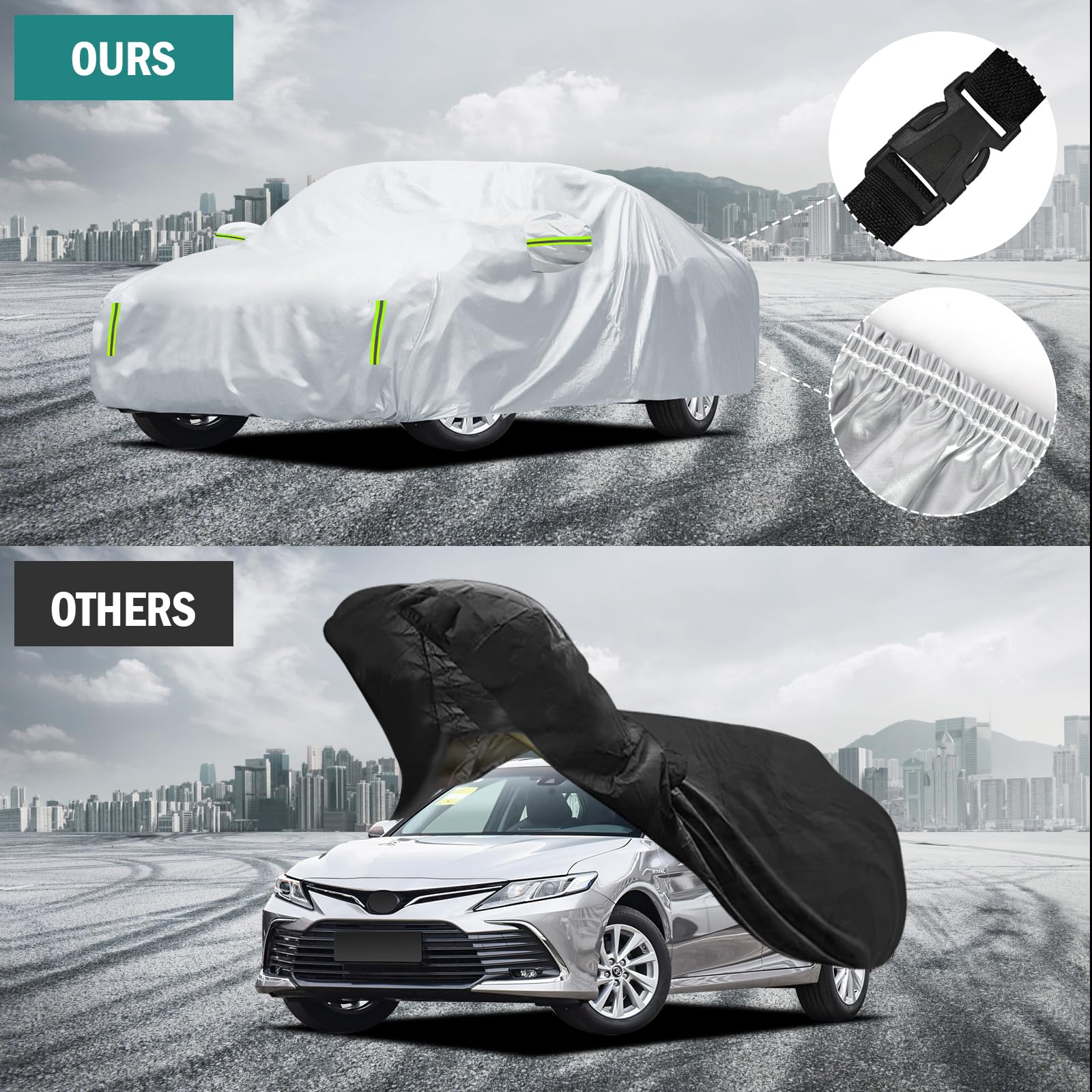【Wind-Resistant Design】The car cover waterproof all weather has been specially designed to resist strong winds. (1) It features three specially designed windproof straps that can be threaded through the bottom of the vehicle and fastened with buckles, ensuring the car cover stays secure against wind lift. (2) The adjustable elastic hem makes it easy to adjust the size and fix the cover to the car body.