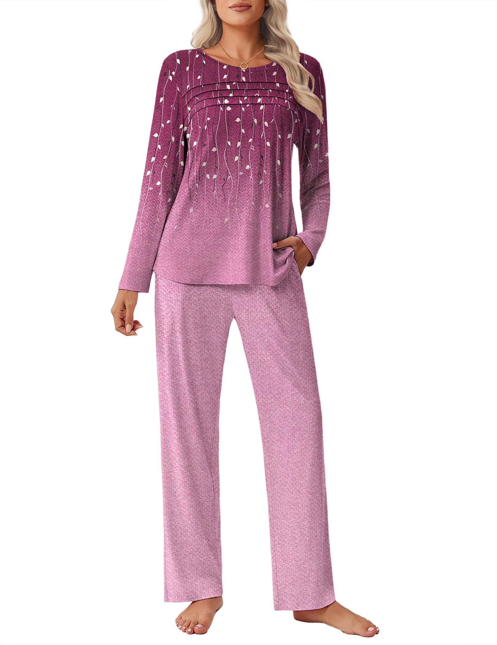 Flattering Loose Fit Design – The relaxed silhouette and wide-leg trousers of long sleeve pajama set for women provide freedom of movement and style, making it perfect for home lounging, casual errands, or even working from home
