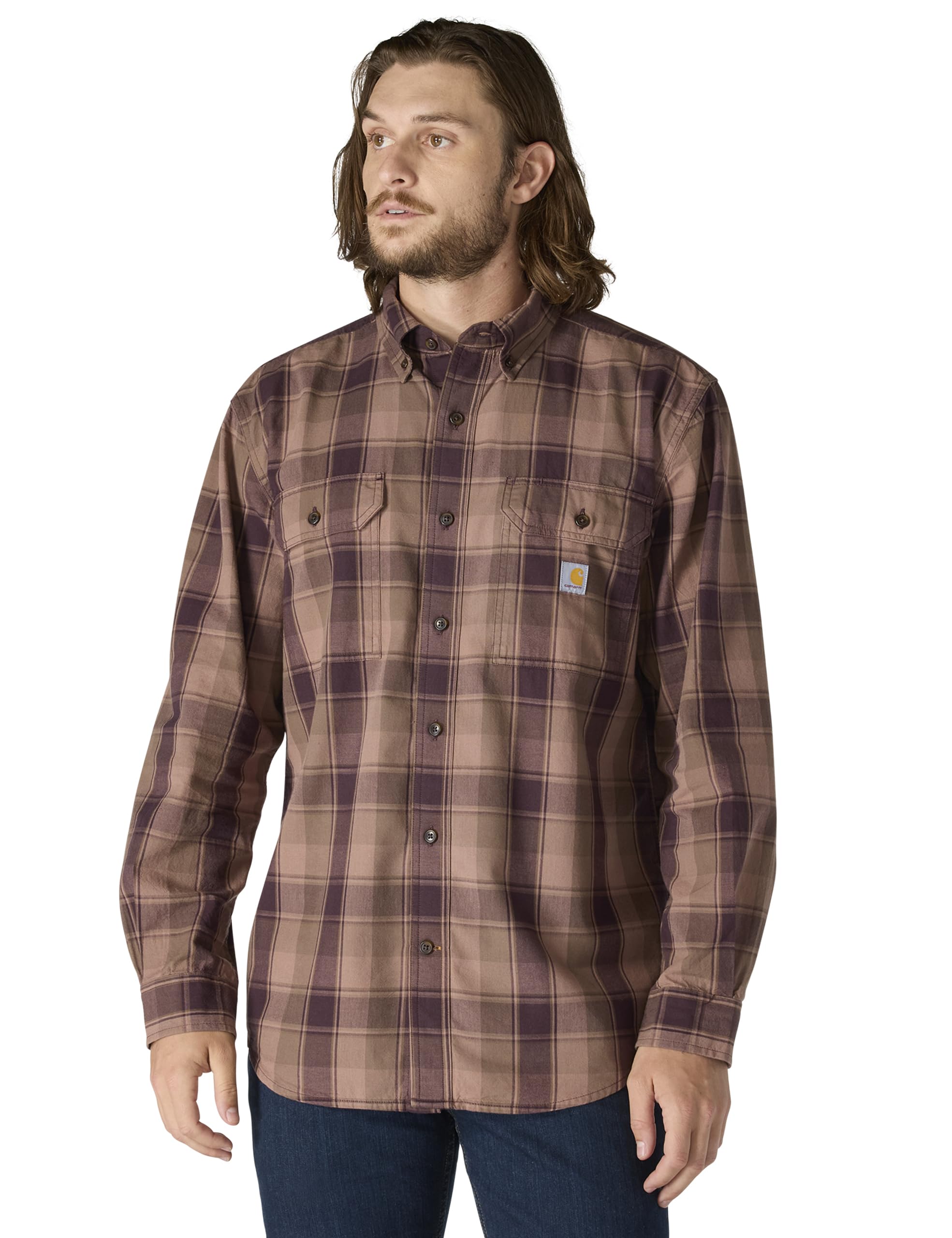 Description Made to be worn tucked or untucked, this men's Carhartt flannel shirt features a midweight cotton blend with just the right amount of stretch for an unrestricted range of motion. A loose fit allows for easy layering and a natural range of motion.