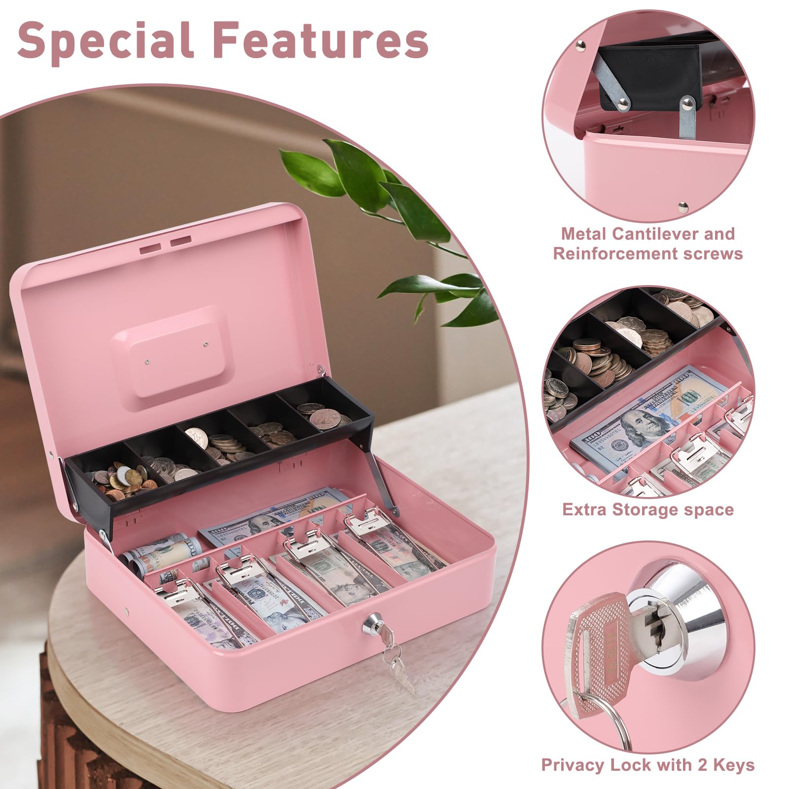 PETTY CASH BOX: This lock boxes is constructed of durable steel which is solidly built and won't simply burst open if dropped.For indoor and outdoor use. Such as School, Supermarket, Storage Lockers, Cabinets, Family, Yard Sale and so on. Suitable to store bills, coins, checks and receipts