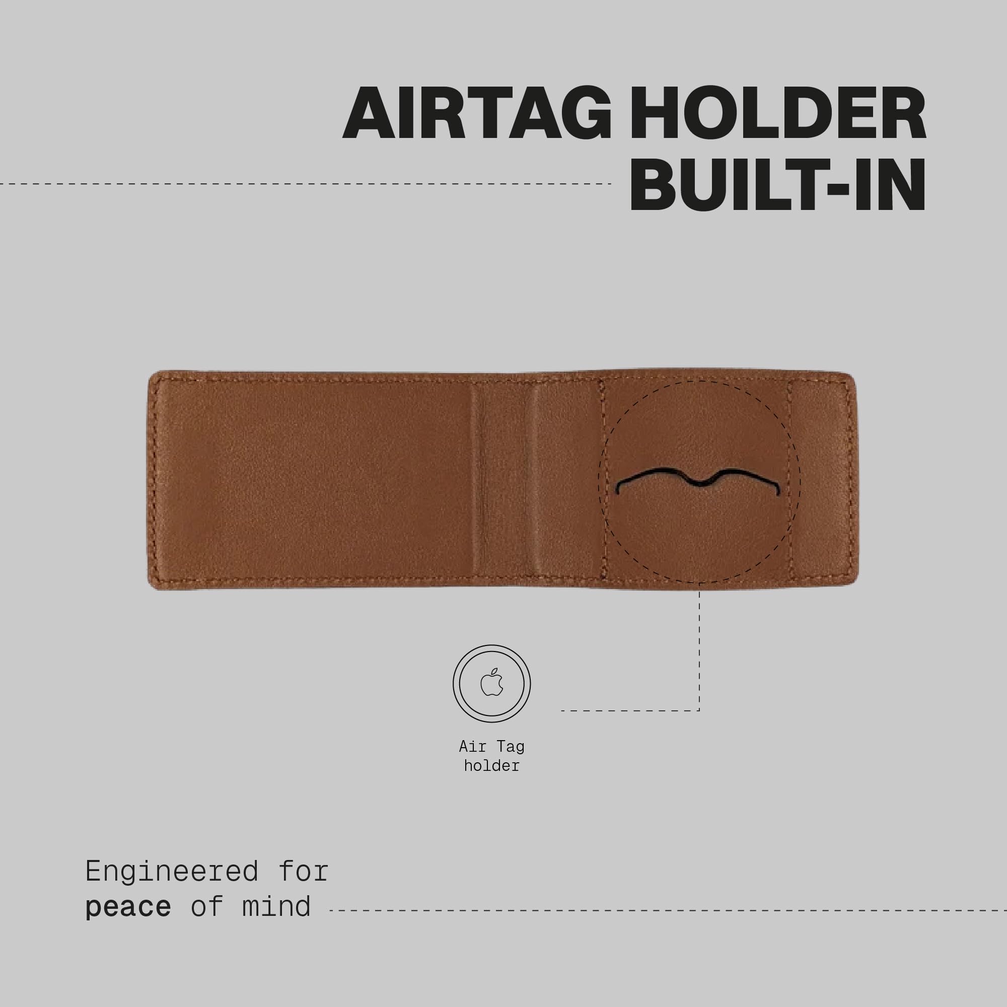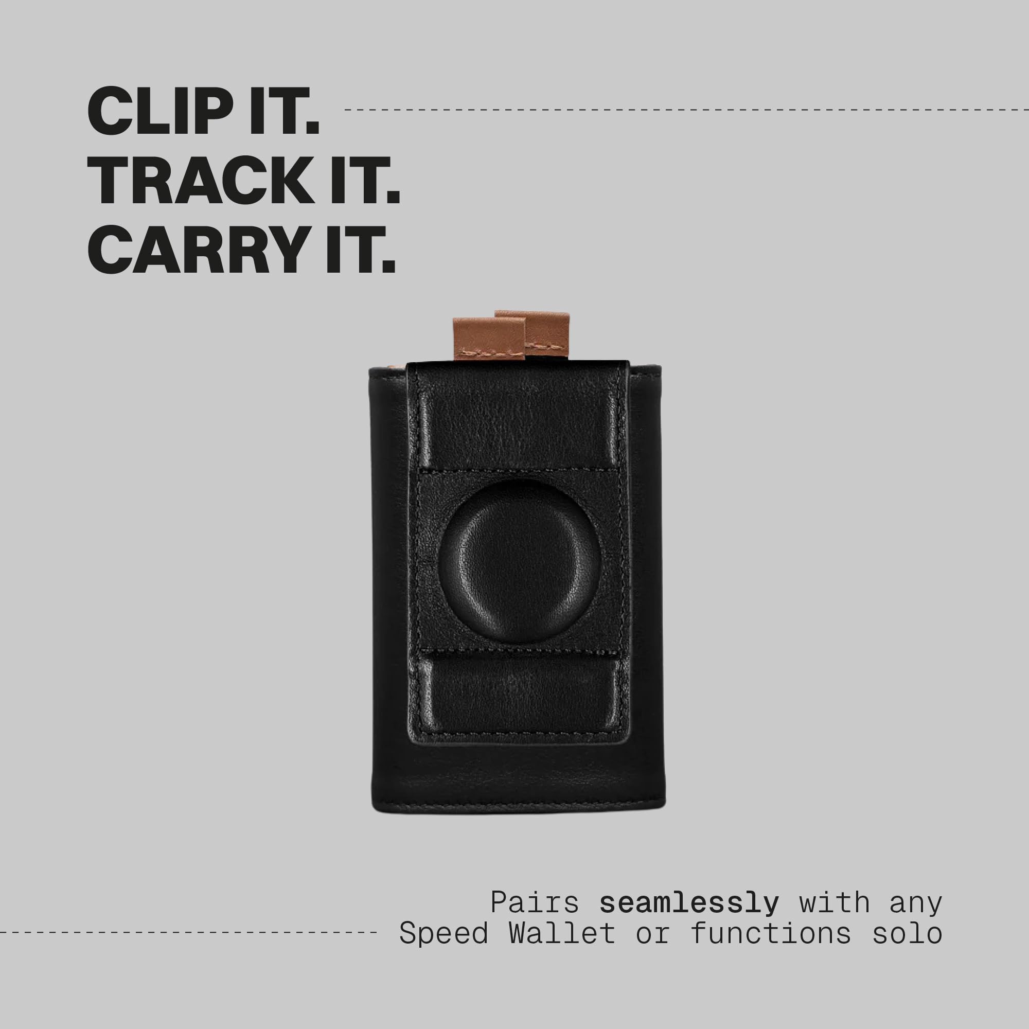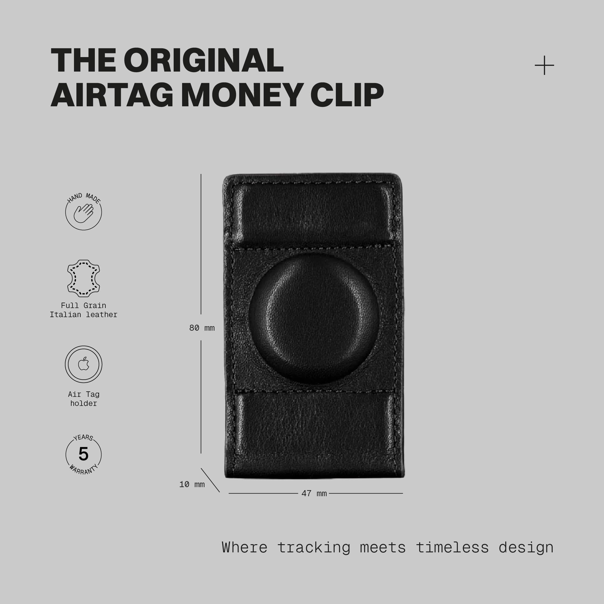 Dedicated Apple AirTag pocket securely houses a standard AirTag for use with the Find My network, providing discreet location tracking of your wallet or clip while preserving a slim carry profile