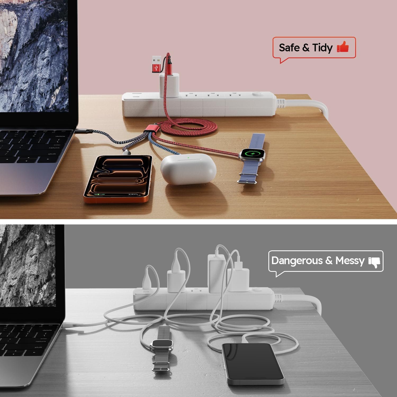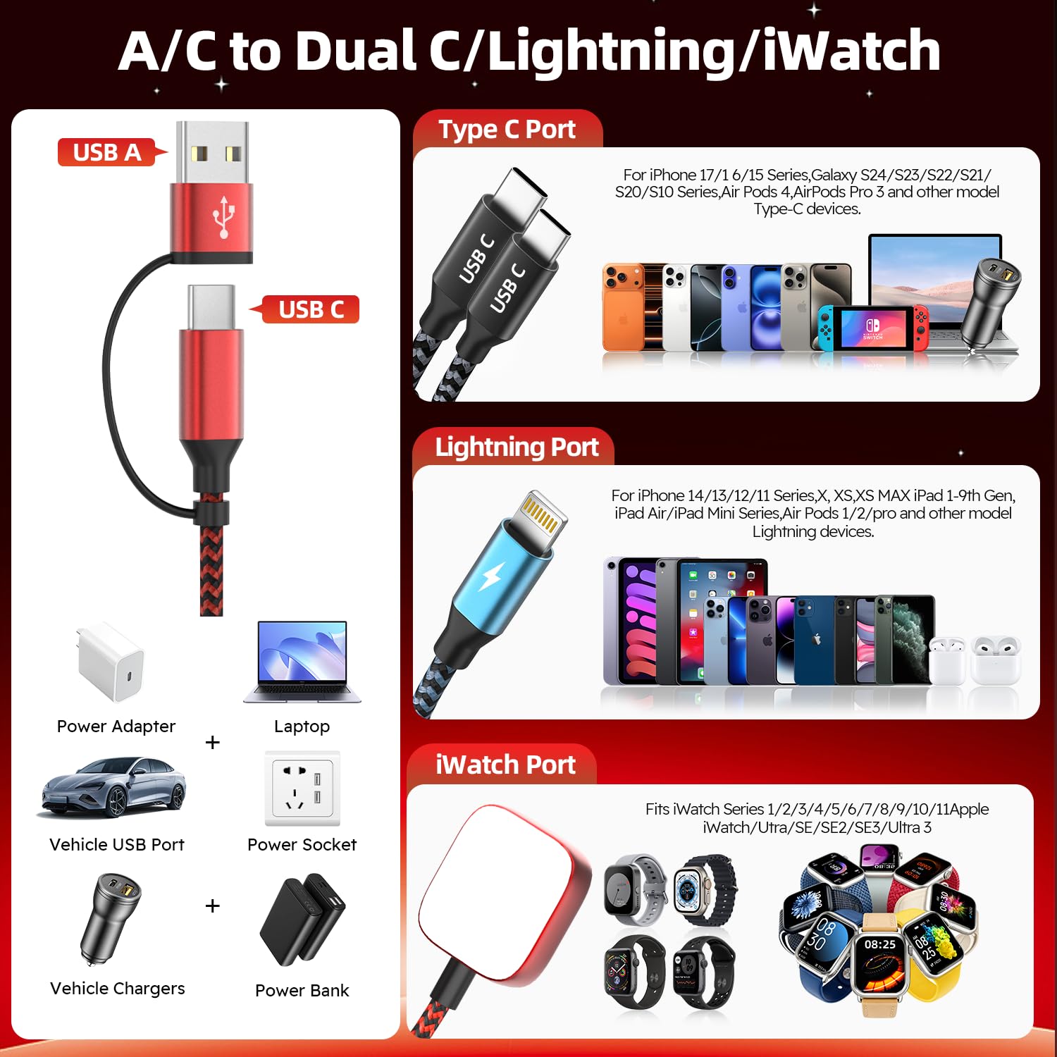 [4 in 2 Multi Charging Cable]:4 in 2 Multi Charging Cable offers 8 charging options(USB-C/A to iWatch Charger, USB-C/A to L port, USB-C/A to Dual Type C )Compatible with all iWatch Ultra 3/Ultra 2/Ultra/SE 3/SE 2/SE/Series 11/10/9/8/7/6/5/4/3/2/1. the L port is compatible with iPhone14/13/12/Pro/Max. the USB C port is compatible with iPhone 17 16 15 Pro Max Plus/Pods 4/Pro 2, Galaxy S26/S26+/S26 Ultra/S25/S25+/S25 Ultra/S24/S23/S22/S21/S20【Please Note: Not for Laptop】
