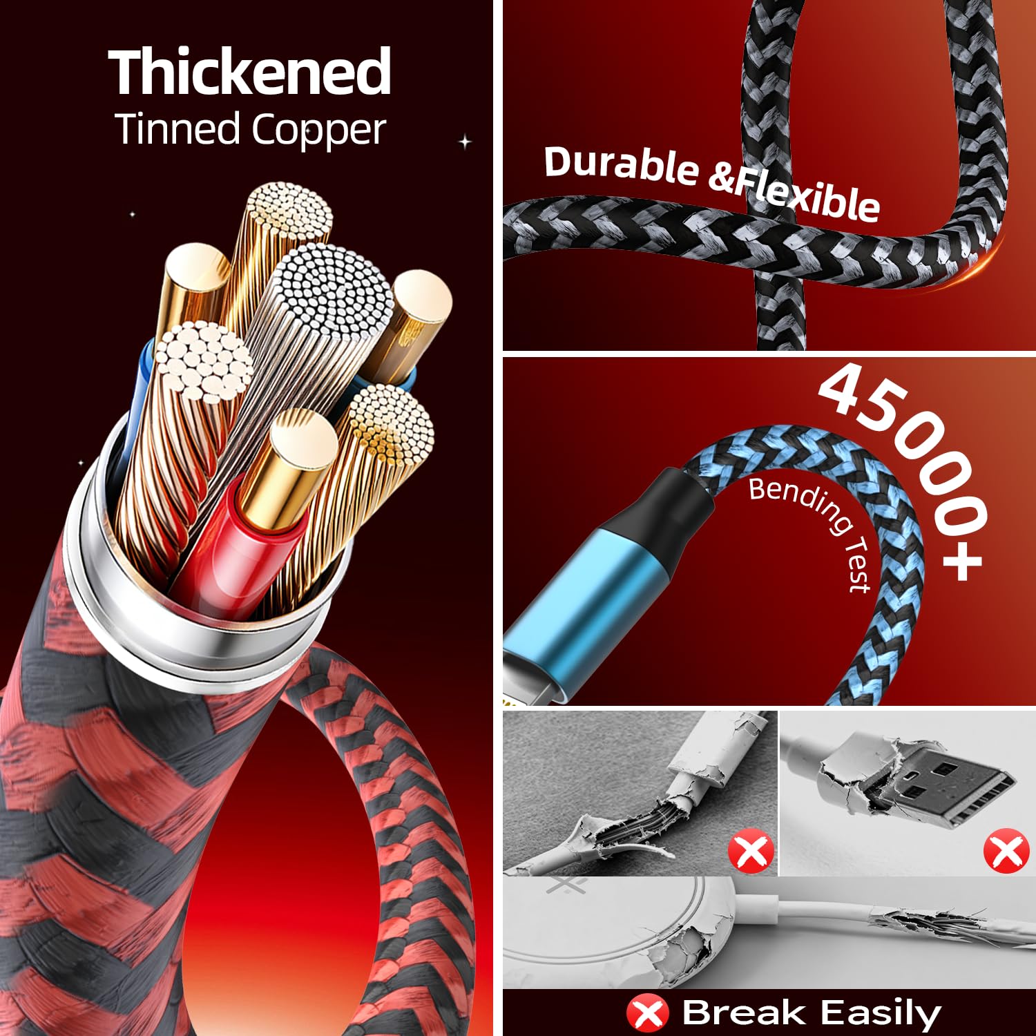 [High Quality Materials]:With sandblasted aluminum housing and one-piece plug tested to 40,000+ insertion and removal cycles. The military-grade nylon-braided cable with special stress relief design can withstand 40000+ Bending test. The tinned copper material has better corrosion and oxidation resistance, which ensures stable charging effect and prolongs the life of the charging cords for multiple devices. Upgraded laser welding technology ensures that the plug will not come off easily