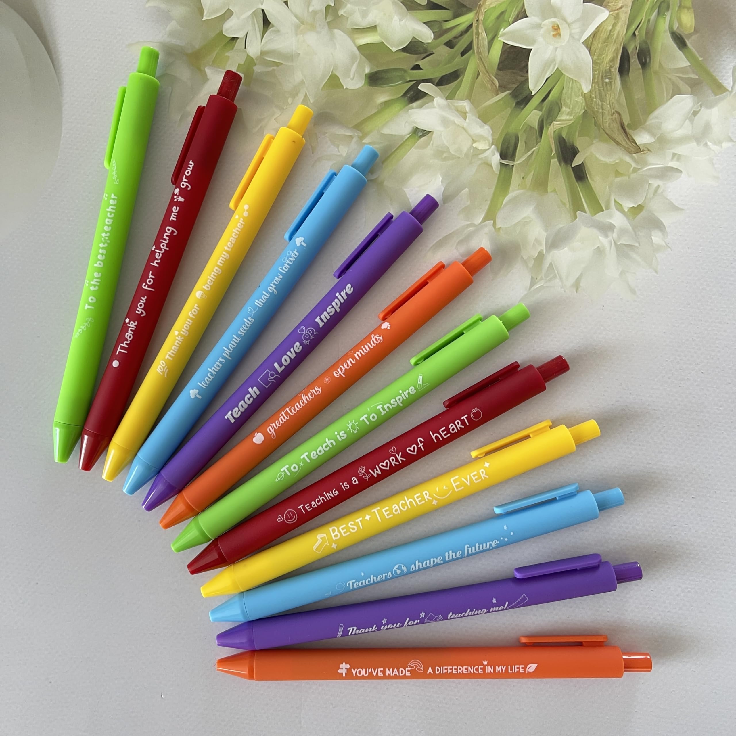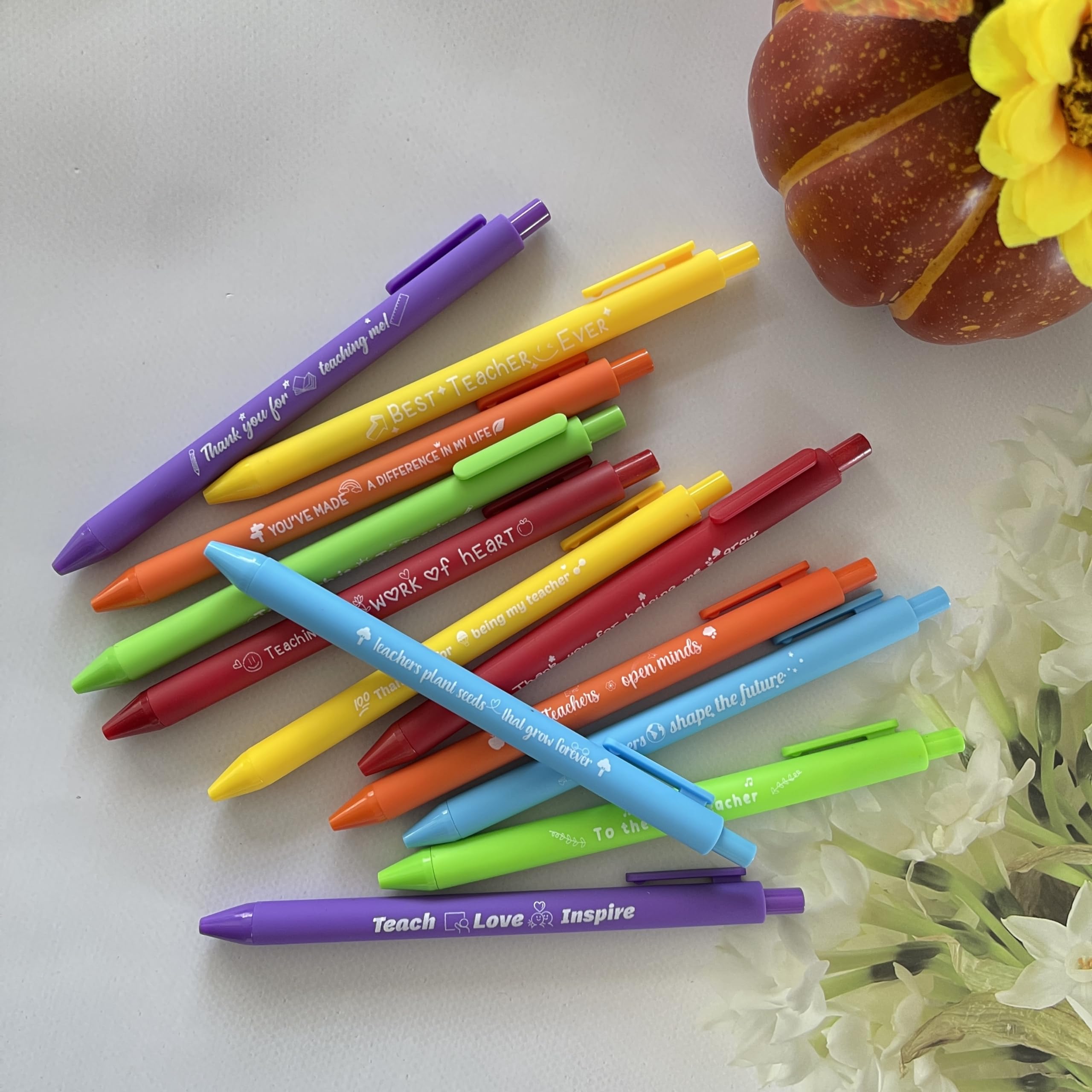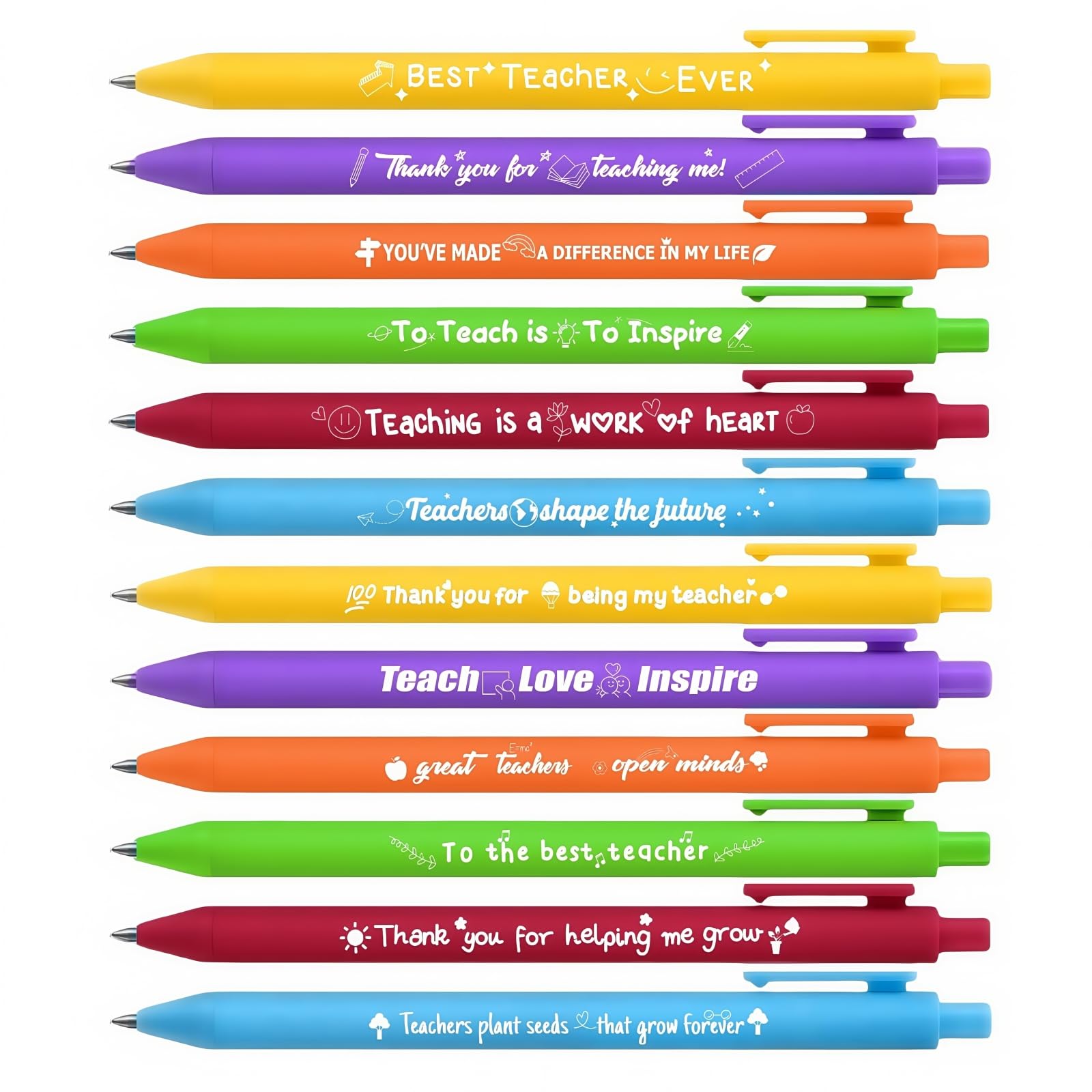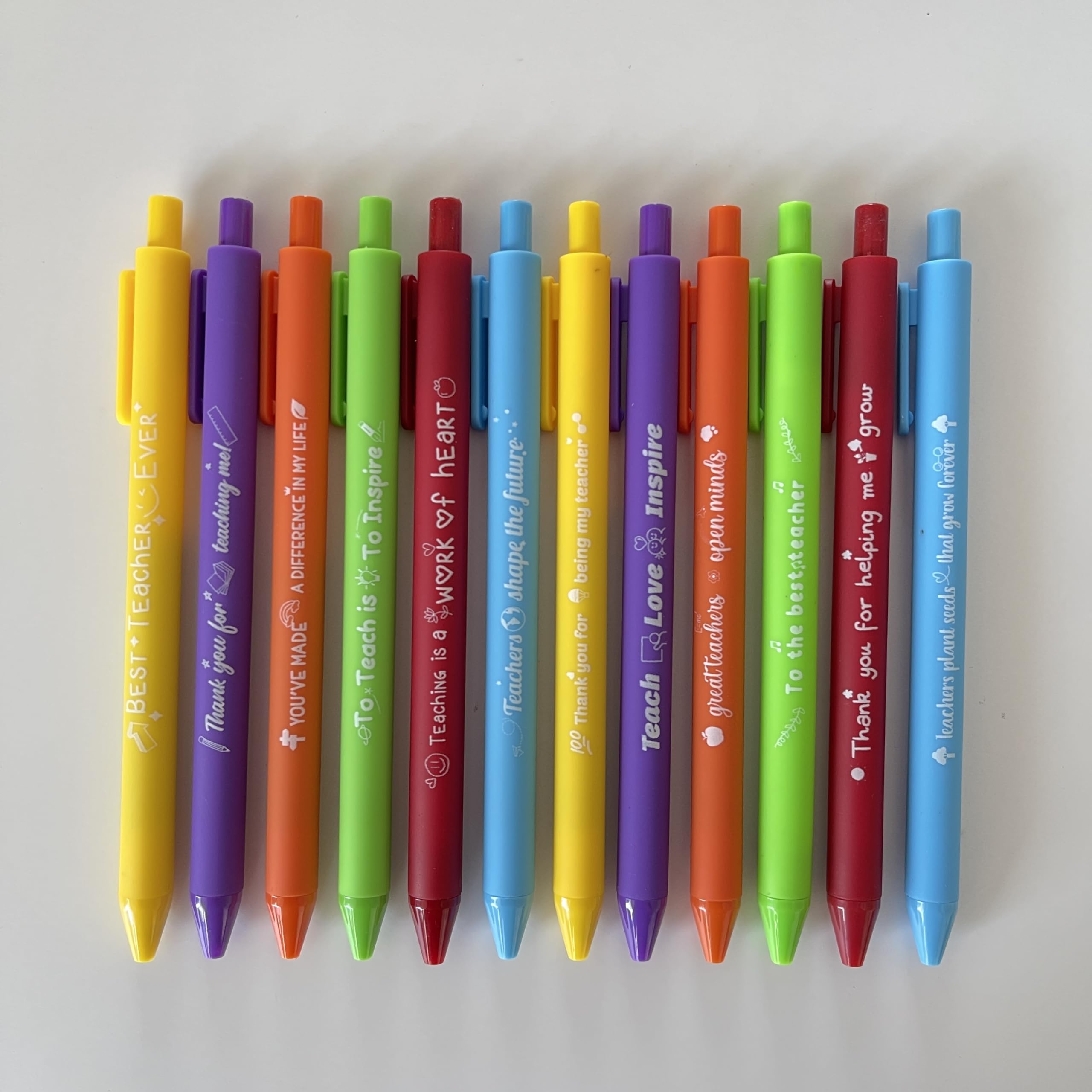 12 VIBRANT DESIGNS, 12 THANK-YOUS: Each pen features a unique teacher-themed mantra: "Best Teacher Ever," "Teach Love Inspire," and "You’ve Made a Difference". A rainbow of colors (yellow, purple, orange, green) to match any classroom vibe!