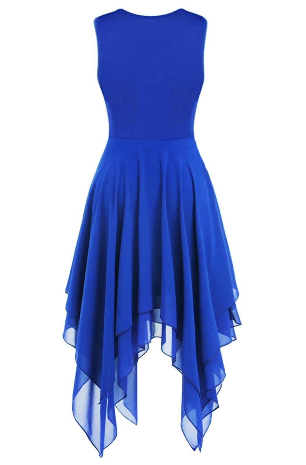 UNIQUE DESIGN: Sleeveless irregular hem ruffle chiffon praise lyrical dance dress, crew neck, pull-on closed, metallic color block patchwork, V-shaped waistline, creating a high waist effect. The bottom is a double layered chiffon irregular hem big swing flowy skirt (White may be a bit seen through), can be looks flowy and graceful when twirling or moving.