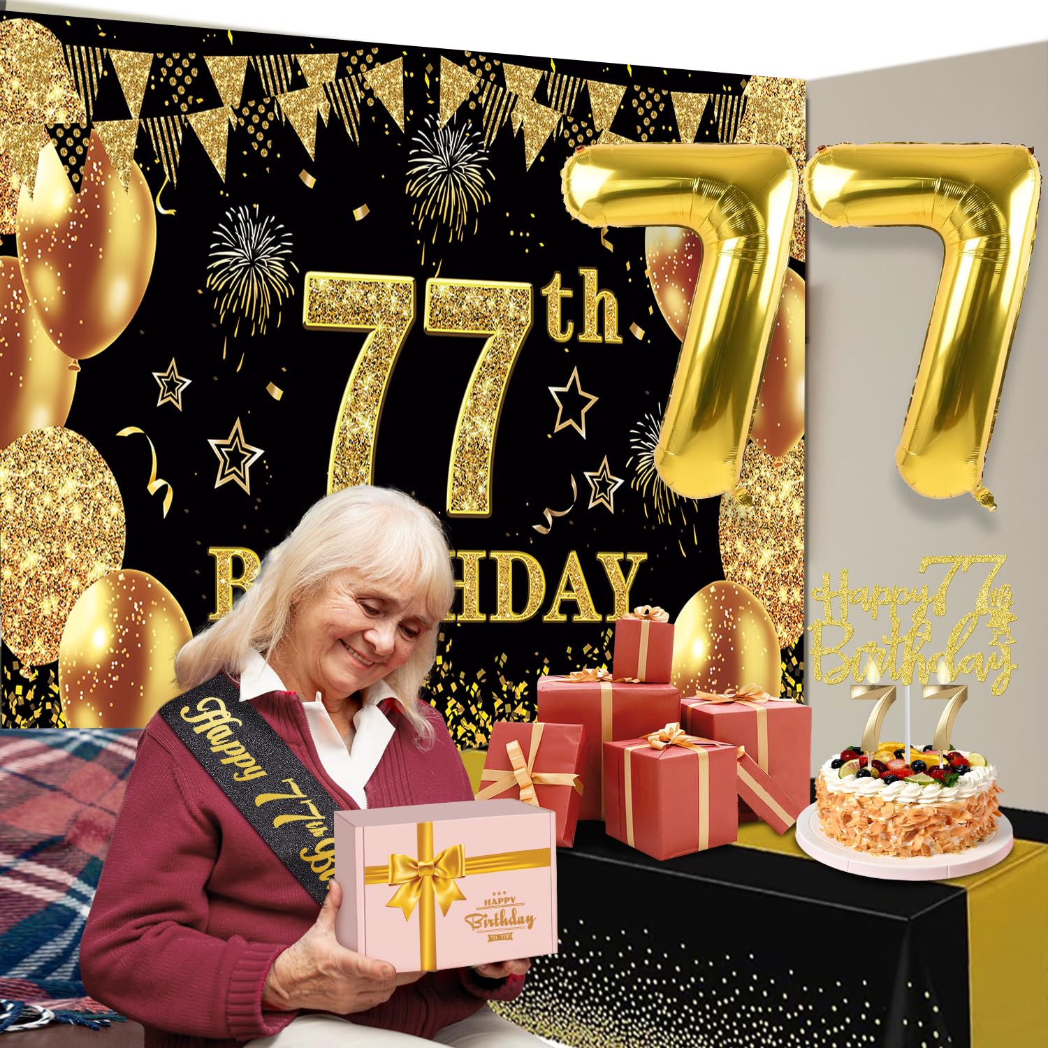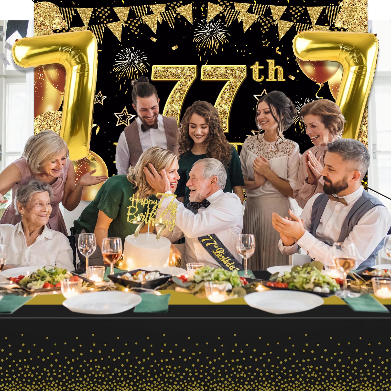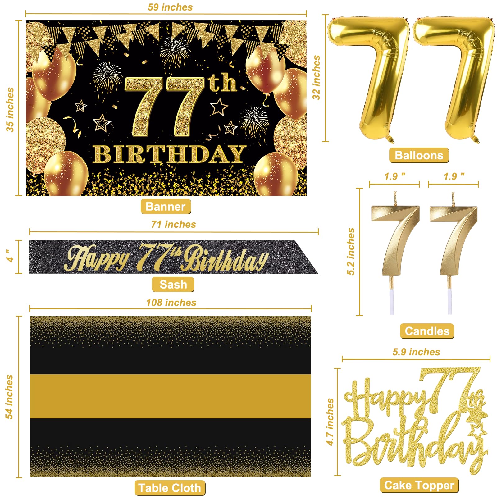 77th Birthday Decorations Kit: Packing Coming with Large 77th Birthday Banner x 1pc, Big Gold 77th Birthday Balloons x 1set, Black and Gold Table Cloth x 1pc, Black Glittery with Gold Foil Words Happy 77th Birthday Sash x 1pc, 77th Happy Birthday Cake Topper x 1pc, Gold Number 77 Candles x 1set. This Value Black and Gold Party Decorations Set Meet Your Every Needs and Expects in 77th Birthday Milestone