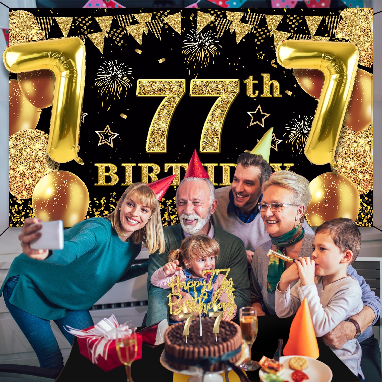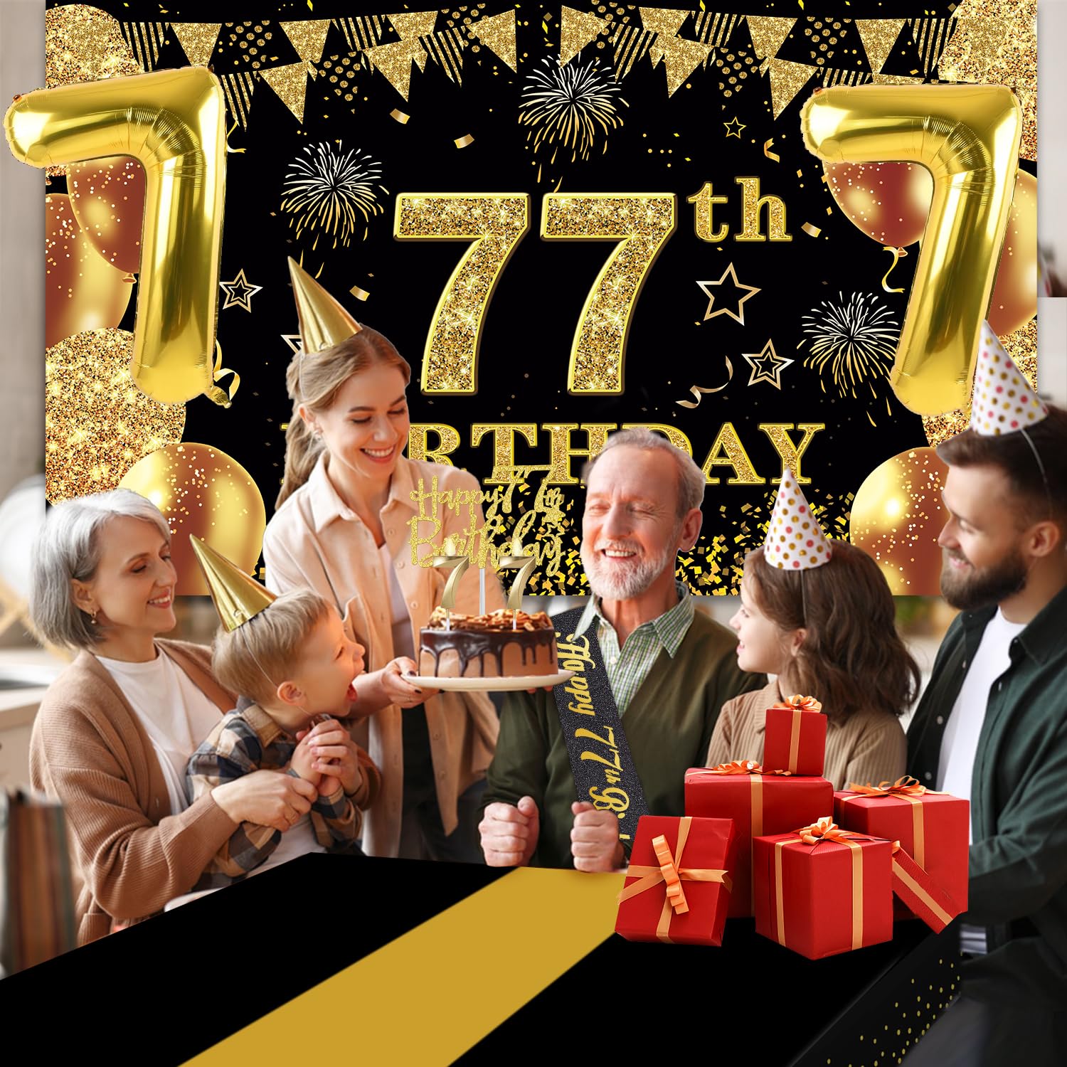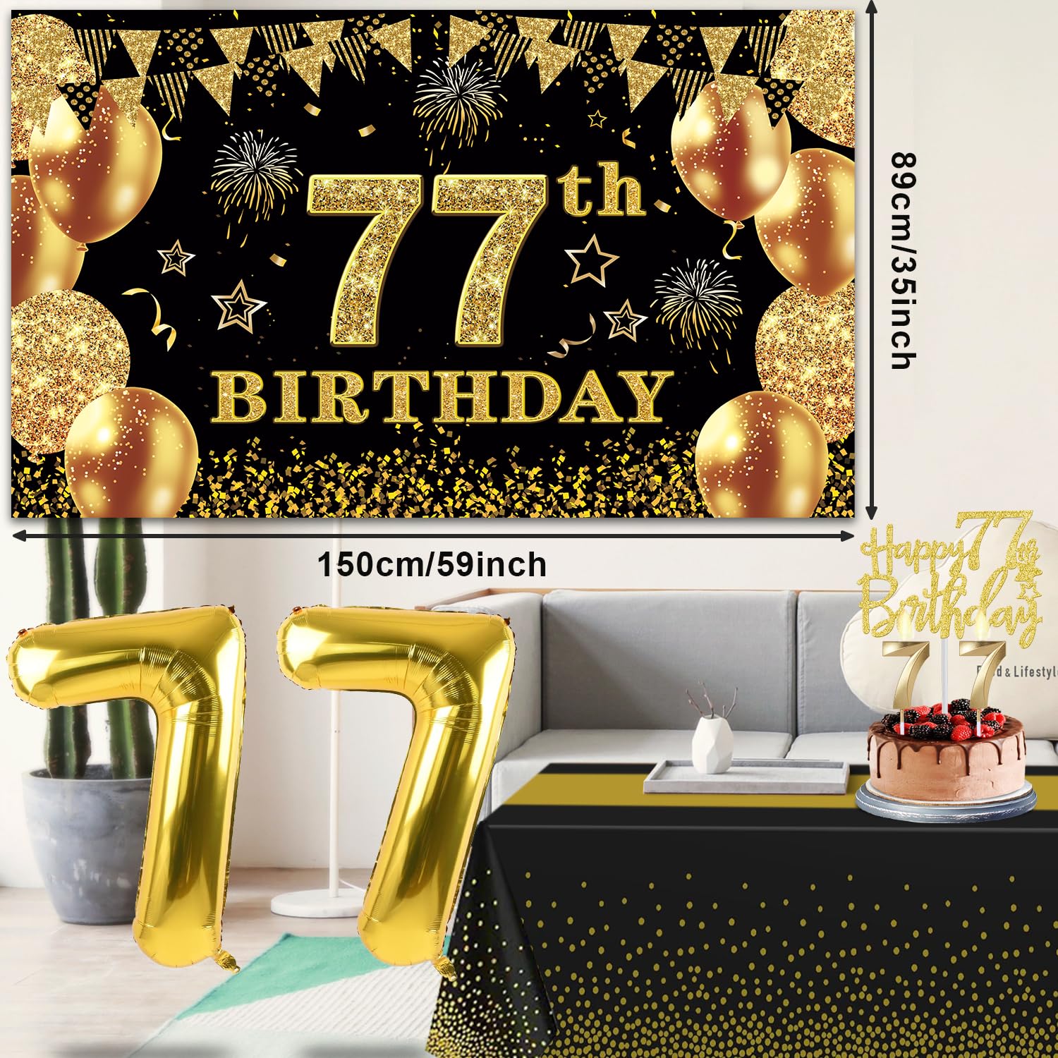 77th Birthday Decorations Kit: Packing Coming with Large 77th Birthday Banner x 1pc, Big Gold 77th Birthday Balloons x 1set, Black and Gold Table Cloth x 1pc, Black Glittery with Gold Foil Words Happy 77th Birthday Sash x 1pc, 77th Happy Birthday Cake Topper x 1pc, Gold Number 77 Candles x 1set. This Value Black and Gold Party Decorations Set Meet Your Every Needs and Expects in 77th Birthday Milestone