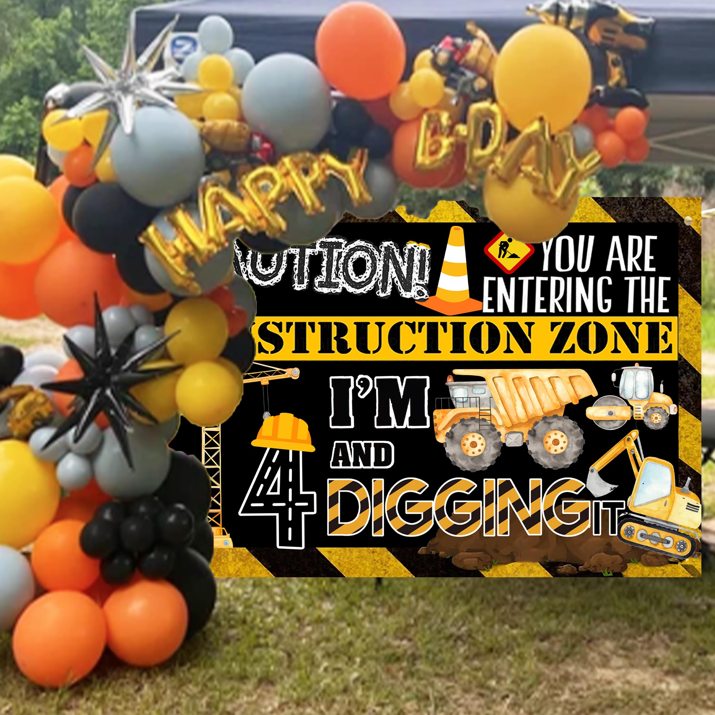 Classic black and yellow architectural theme design with patterns of construction trucks, dump trucks, excavators, construction hats, etc., eye-catching and suitable for decorating birthday parties for 2-year-old children.