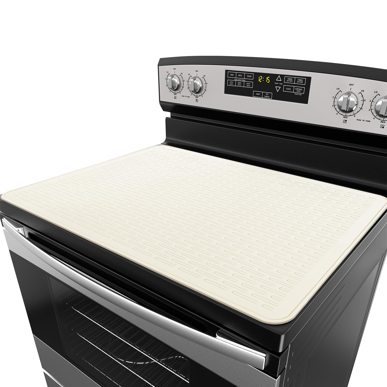 Glass Top Stove Cover:This extra large 30" x 21" inches silicone stove cover for glass top electric stove is perfect for protecting your electric stove top, kitchen counter top, electric cooktop, table, or washer-dryer top from scratches, spills, stains, scrapes, and dirt. It keeps the surface clean and tidy while providing an expandable workbench for food preparation.